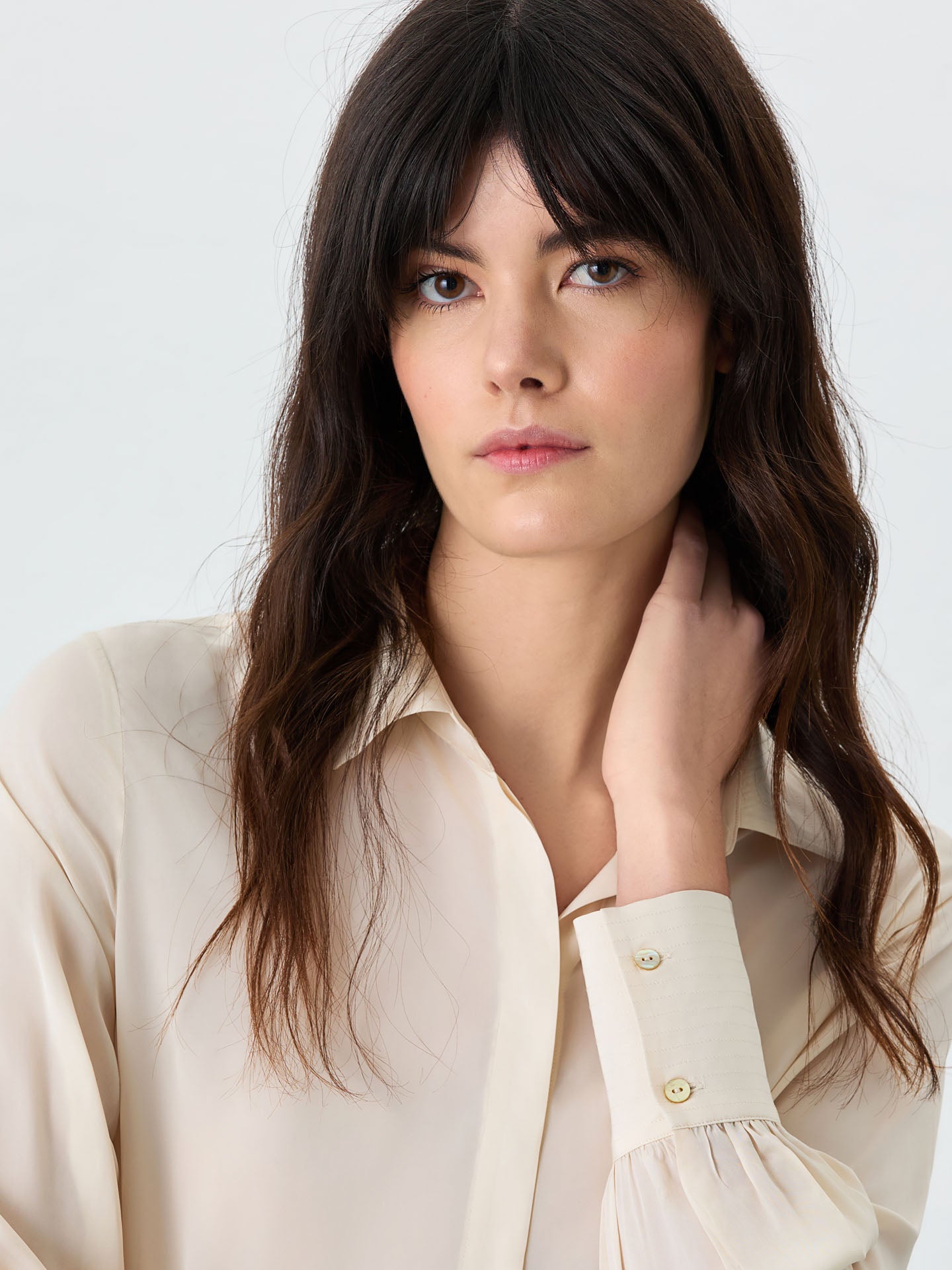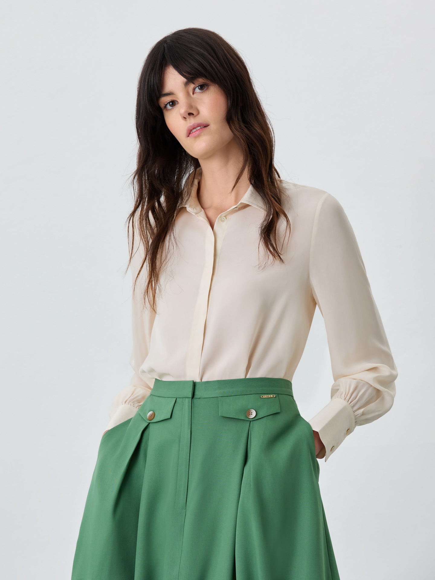 Blouse In Crepe Fabric With Top Stitched Collar and Cuffs
