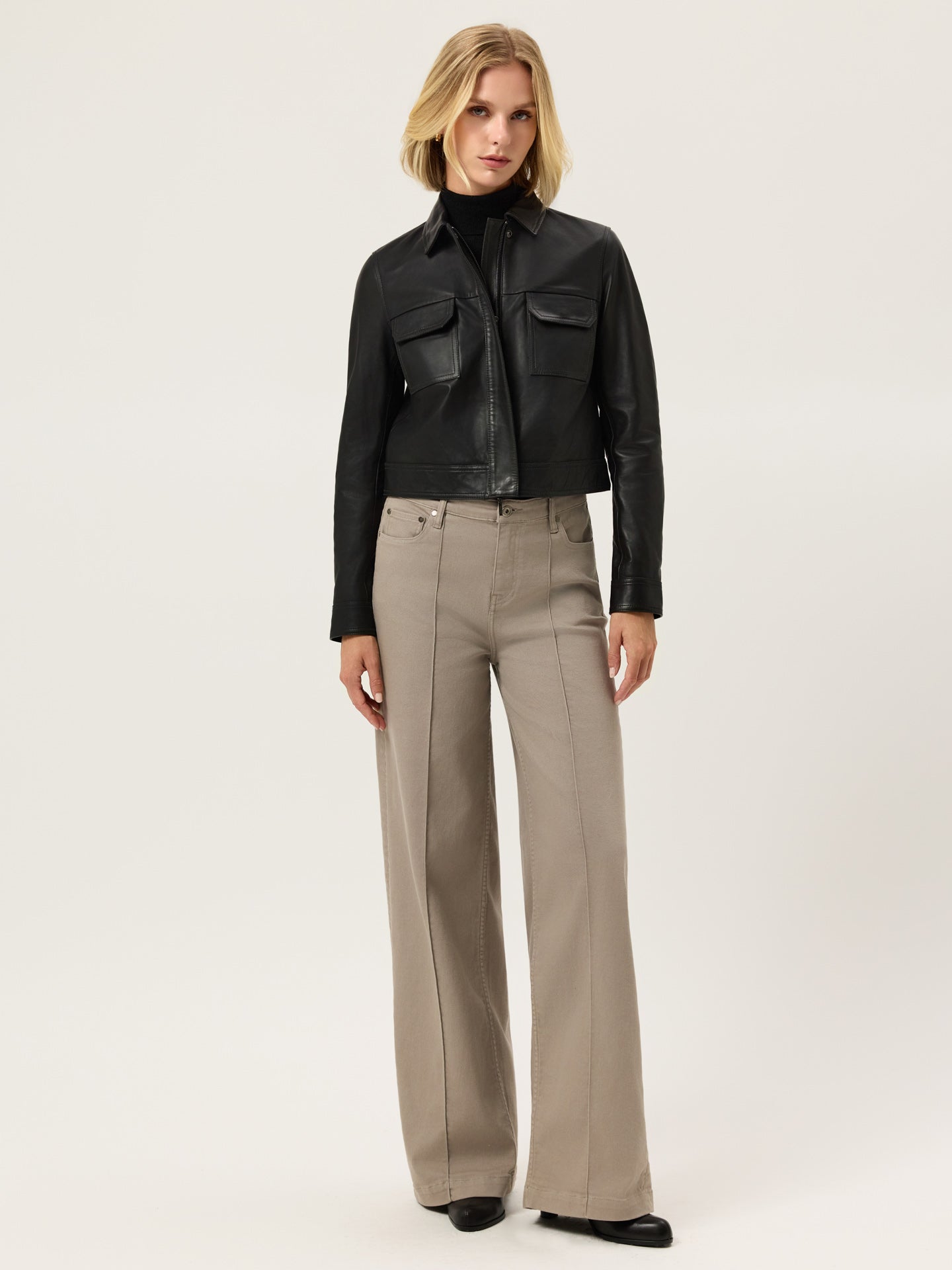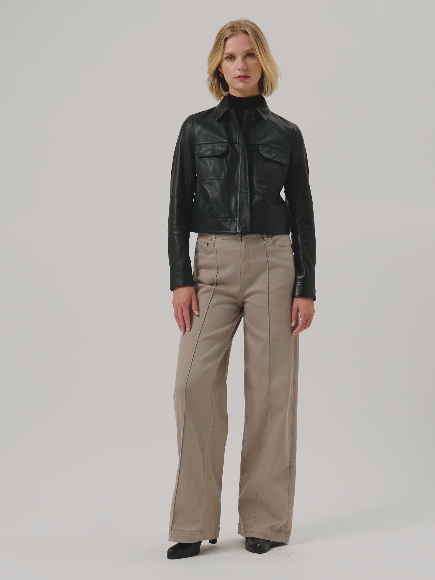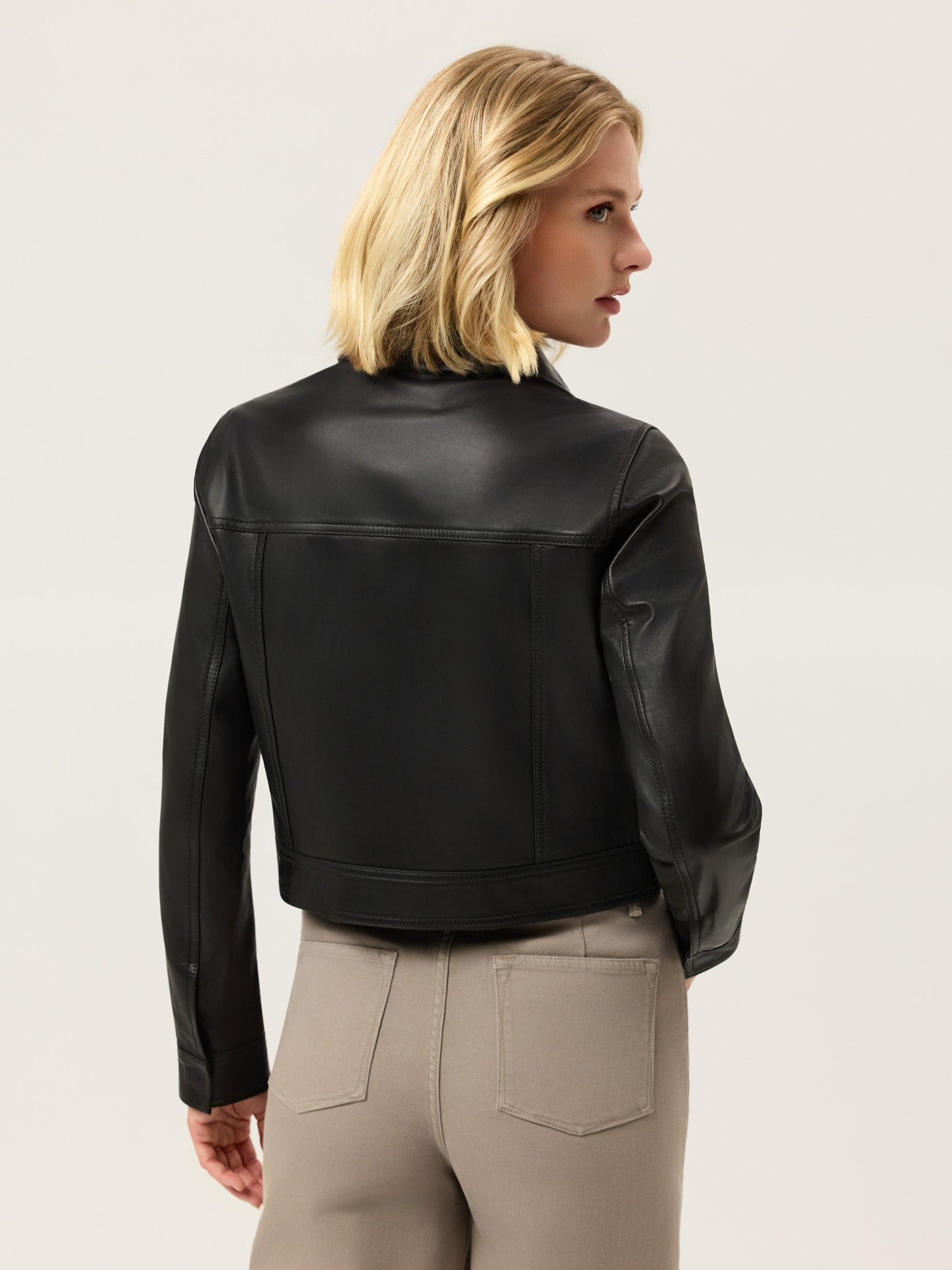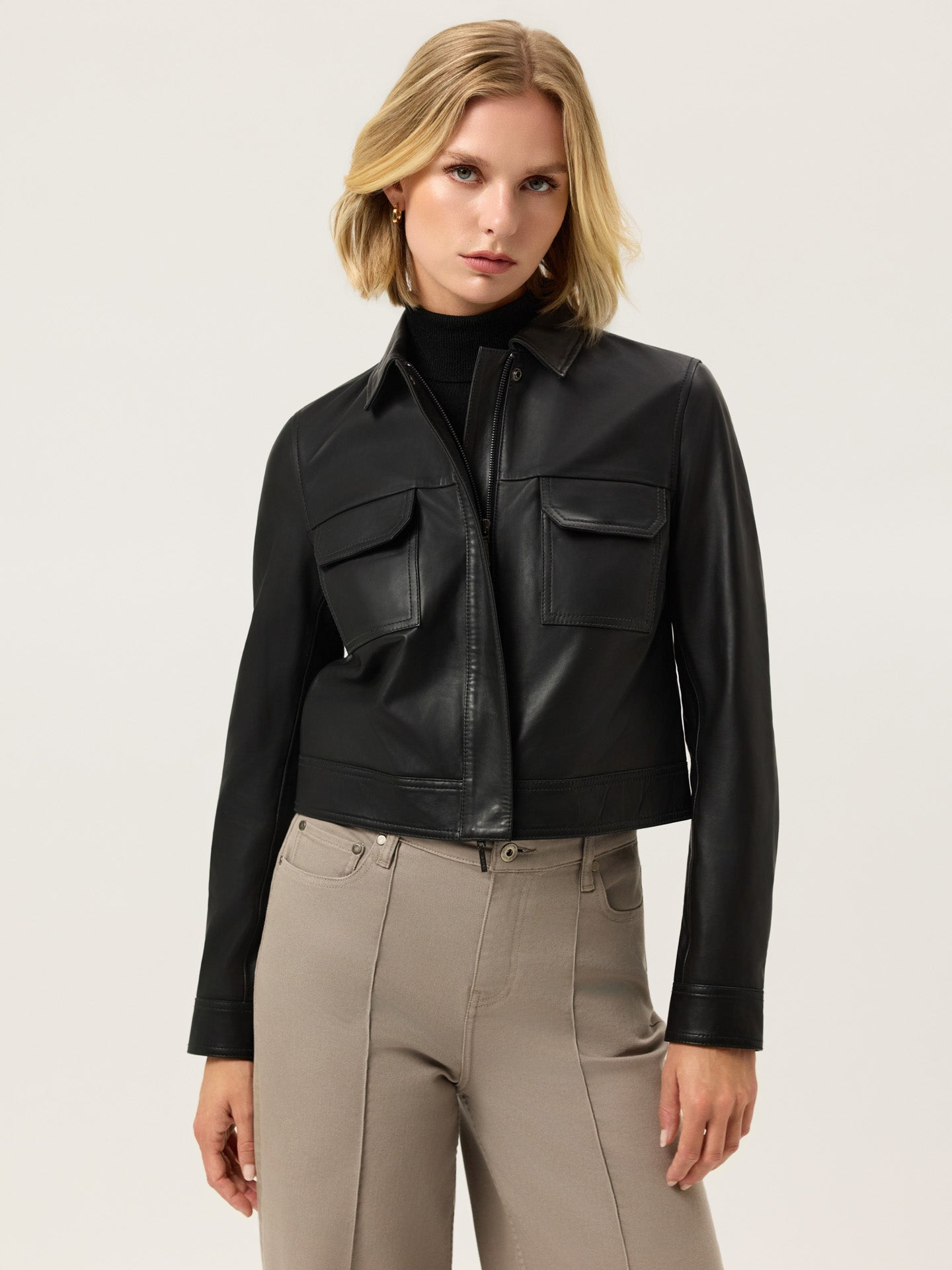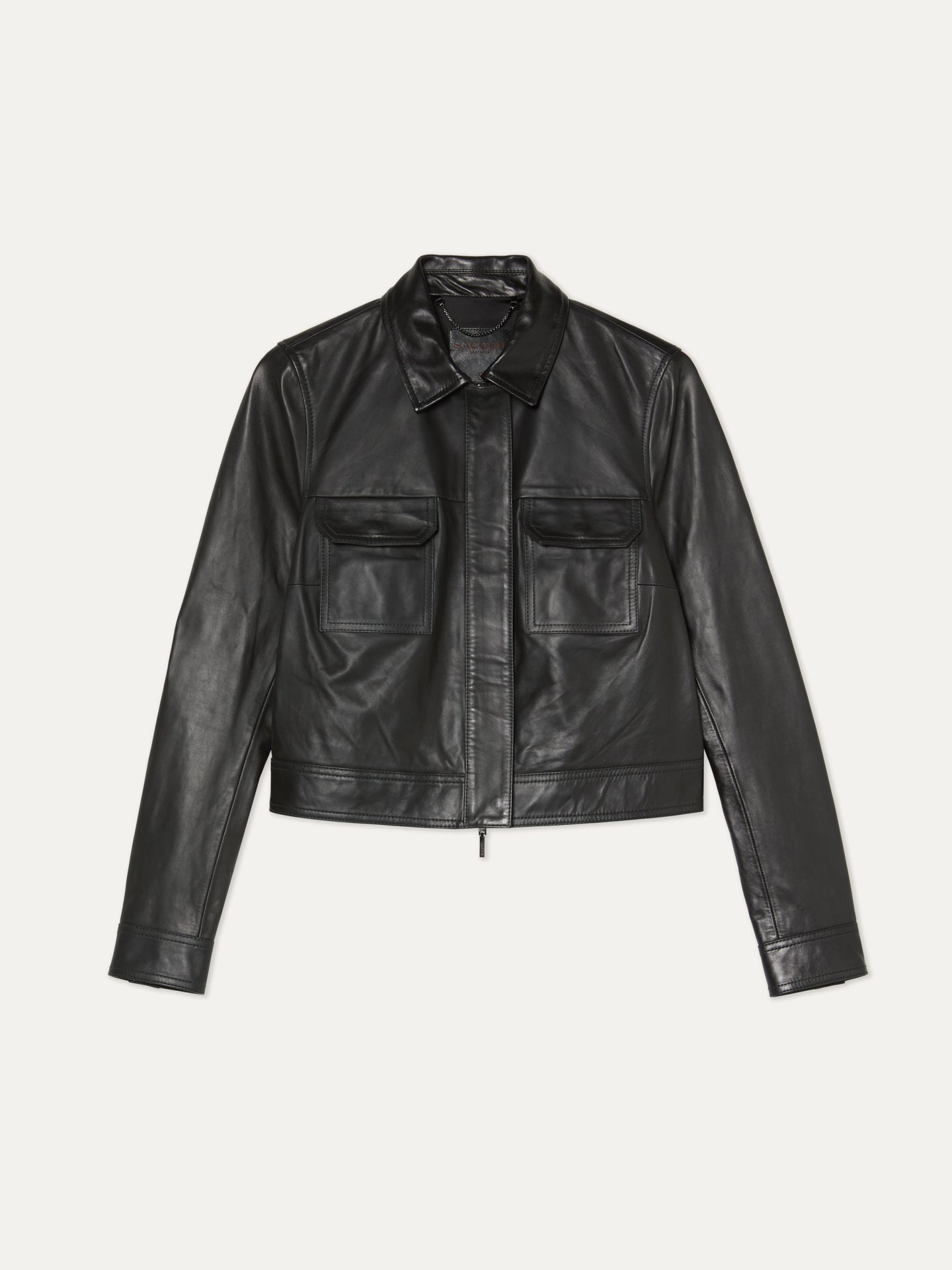 Boxy leather jacket designed with a regular fit. Features patch pockets at front, front placket with hidden zipper and snap buttons, fully lined interior and snap buttons on cuffs.