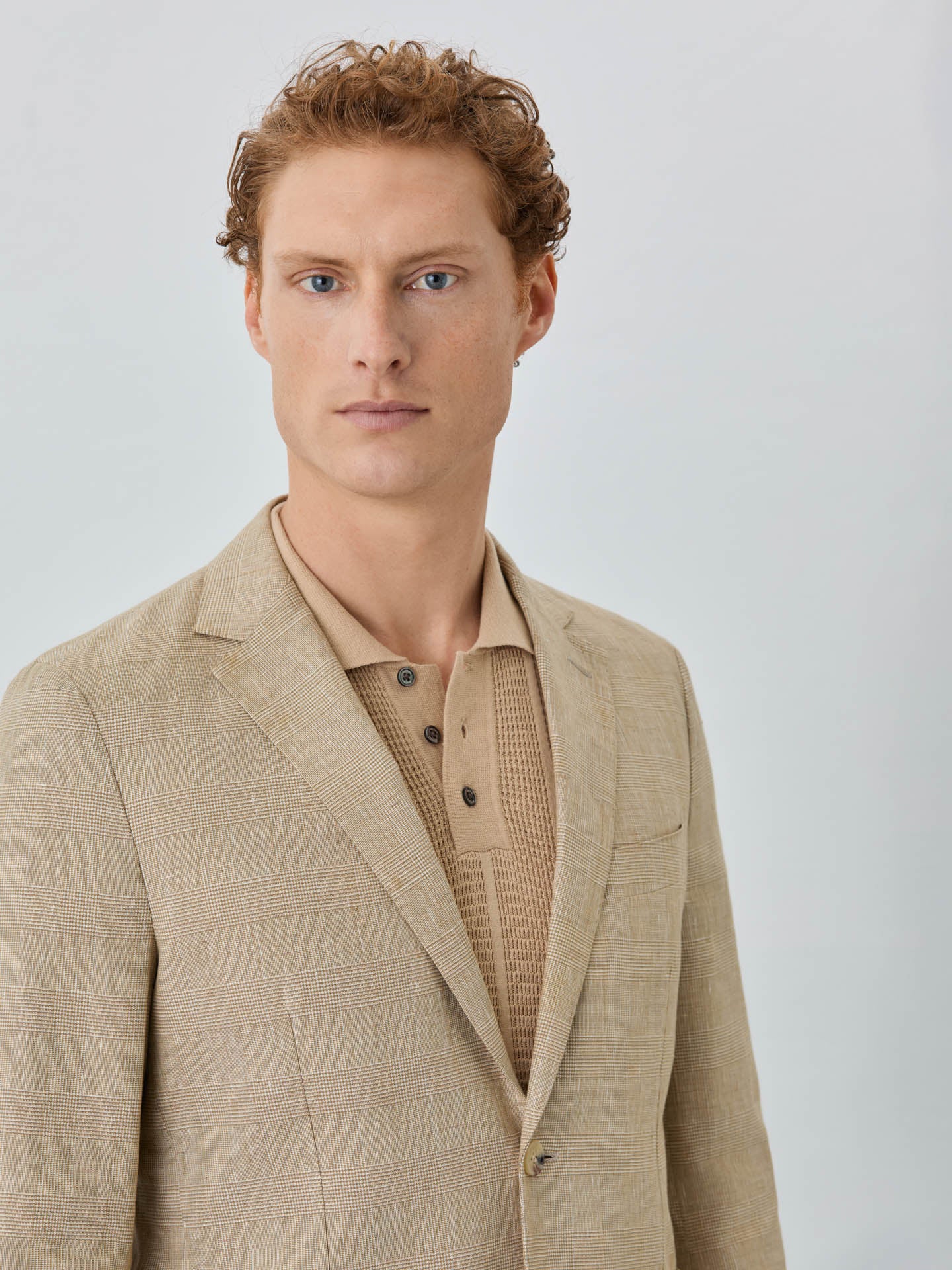 Linen Edition Half-Canvas Prince of Wales blazer, expertly tailored from 50% linen 50% cotton. Style with notch lapels, two-button closure, patch pockets and two back vents. Sleeves with four-button cuffs. Half lining enhances the blazer's structure where it matters most, ensuring comfort and allowing you to move with ease while maintaining a polished appearance. All blazers have regular fitting measures from sizes 56 to 62. This blazer cut is neat and comfortable to allow easy layering. Make a statement with the timeless charm of the glen checks pattern. This classic design adds a touch of sophistication to your ensemble, making the blazer suitable for both professional and casual settings.