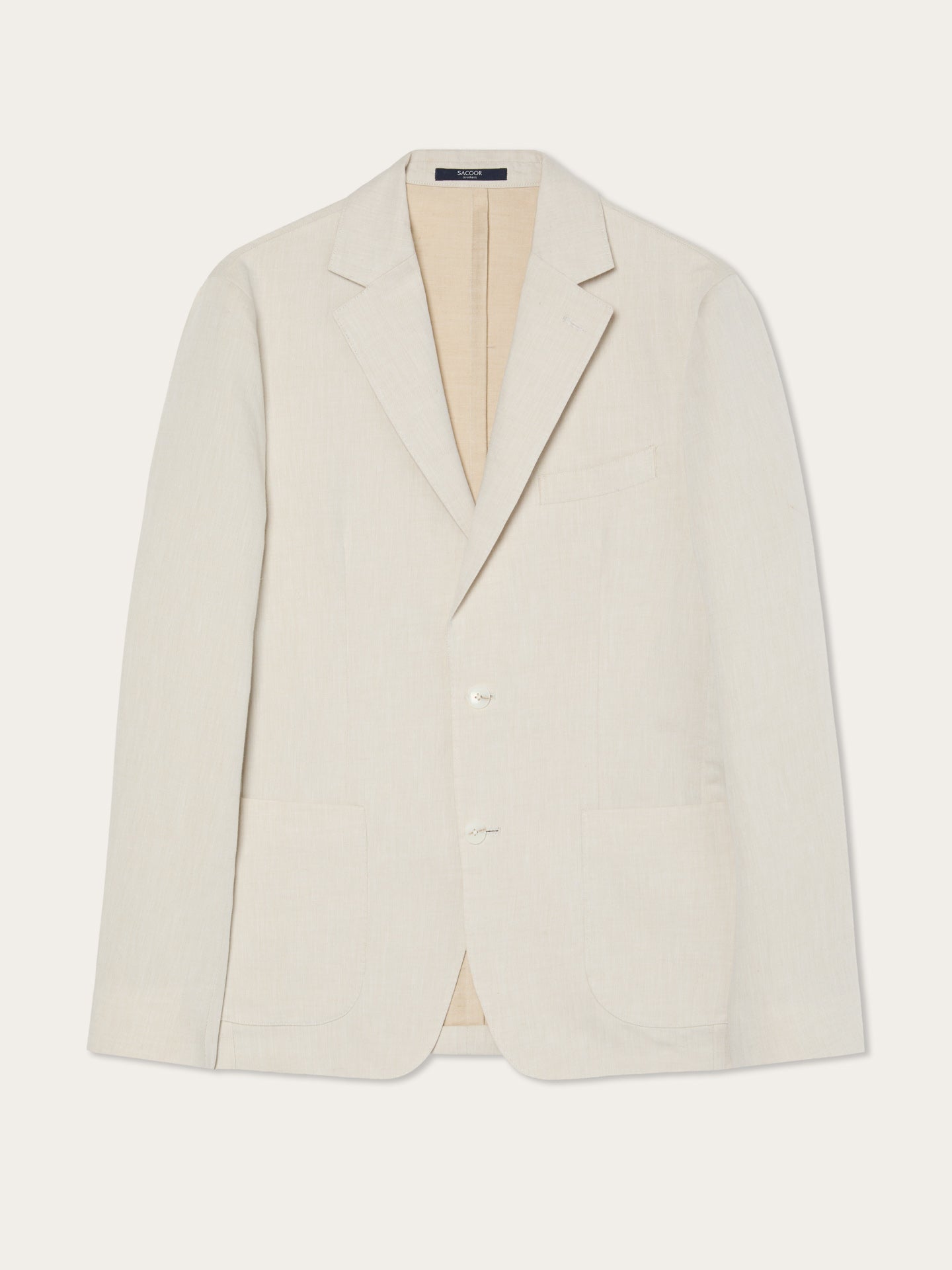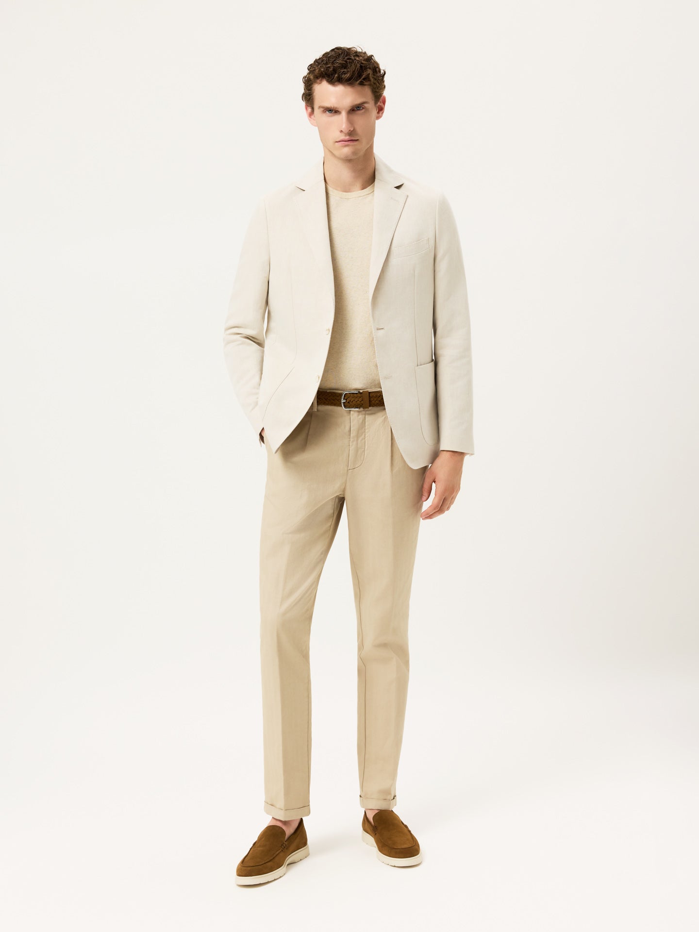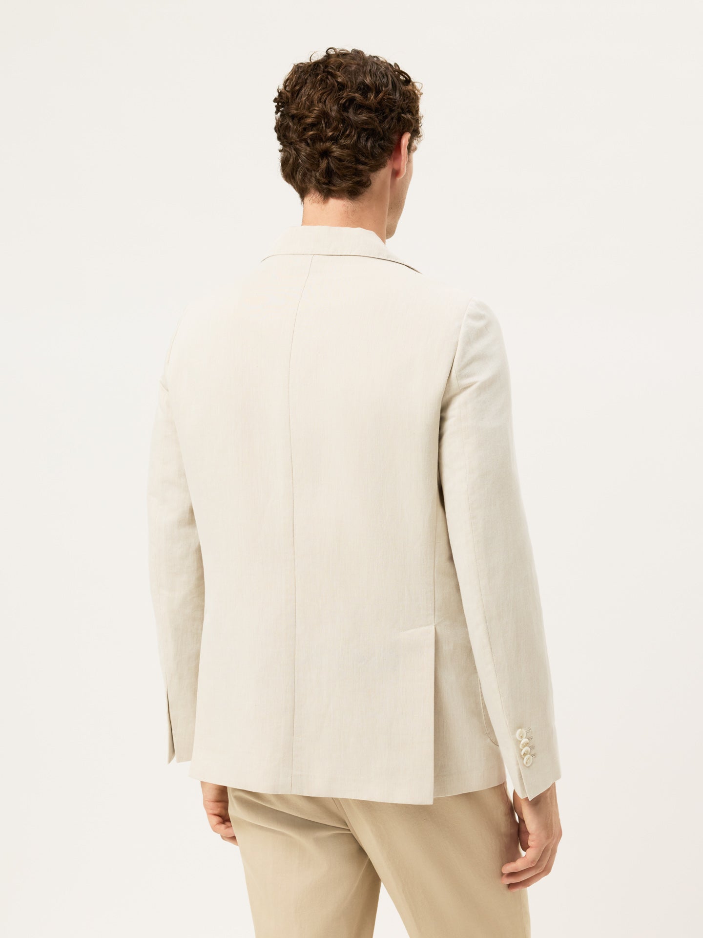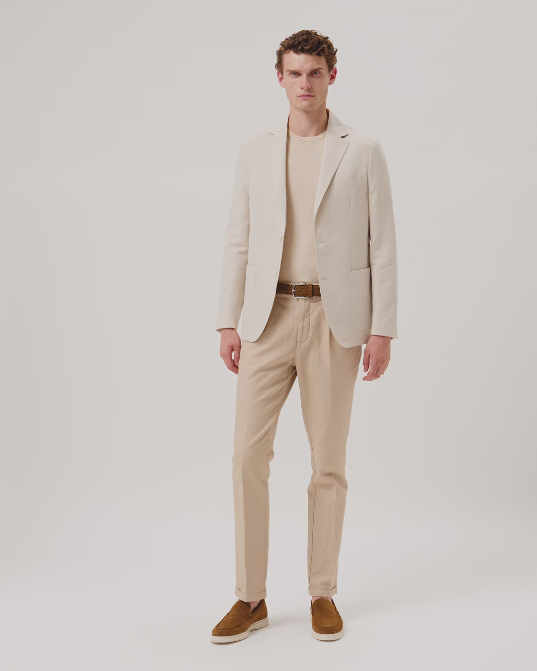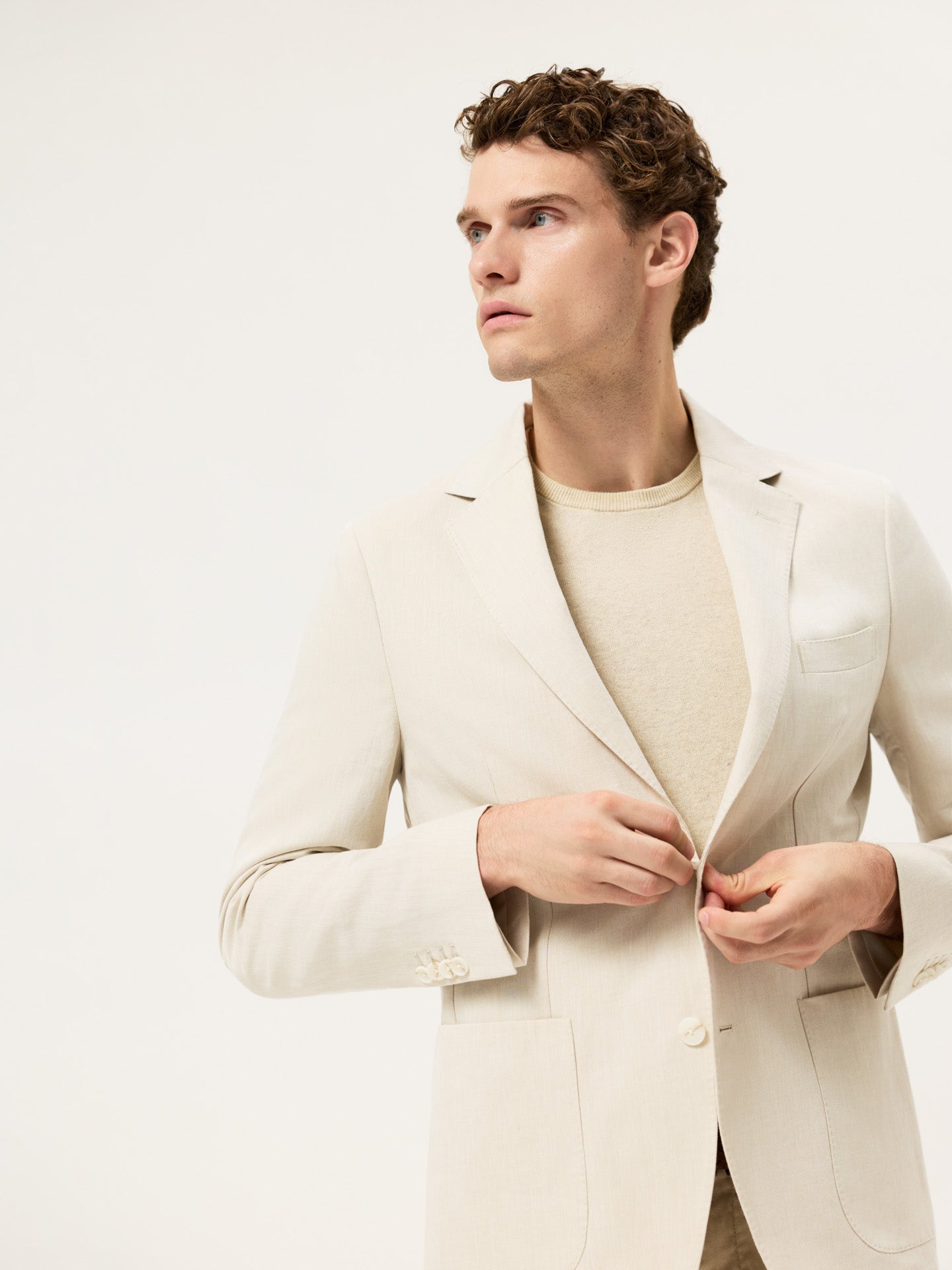 This slim-fit blazer is tailored from a premium Italian knit fabric, composed of a soft and breathable linen-cotton blend. Crafted in Portugal, it is designed without lining for enhanced lightness and comfort, and features four overlapping buttons, a notched lapel, patch pockets with a coin pocket, and a curved chest pocket. AMF topstitching in matching tones and engraved metal buttons add to the refined finish. The self-fabric undercollar and interior half-moon detail reinforce the garment’s elevated craftsmanship.
