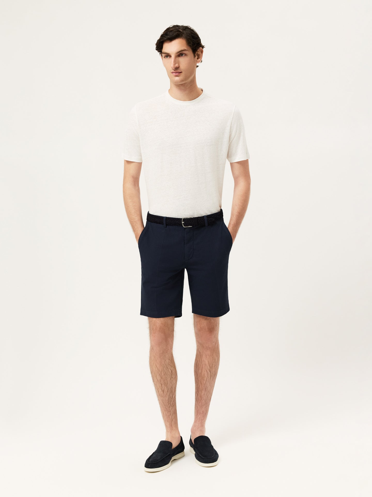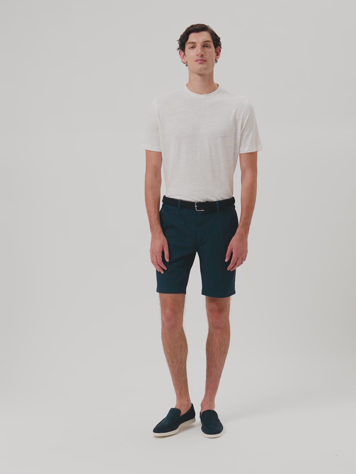 Crafted from a naturally breathable linen jersey, this T-shirt combines a refined texture with light stretch for enhanced comfort and drape. It features a self-fabric crew neckline with single-needle stitching, short sleeves, and clean hems finished with twin-needle stitching. A discreet contrast flag label is placed at the side seam.