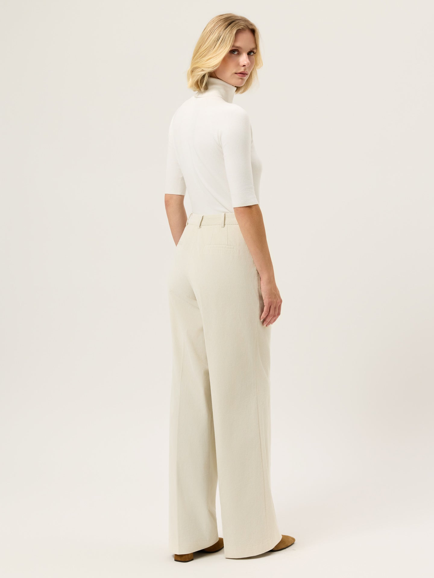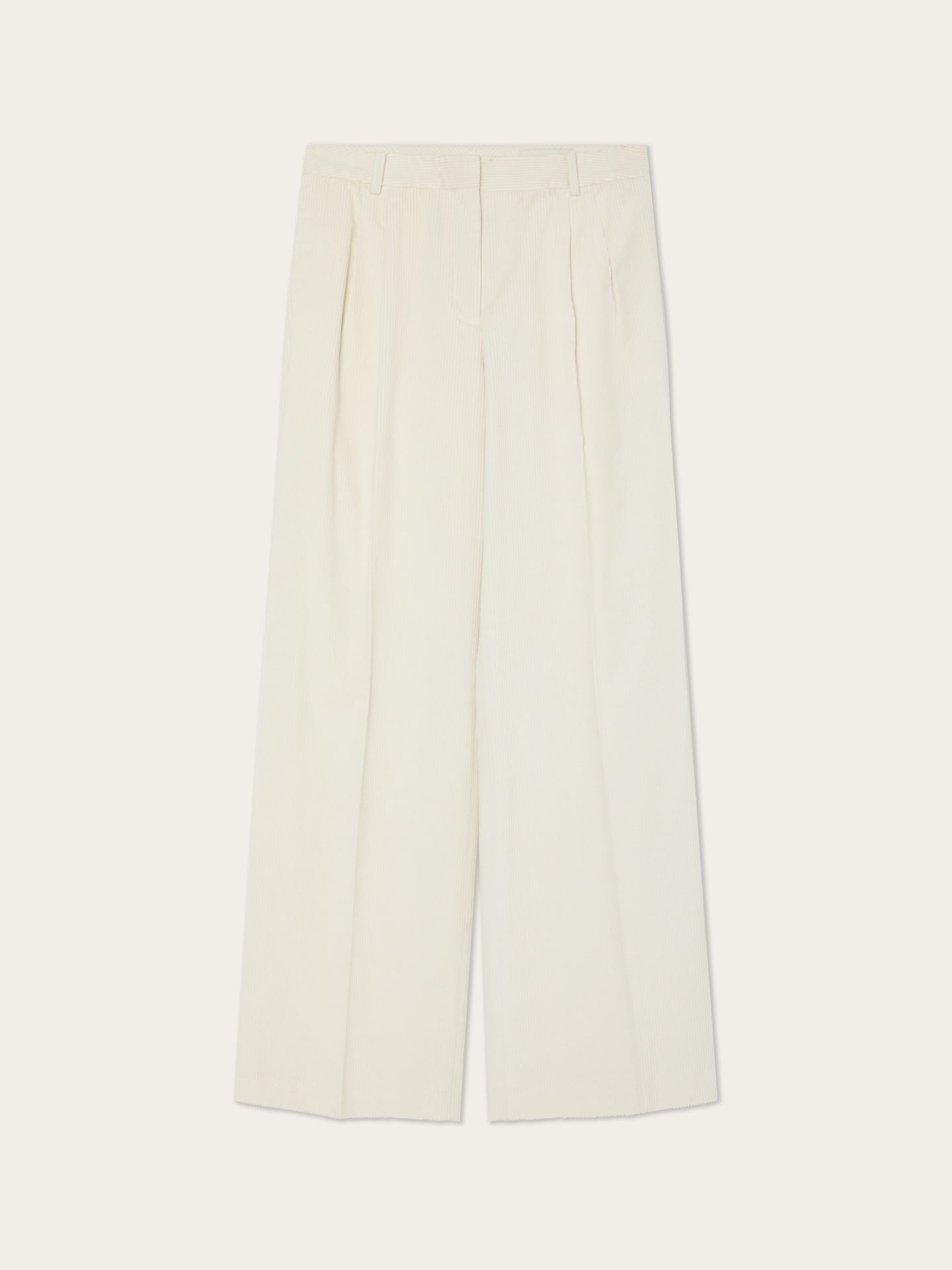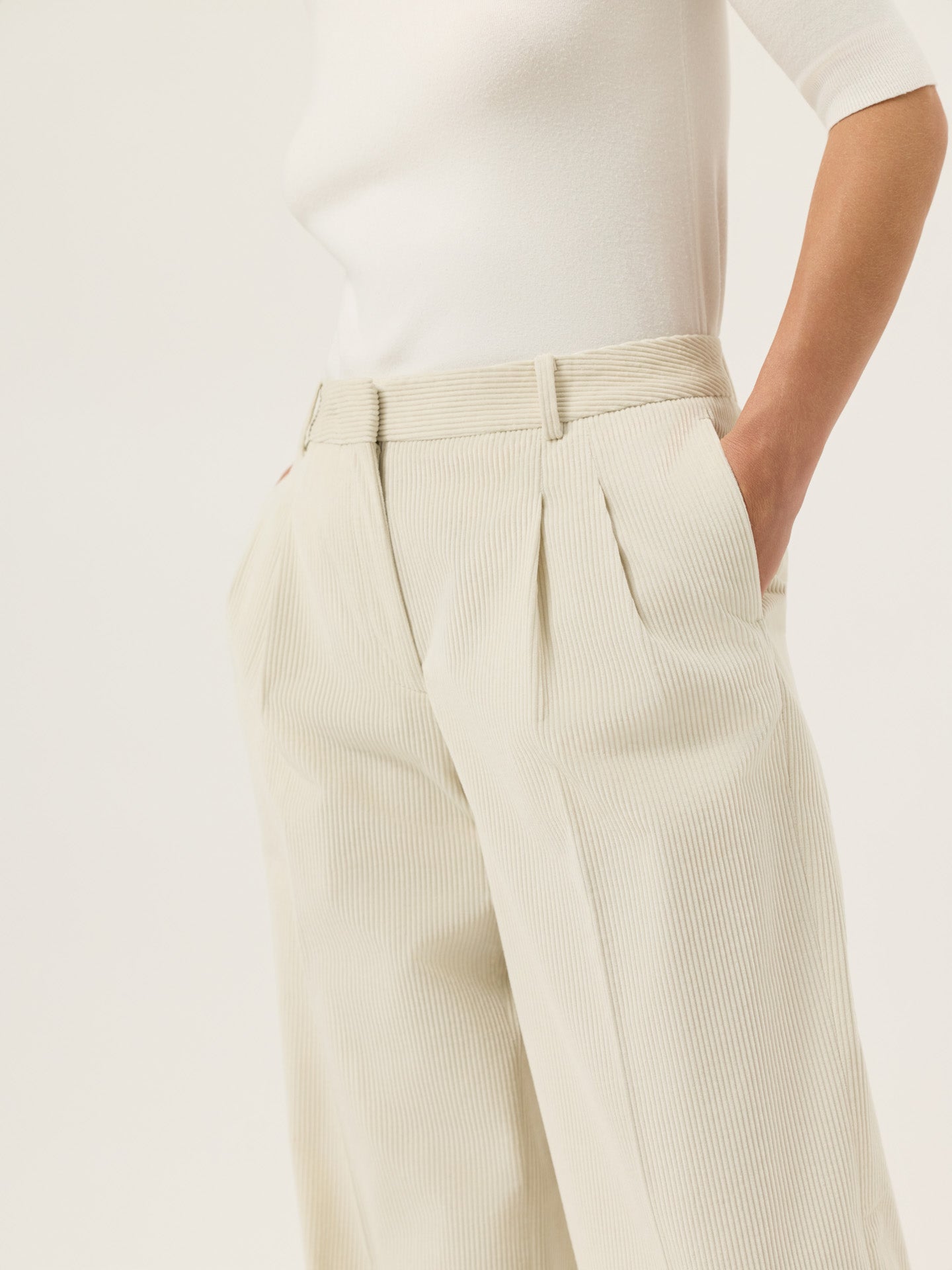Creased high waist trousers expertly tailored from 100%Cotton Corduroy fabric with loose fit and front pleats. Zip fly and hook and eye waistband fastening, knife pockets, welt back pockets and invisible hem.