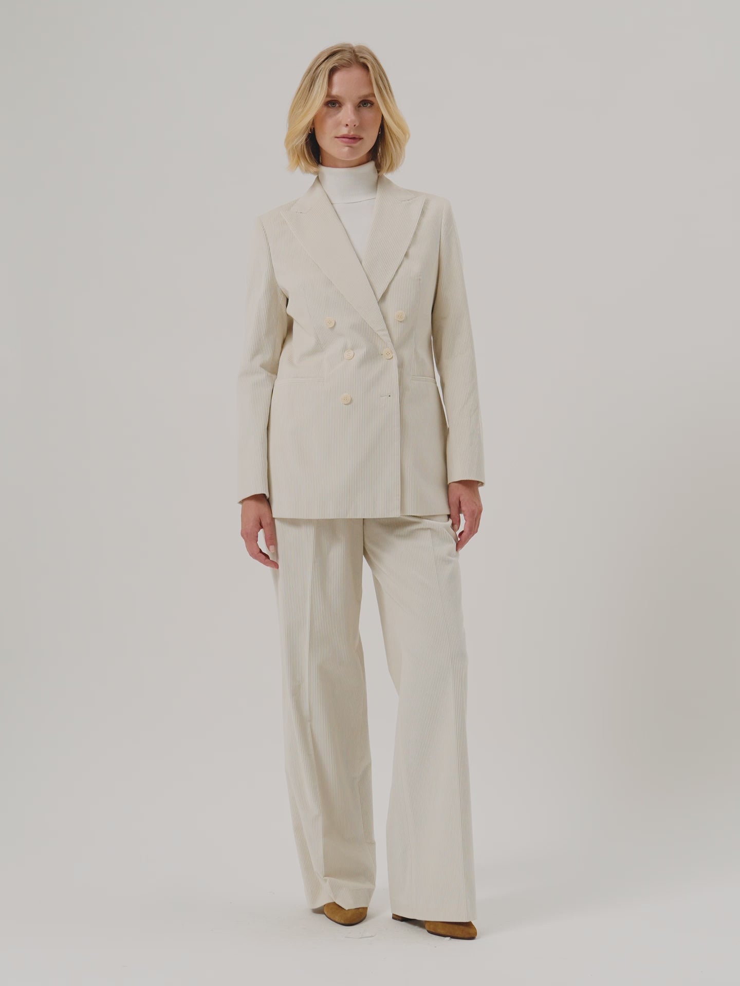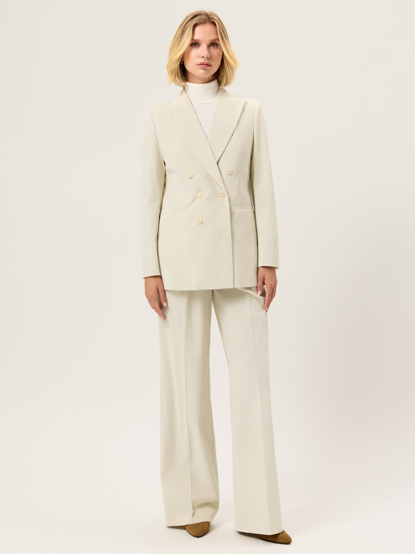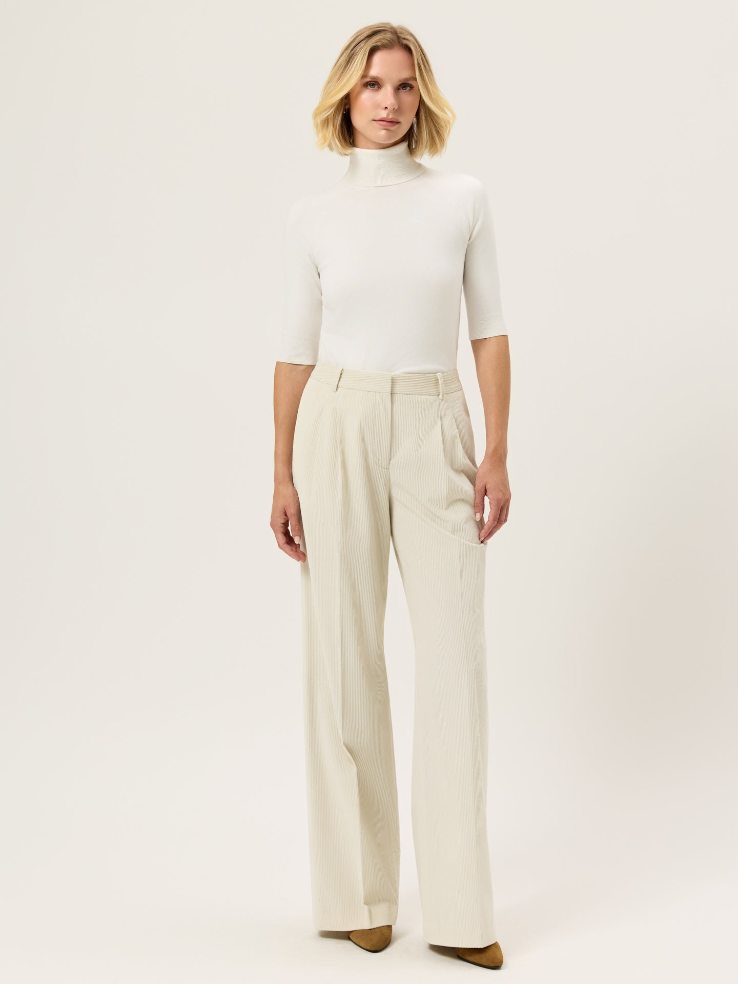 Creased high waist trousers expertly tailored from 100%Cotton Corduroy fabric with loose fit and front pleats. Zip fly and hook and eye waistband fastening, knife pockets, welt back pockets and invisible hem.