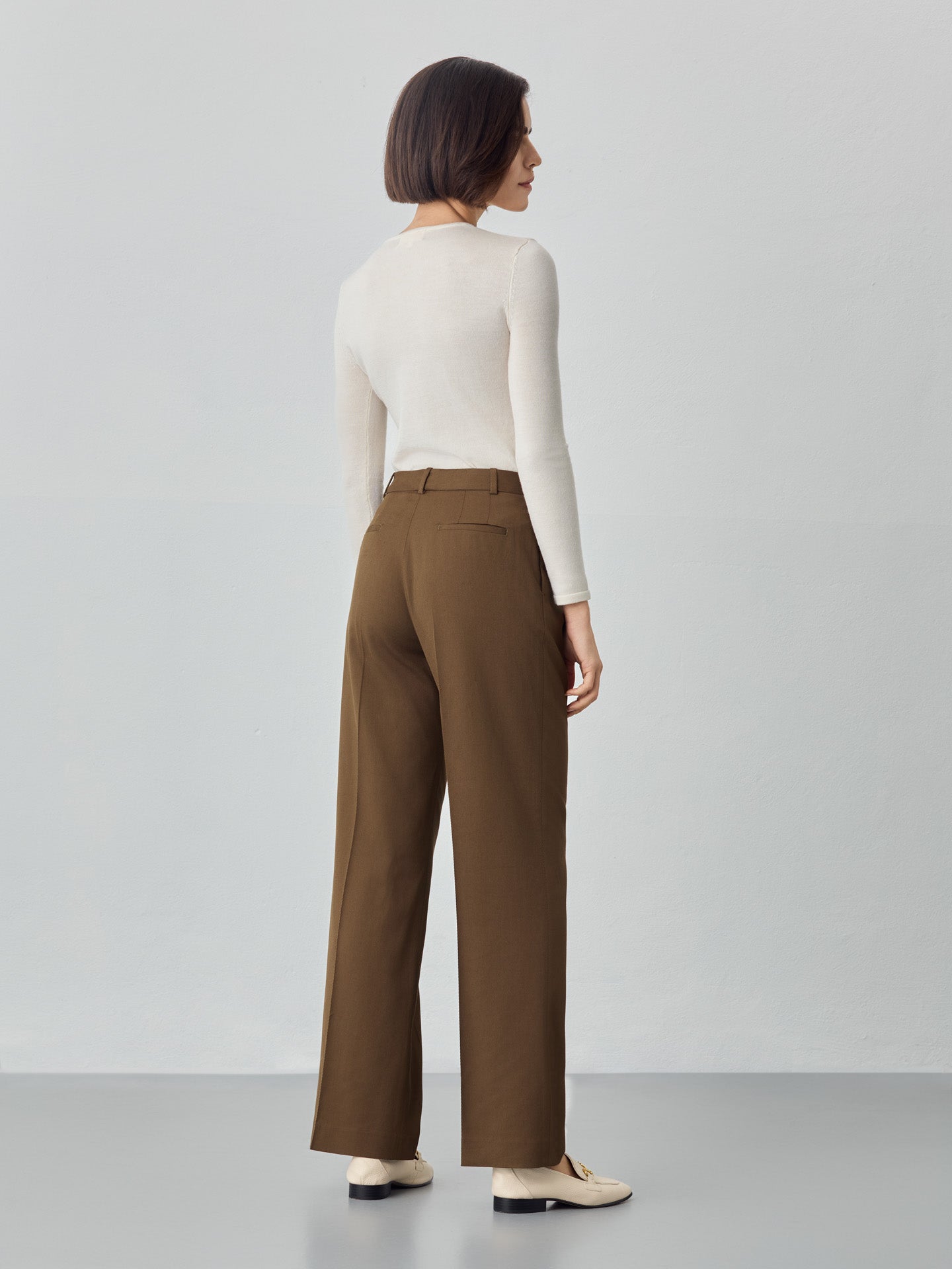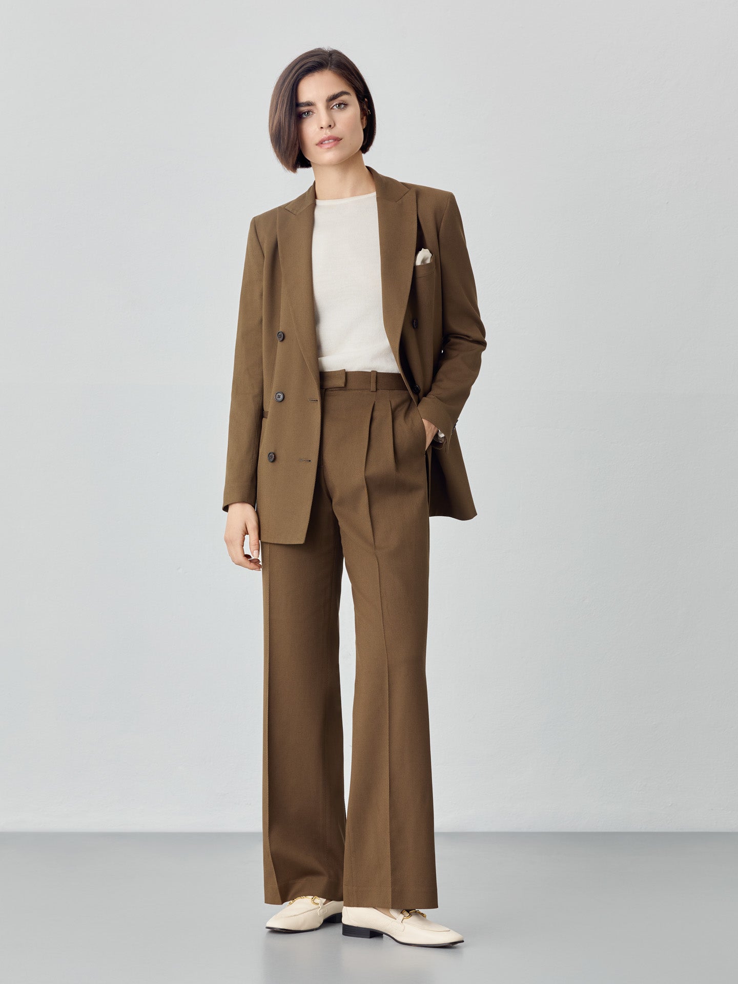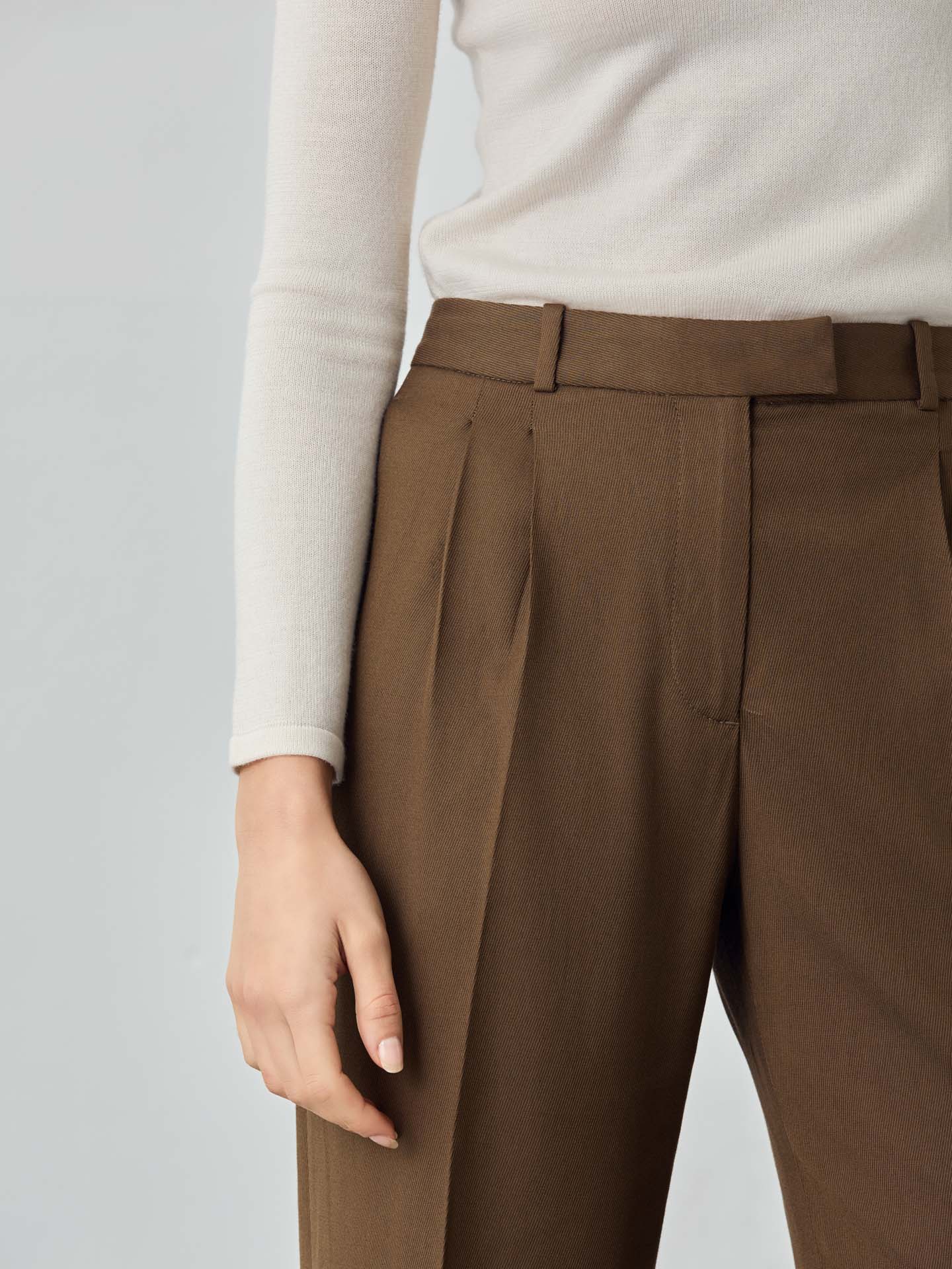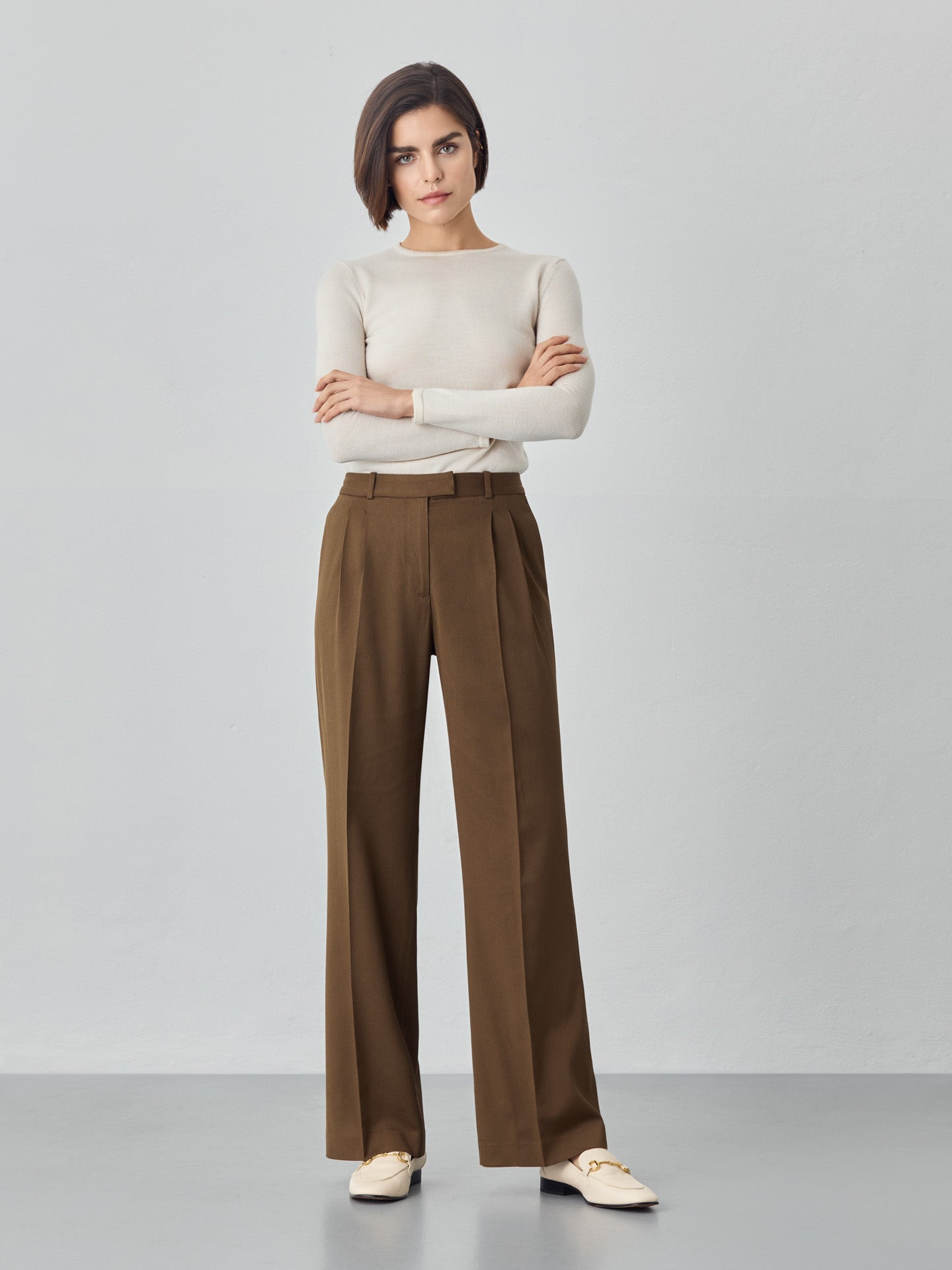 Creased high waist trousers expertly tailored from Viscose Blend fabric, made in Portugal, with loose fit and front pleats. Zip fly and hook and eye waistband fastening, knife pcokets, welt pockets and invisible hem.