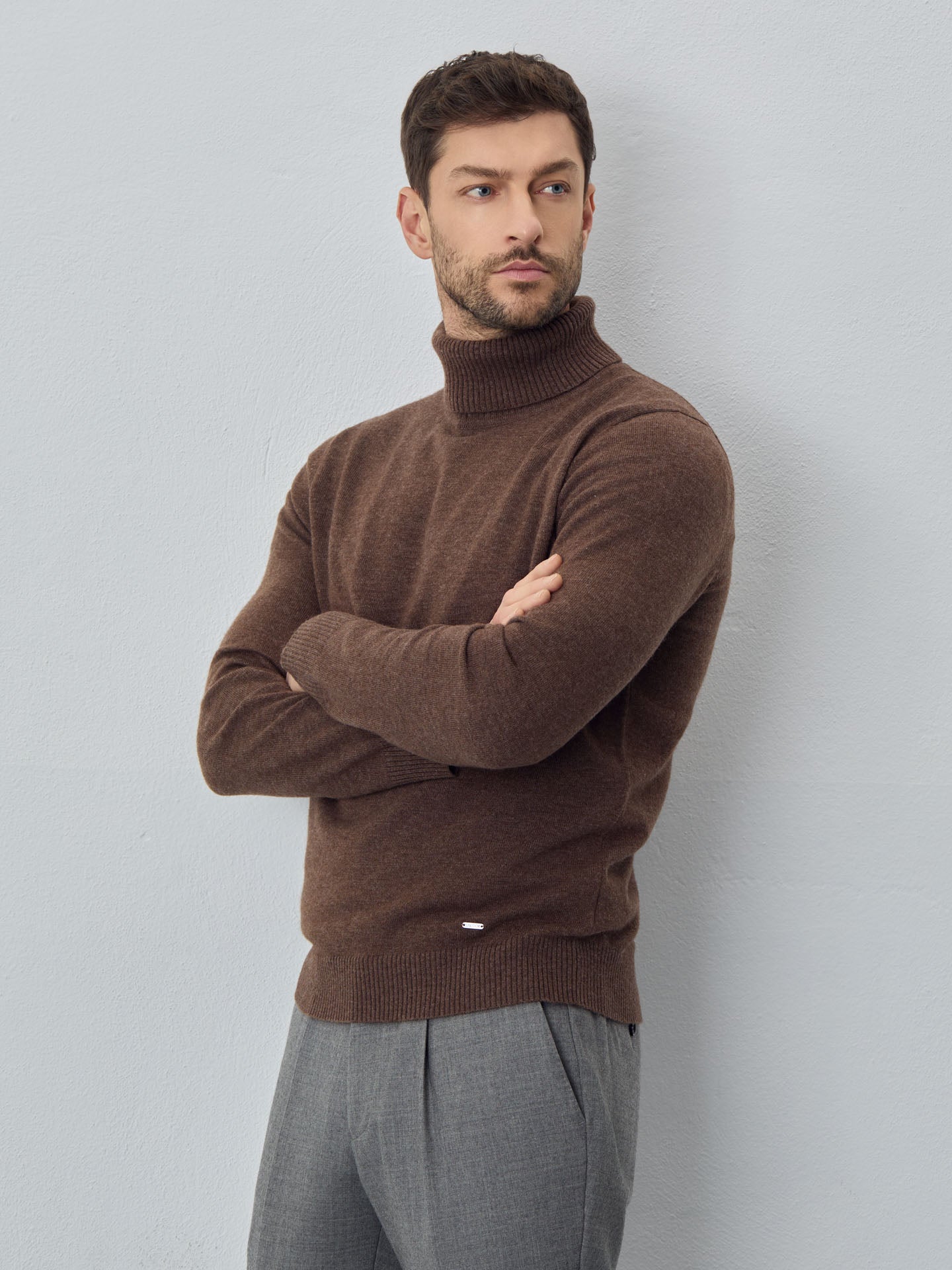 Long-sleeve turtleneck sweater made from Lambswool and nylon blend. Features the brand's signature metal plate and ribbed knitting on the collar, cuffs, and hem. Fully fashioned at the shoulder seams and armholes. This sweater is machine washable.
