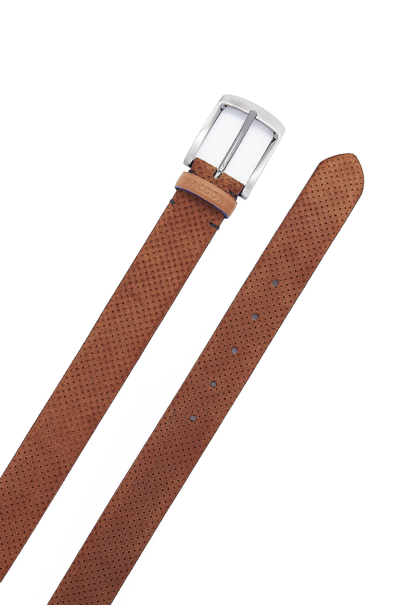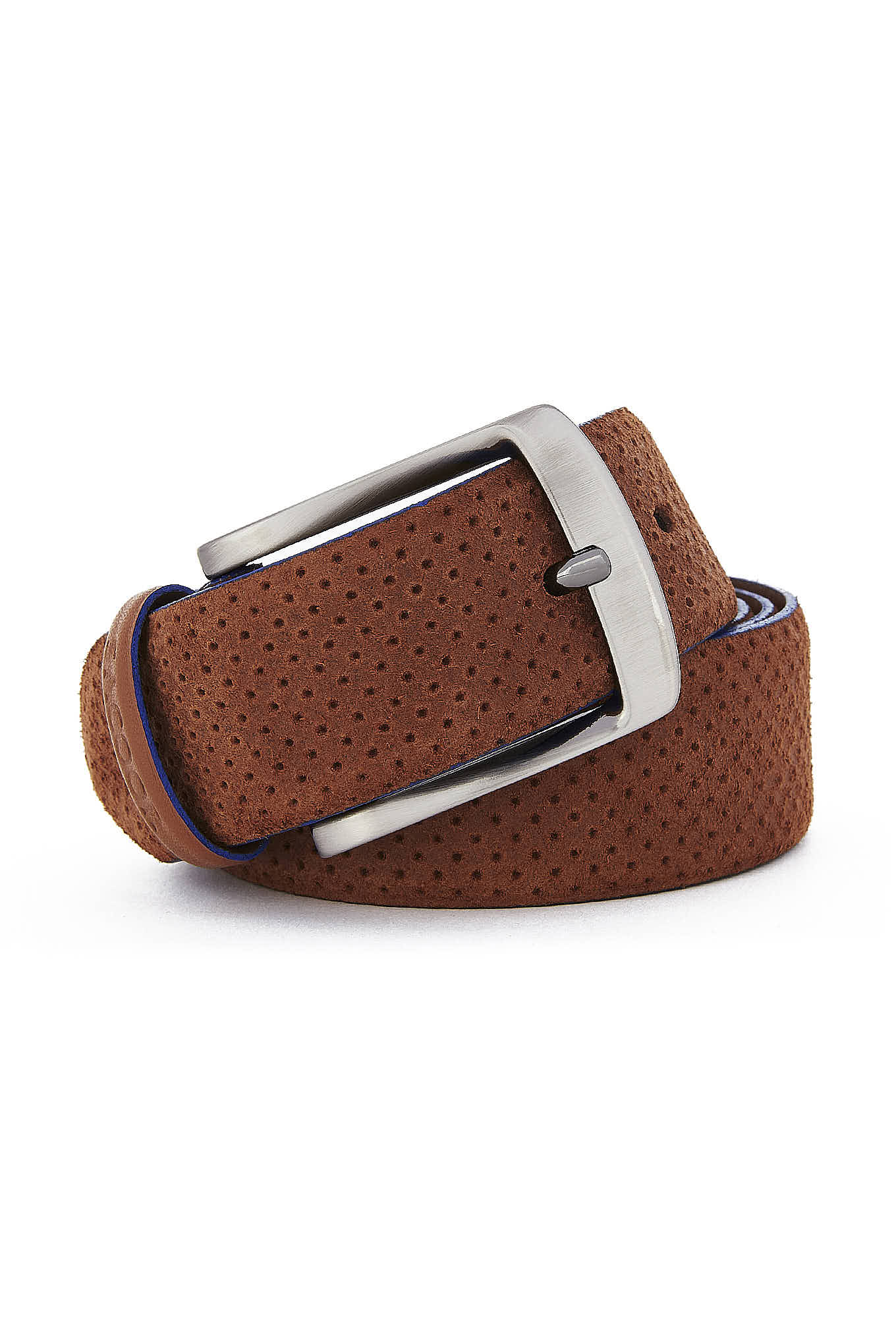 Men's suede belt, perforated texture. With silver metal buckle and 1 loop. Highly versatile accessory to wear with your chinos or other Sacoor pieces. One size fits all.