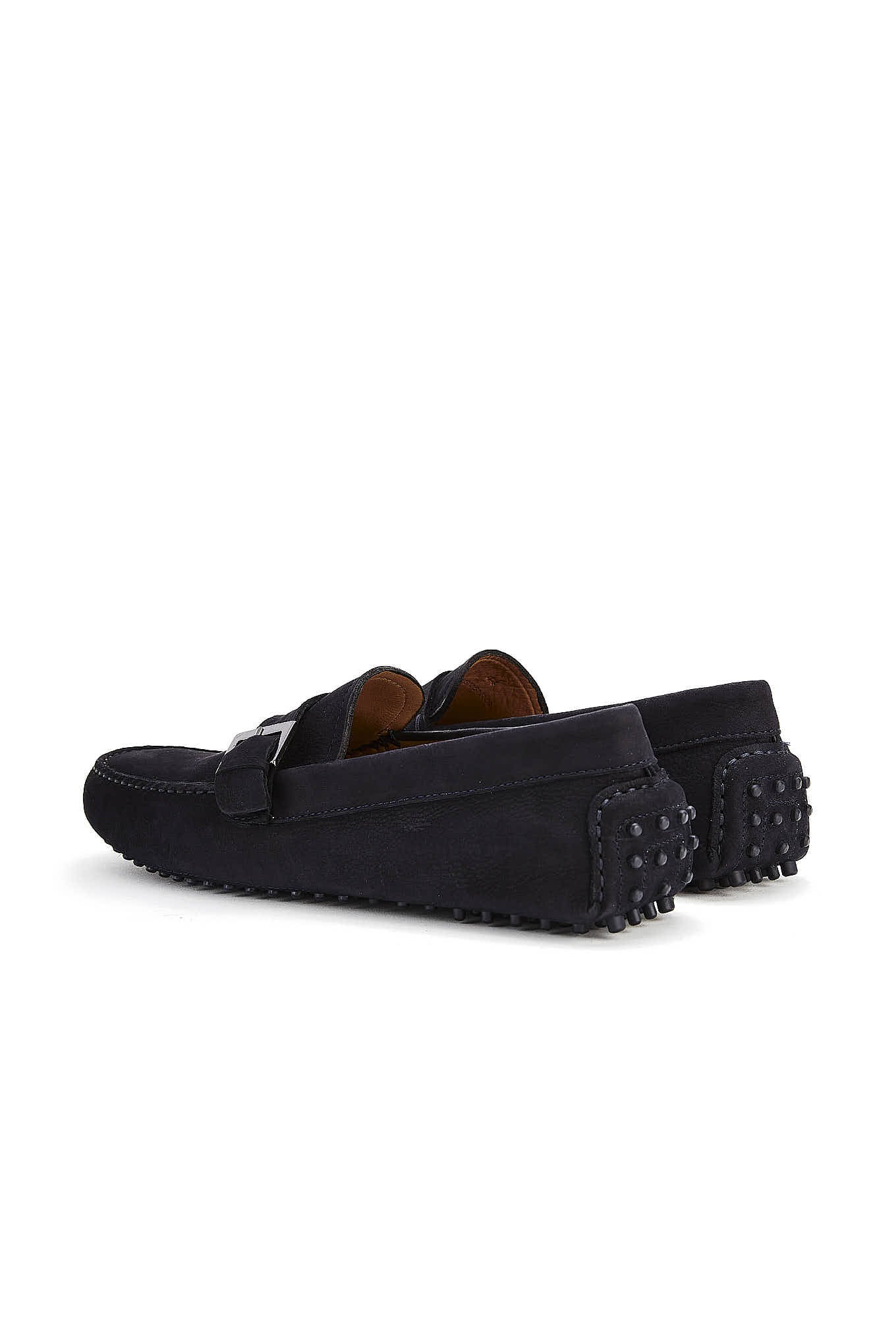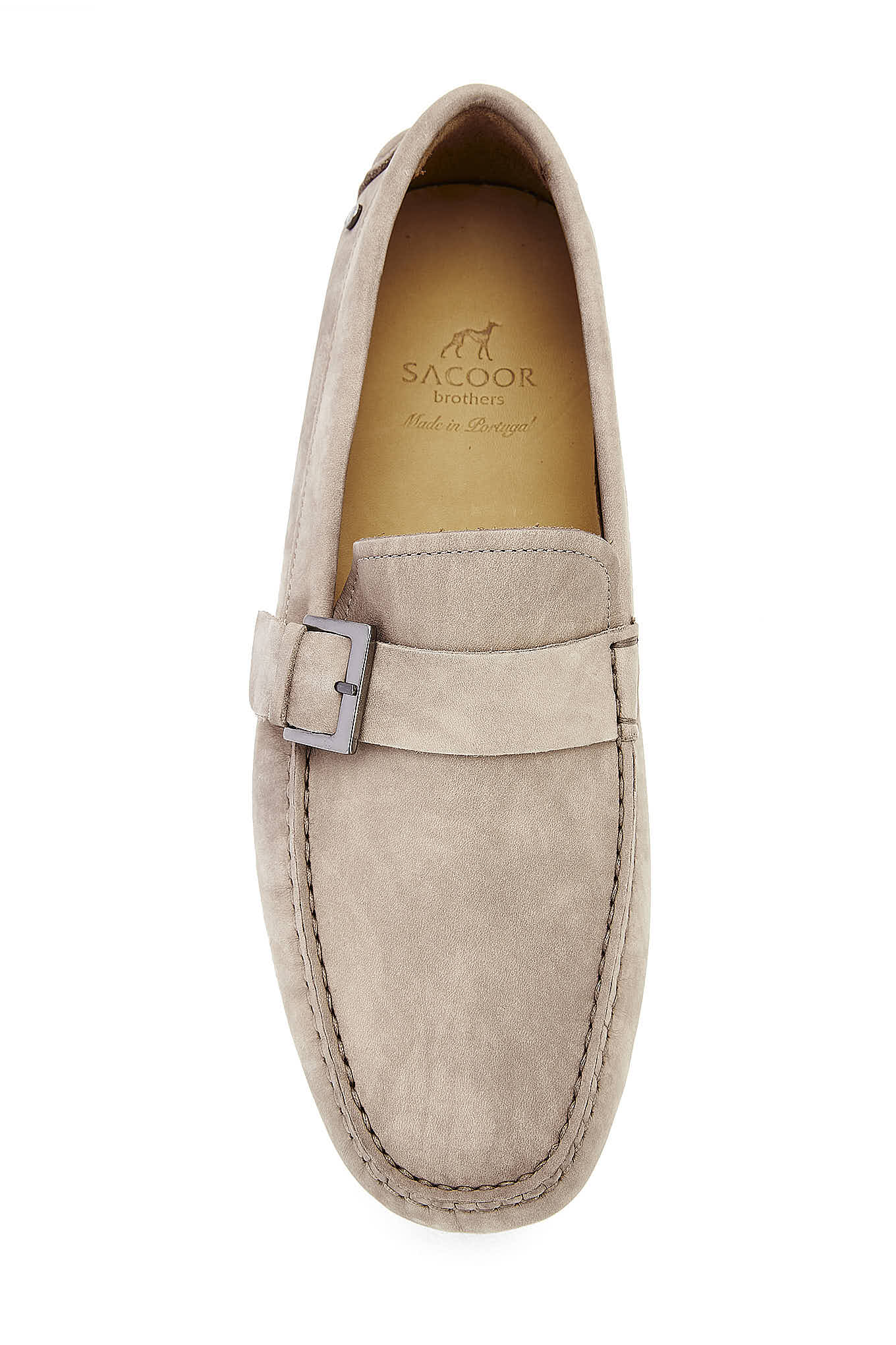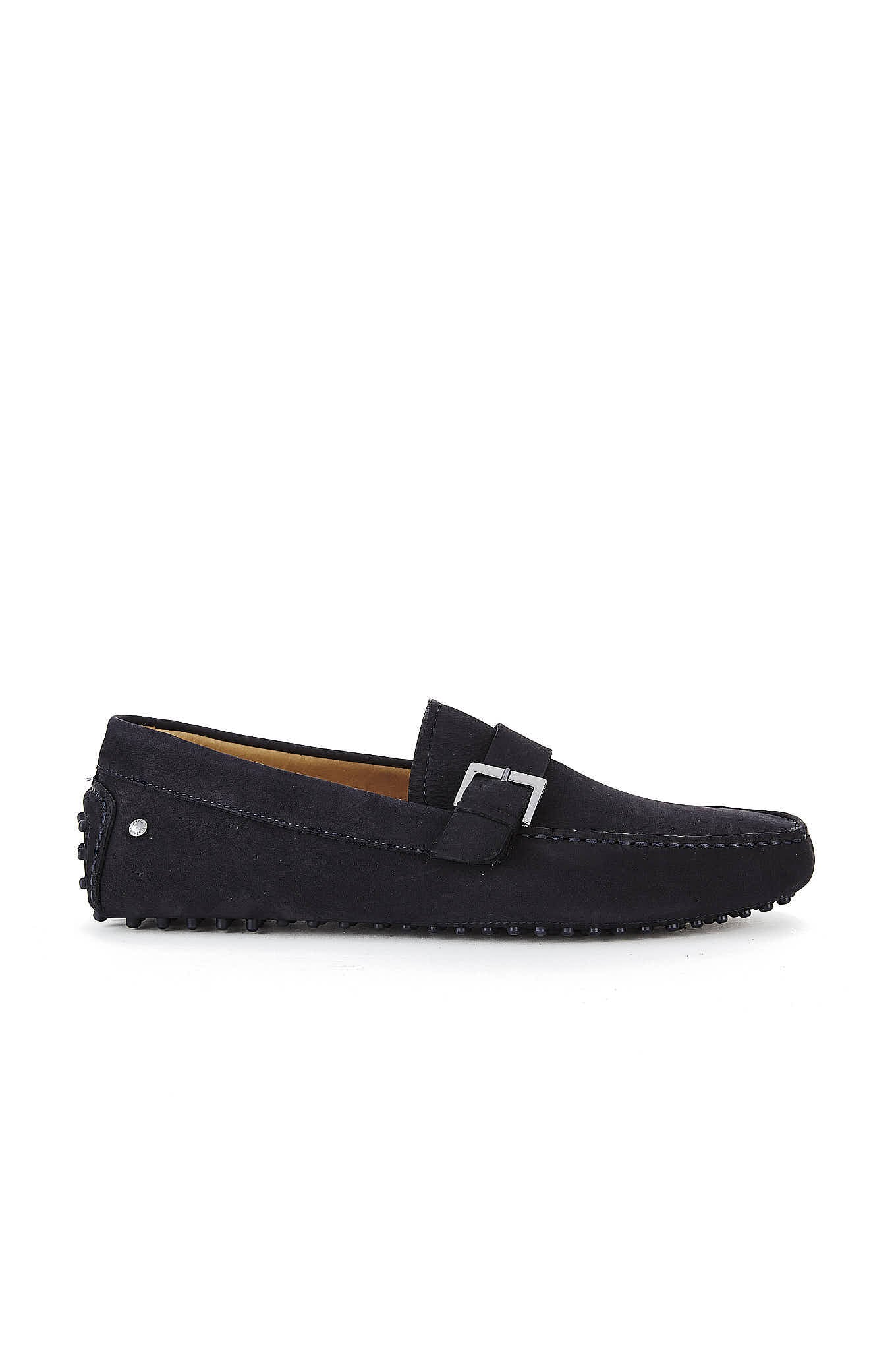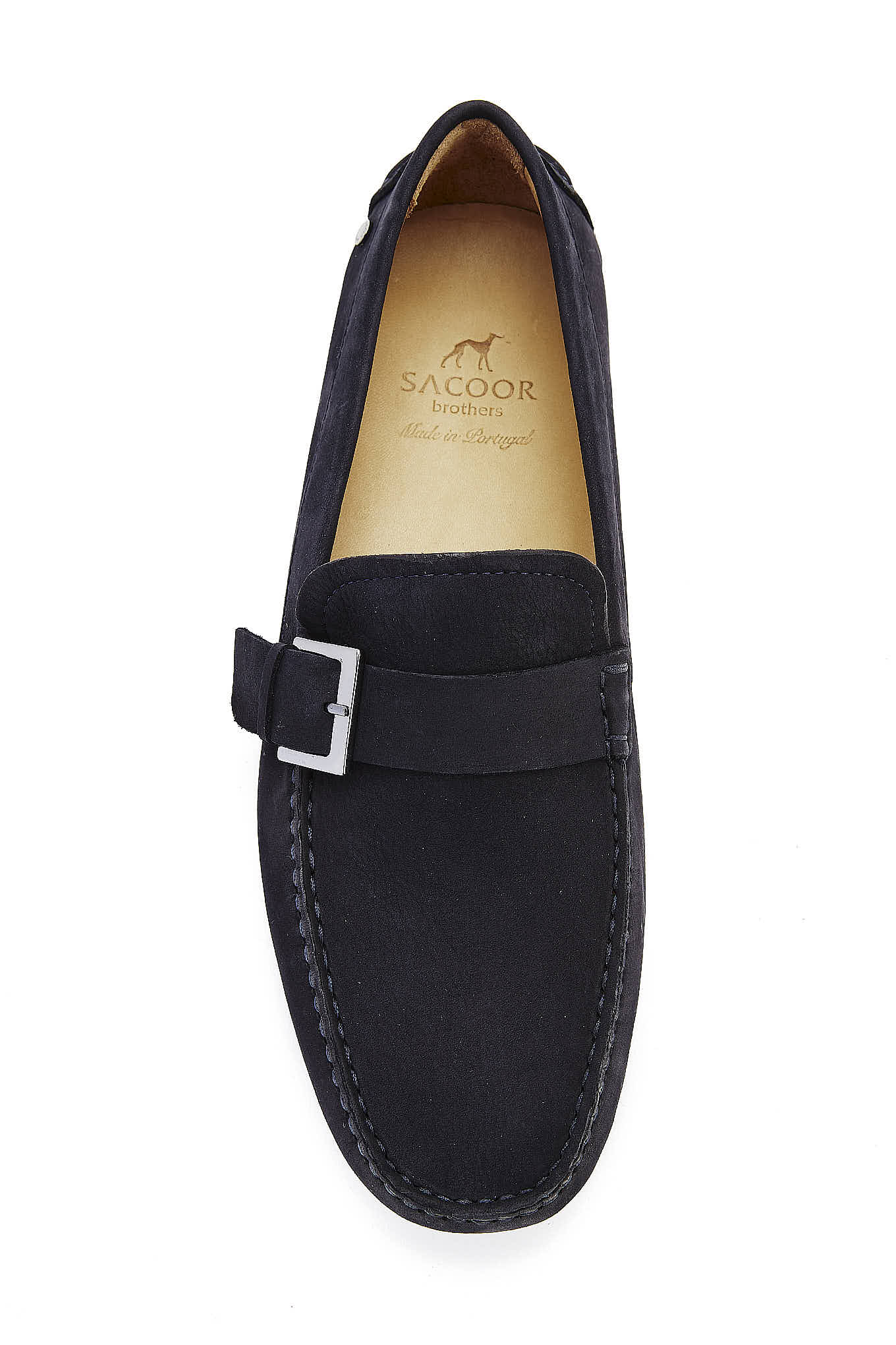 Men's suede shoes, made in Portugal. Strip of the same material on top, with darkened silver buckle. Interior is also leather, with ultra-comfortable insoles. Rubber sole, with heel detail of the same material. Elegant customised Sacoor storage bag included. Comfortable, modern shoes for informal occasions.