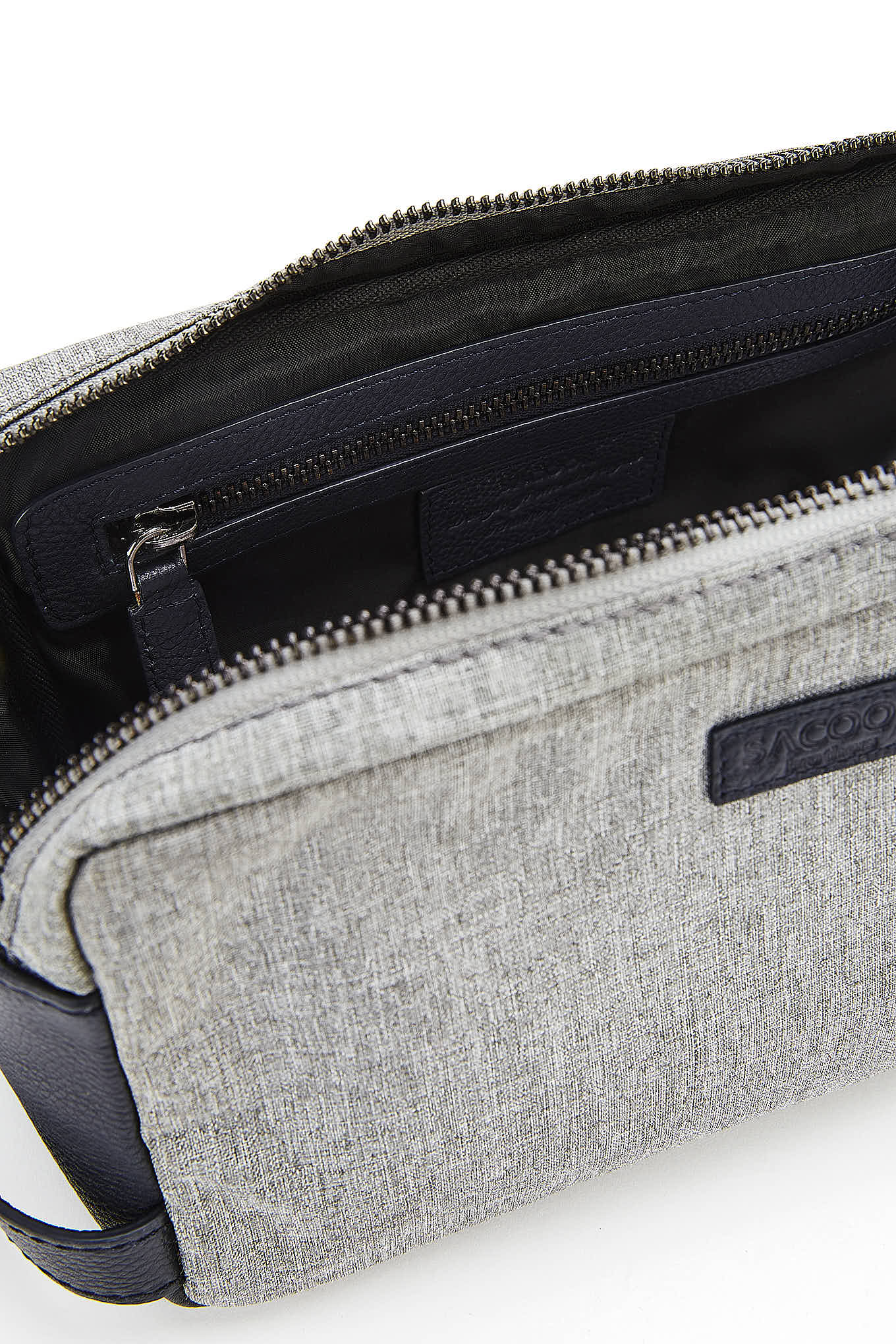 Toiletry bag with blended pattern contrasting with genuine leather details. Includes 2 central partitions with zip fastener, one of which has an inside pocket, also with zip fastener. Zip-fastened exterior pocket. With handle for easier transportation. Measurements: 14 cm x 24 cm x 10 cm approx. (Height x Width x Depth). Spring/Summer 2019 collection available at Sacoor Brothers online store.