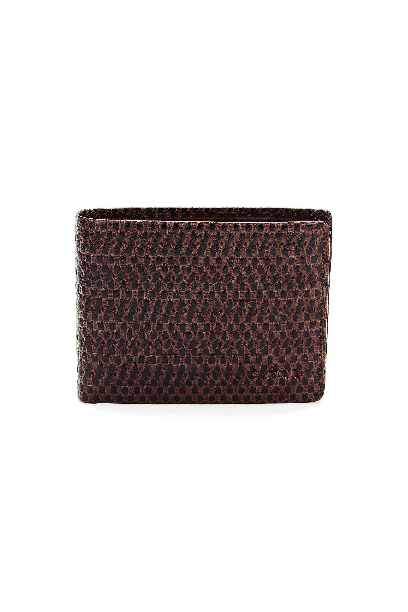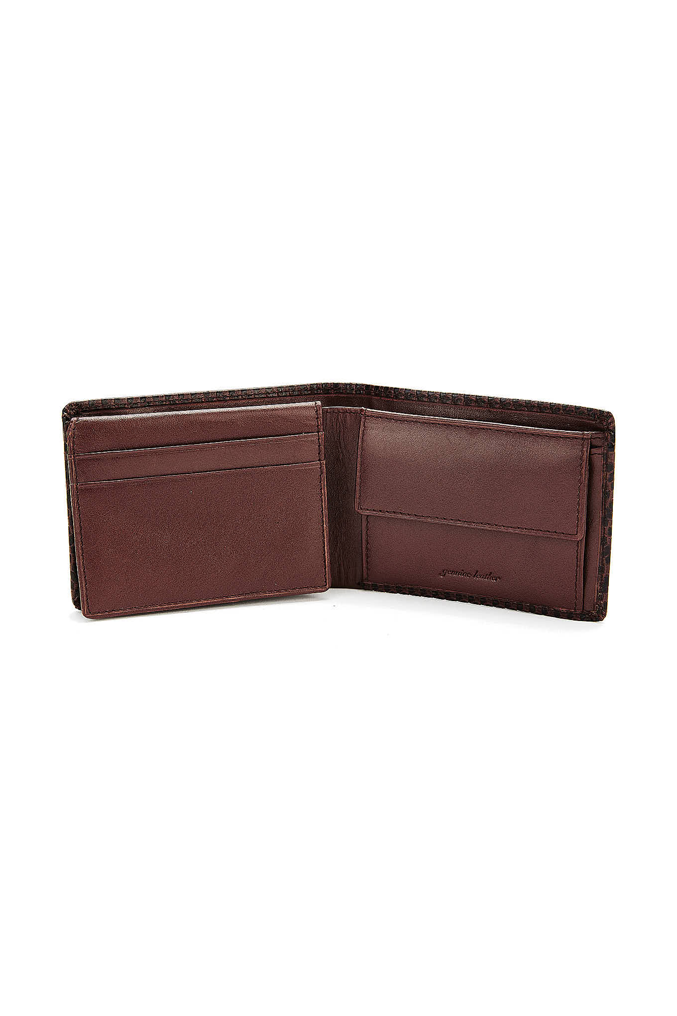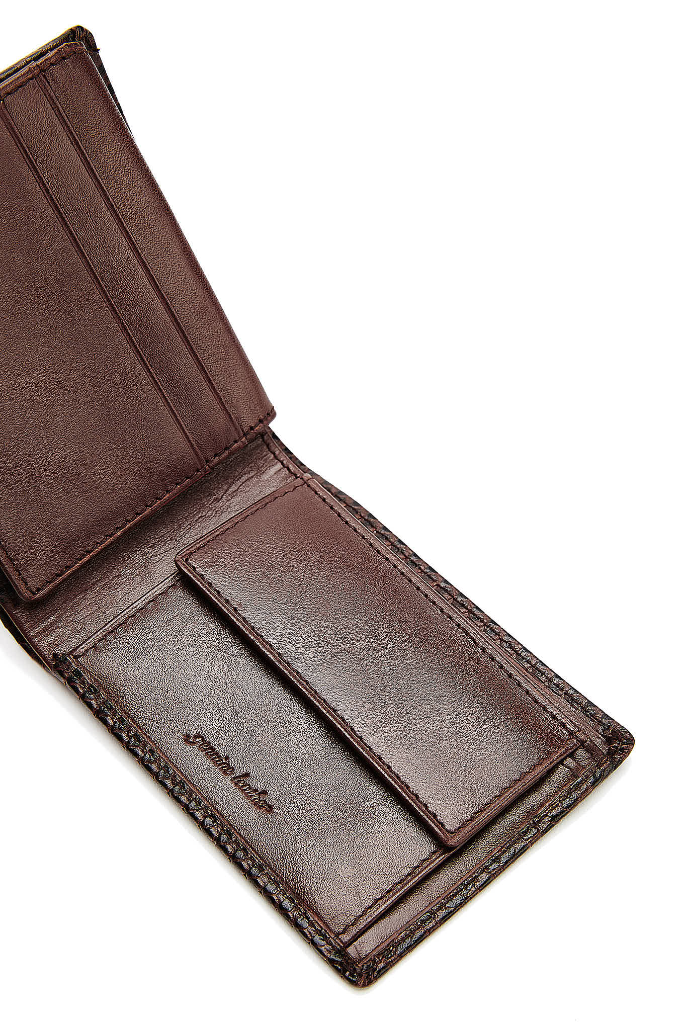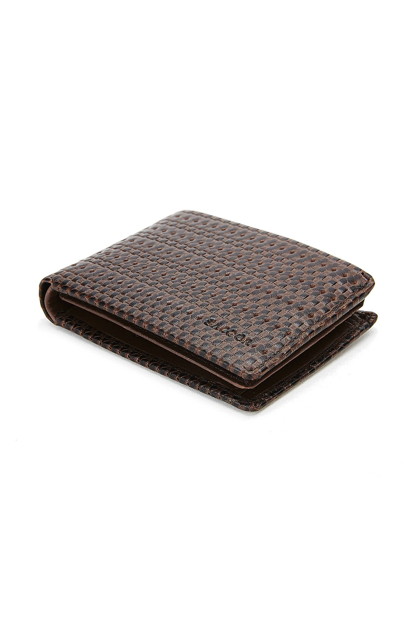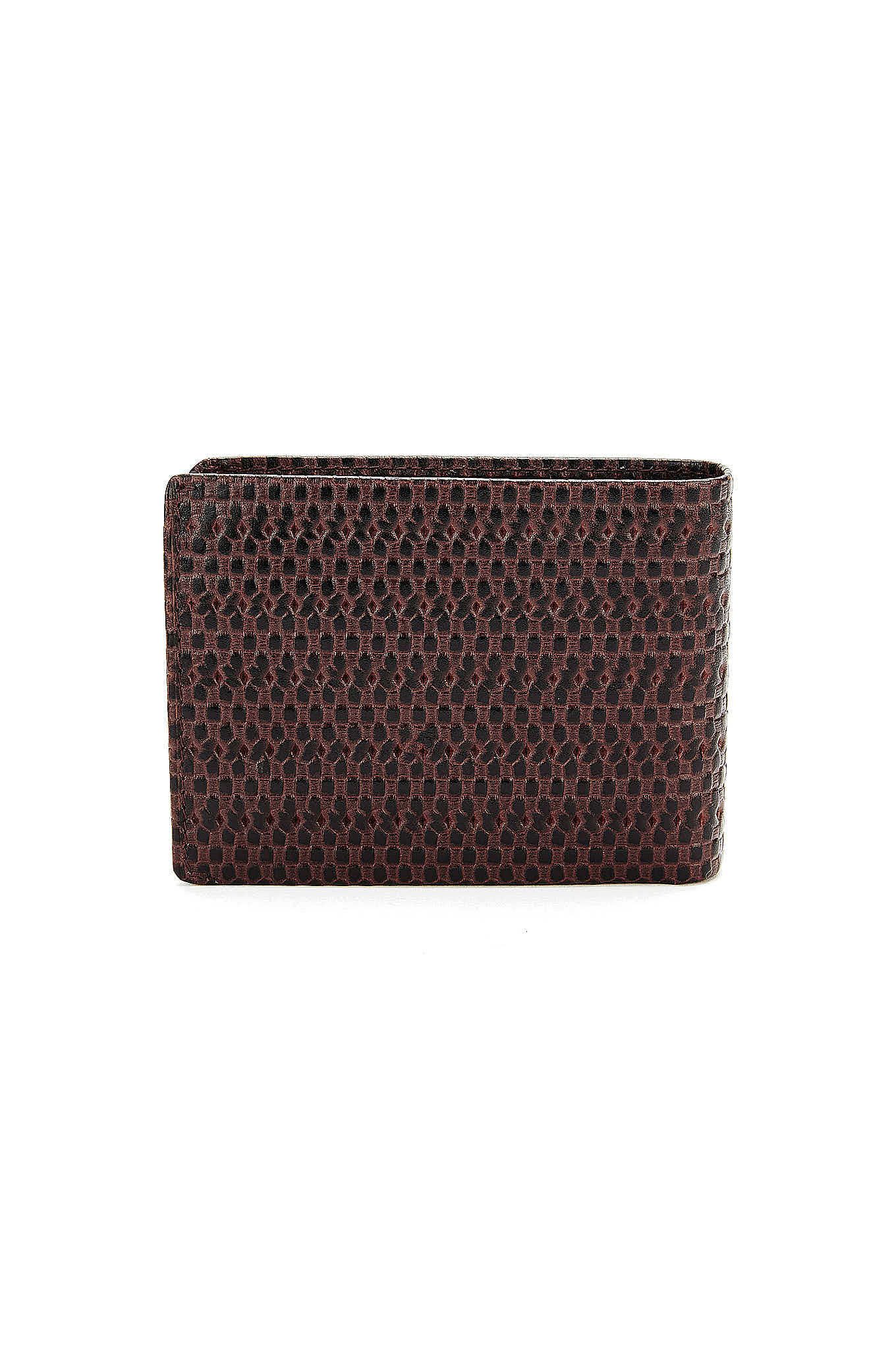 Men's wallet in textured leather with twisted-effect pattern. Includes several card compartments, partitions for notes or documents and coin pouch with snap closure. 8 cm high x 11 cm wide (closed). Sold in a cardboard box.