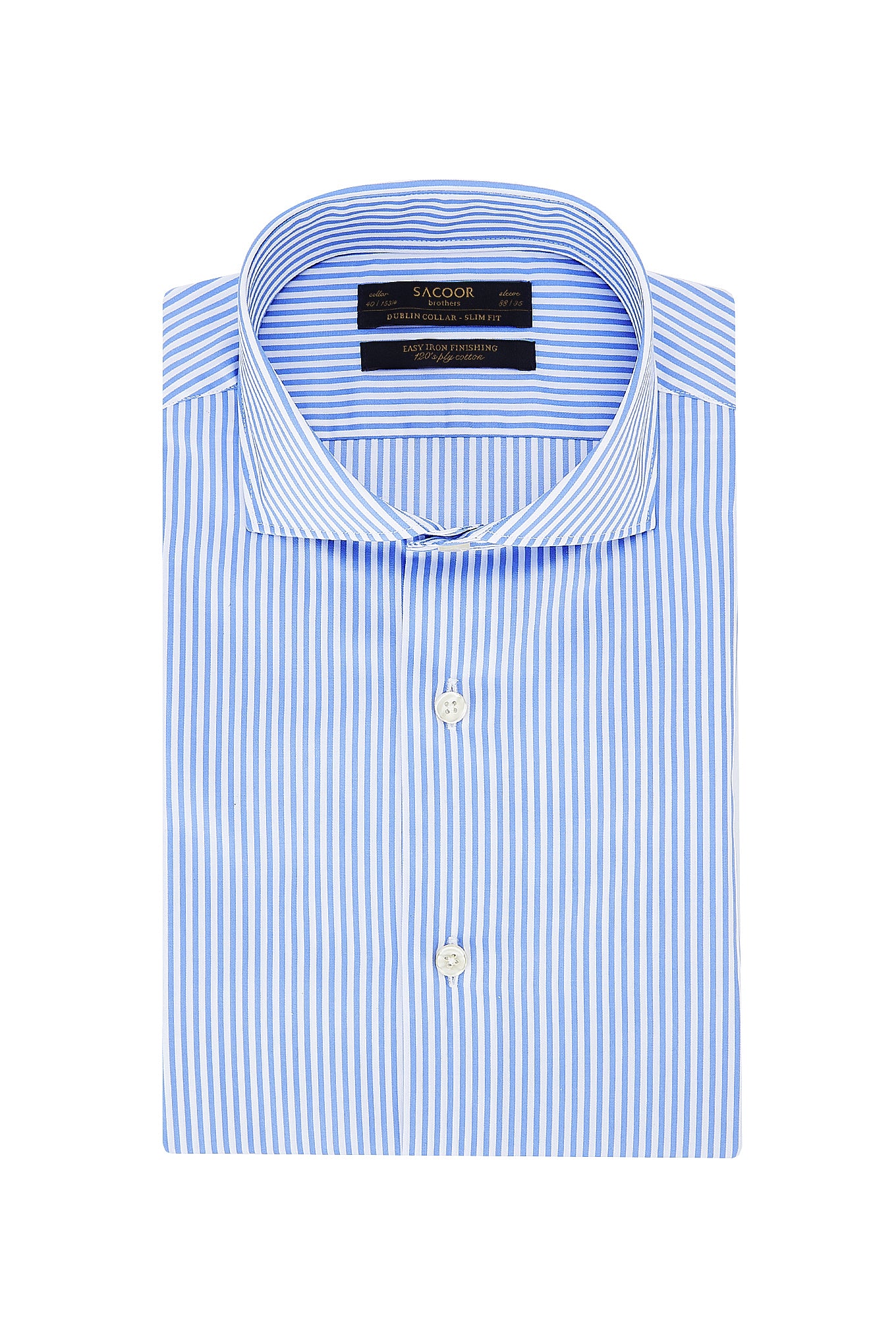 Men's shirt, slim fit, striped pattern. Open collar, with stays included. English stitching, more comfortable with a quality finish. Cotton, very easy to iron. The size 40 back length is 78 cm and the sleeve length is 63 cm. See our Size Guide.