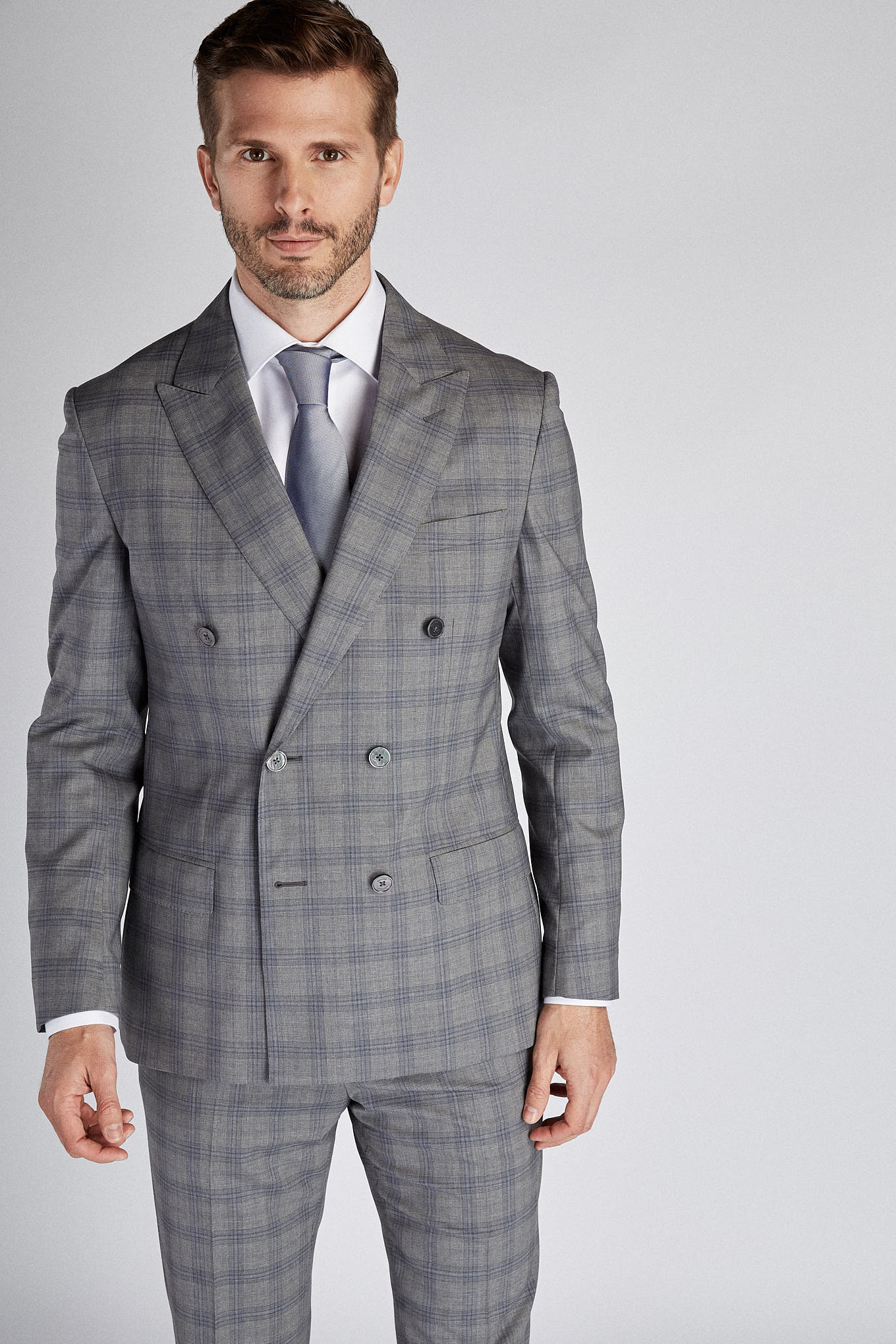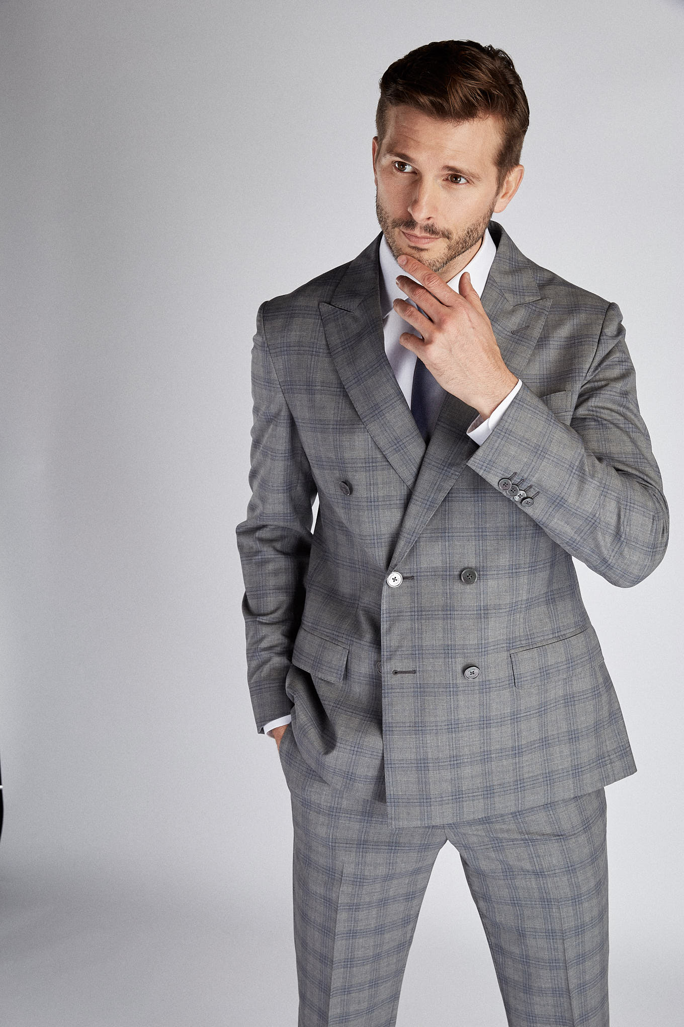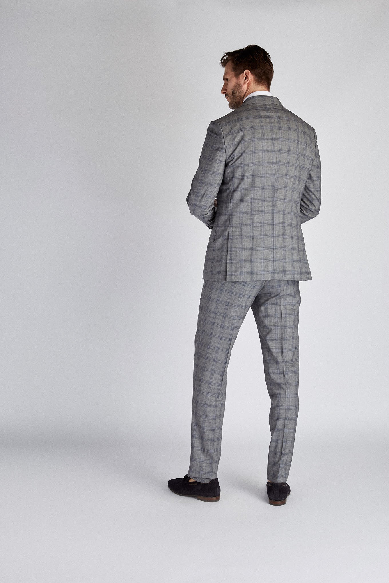 Men's suit, special edition made in Portugal. With the refinement of Italian fabric, made of pure virgin wool. Checked pattern. Double breasted blazer, with peaked lapel lined with felt at the neck. Full satin lining for greater comfort. With 2 side pockets, 1 chest pocket and 3 inside pockets. Back vents. Trousers with reinforced waistband and loops. With zipper and buttons. Side and back pockets and watch pocket. - Trousers with silicone strip to hold the shirt. - Trousers with knee-length lining for greater comfort. - Drop 6 model. - Size 50 back length is 75 cm and sleeve length is 65 cm. - The ankle width in size 44 is 19 cm.
