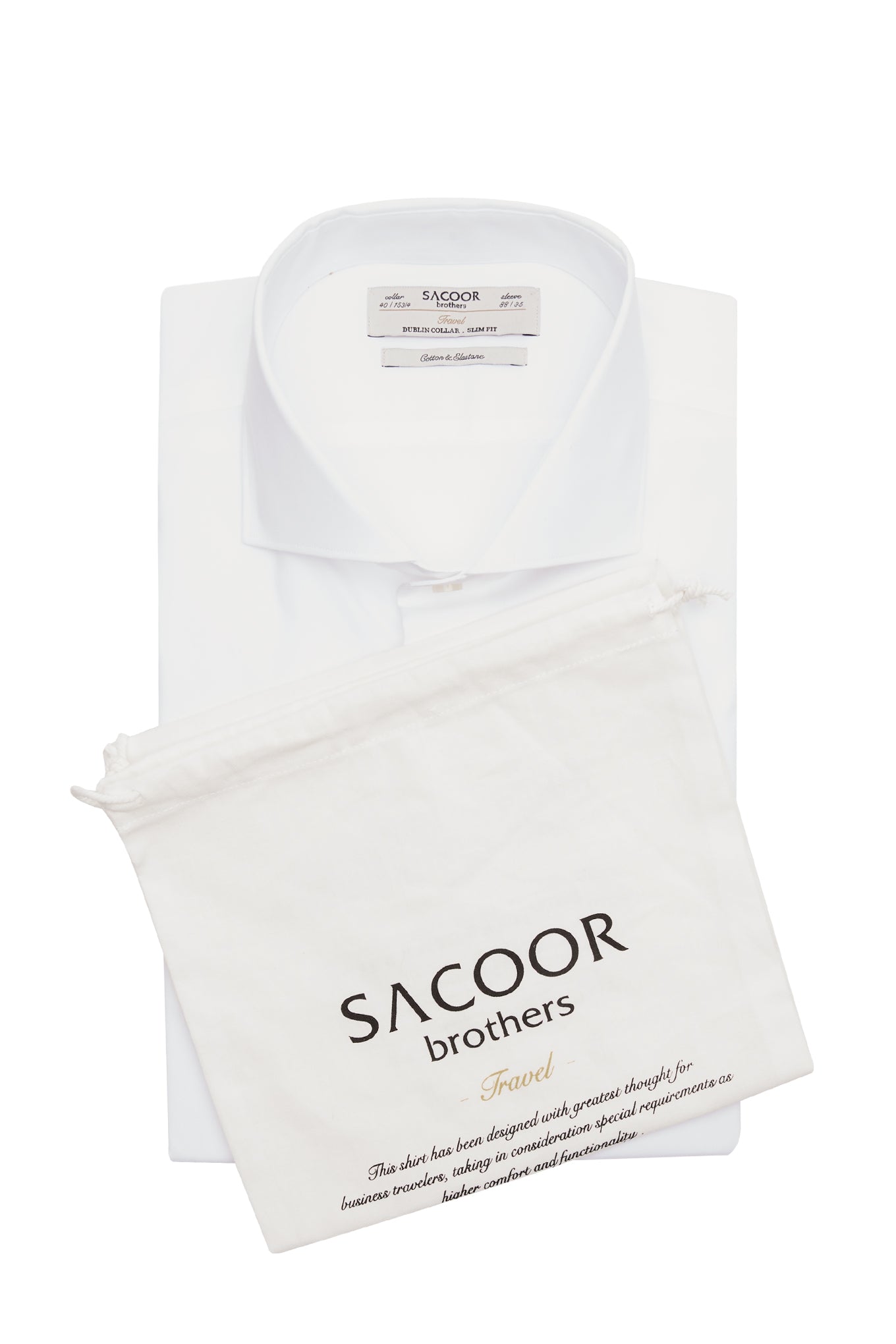 Men's shirt, classic cut, plain. Open collar, with stays included. English stitching, more comfortable with a quality finish. Side support from seams. Cotton and elastane fabric for extra comfort and flexibility. Includes practical fabric bag with drawstring. We want our Travel collection to offer freedom of movement, comfort and easy maintenance. The size 40 back length is 78 cm and the sleeve length is 63 cm. See our Size Guide.