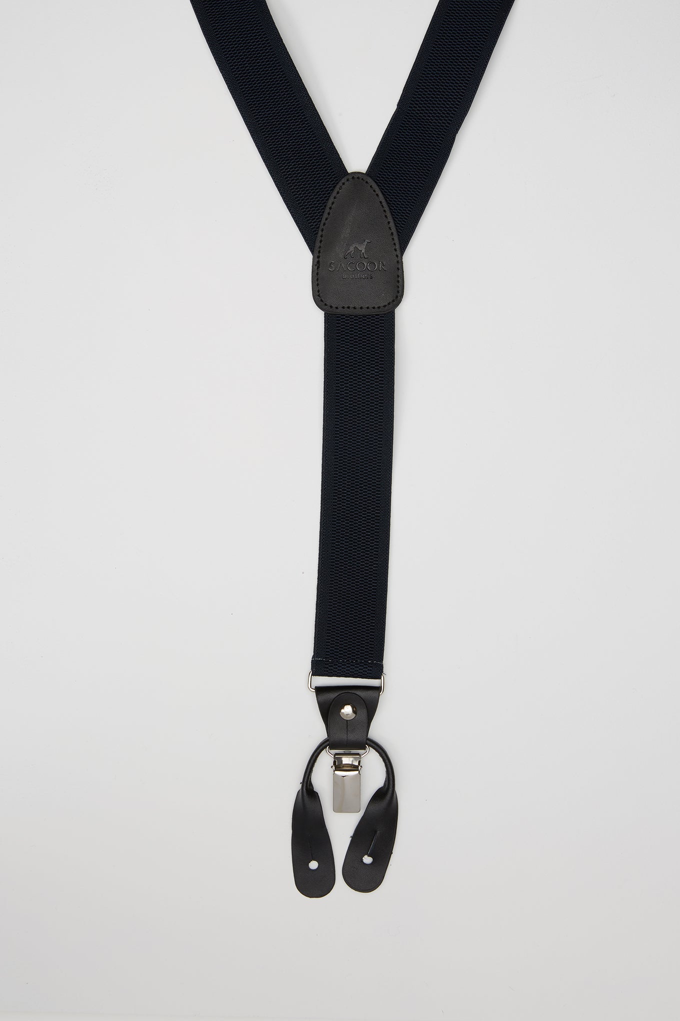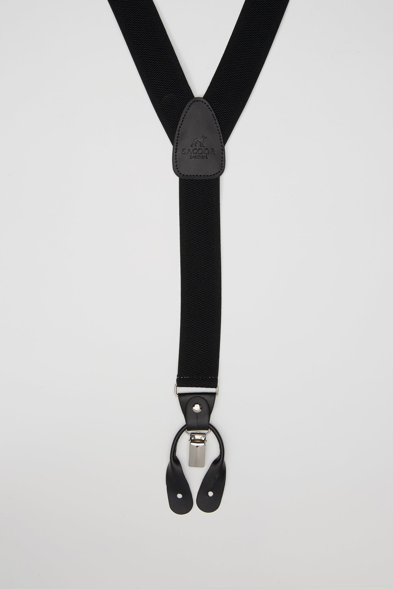 Men's classic elastic suspenders with adjustable straps. Featuring optional button-on or clip-on attachments in cowhide leather. Leather logo detail on the back. Piece of the 2018 Summer Collection on sale at Sacoor Brothers' online store.