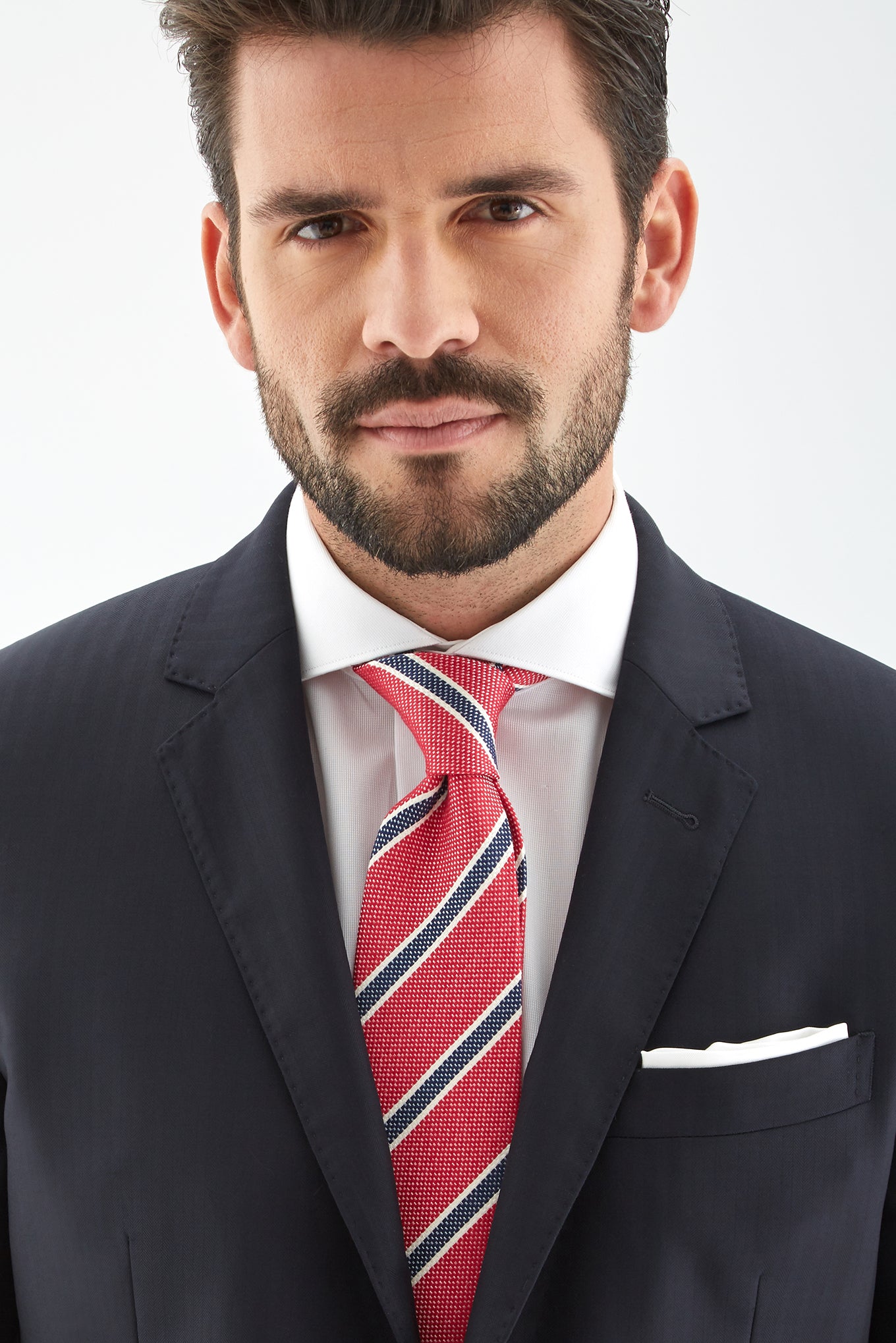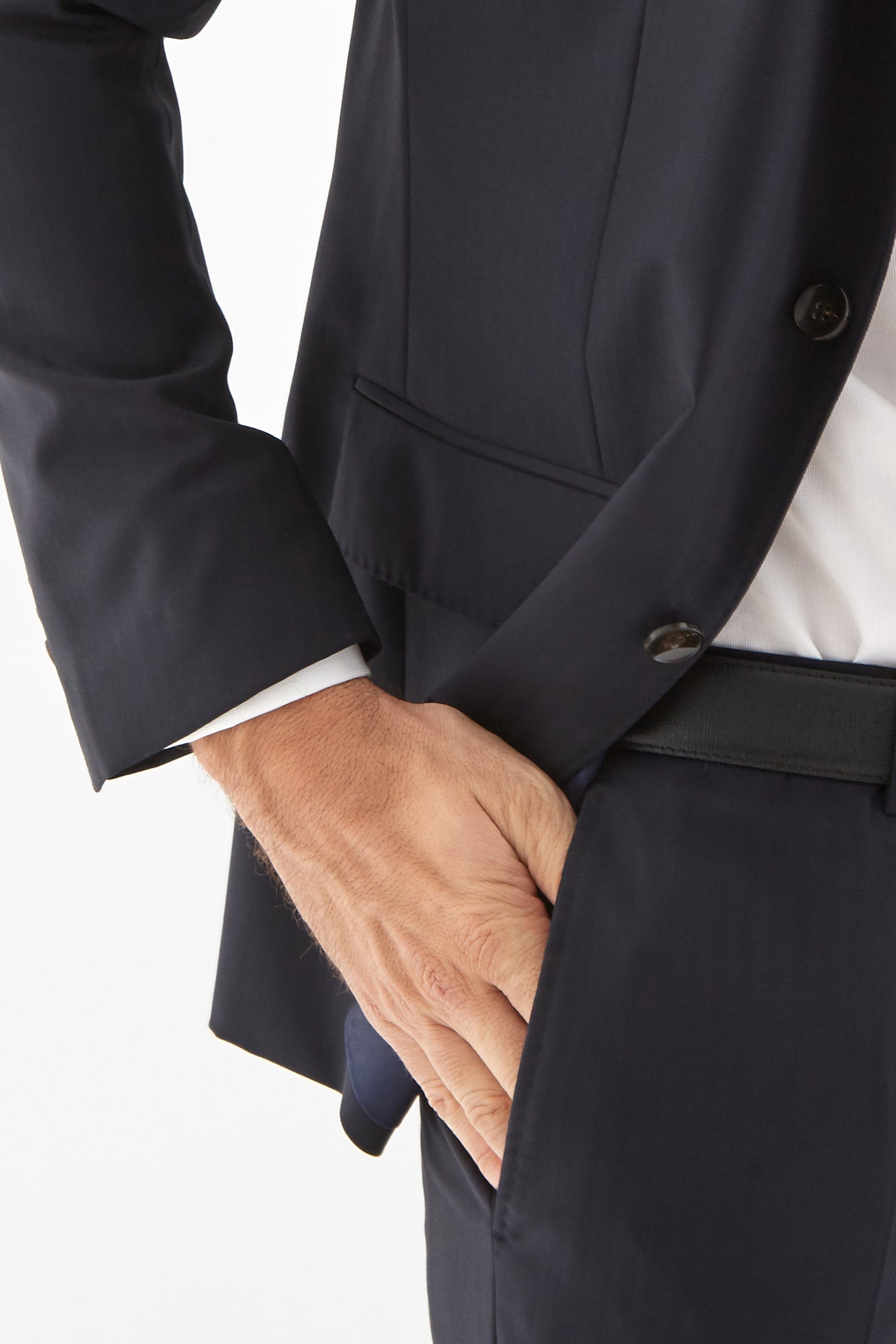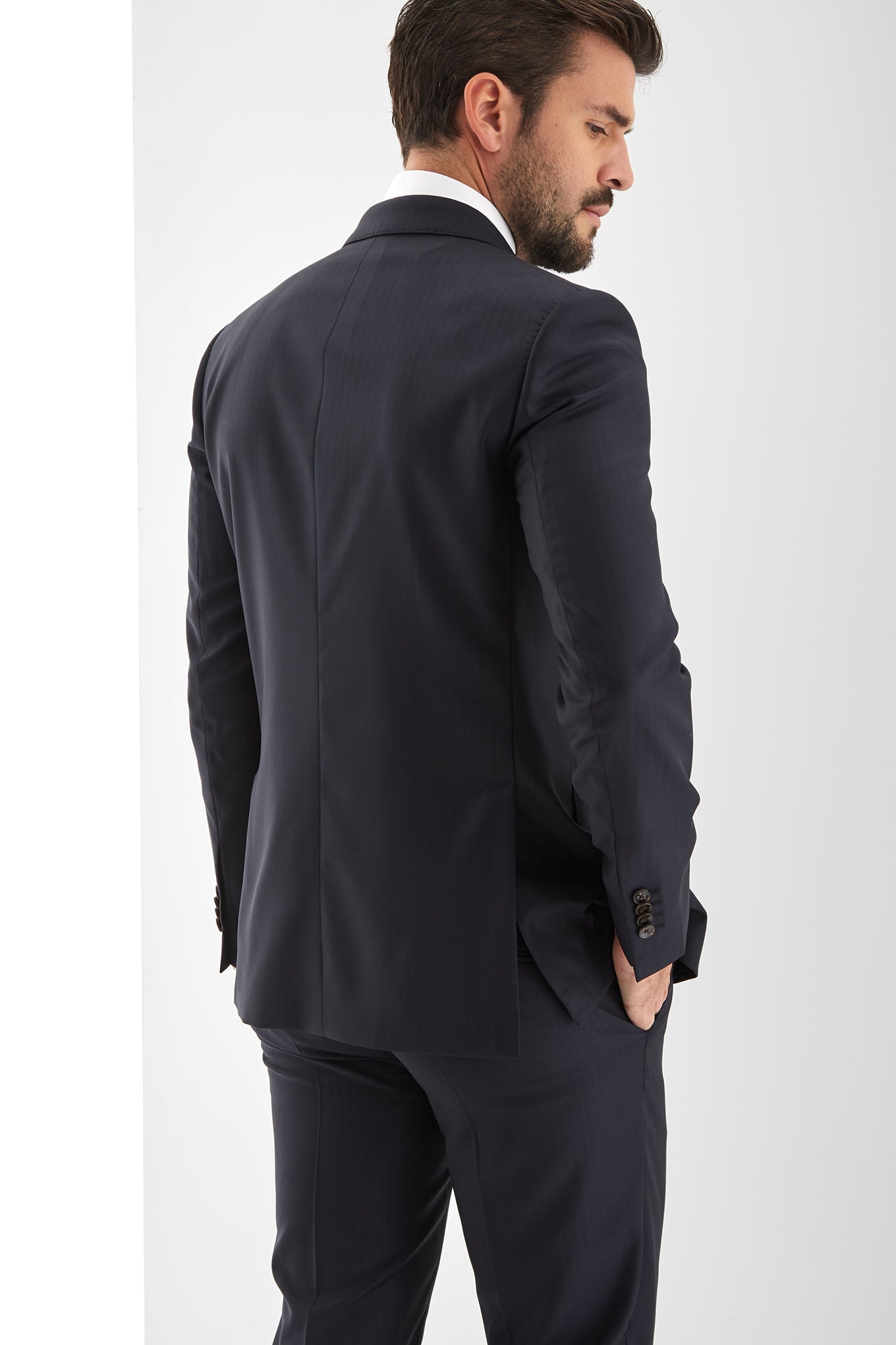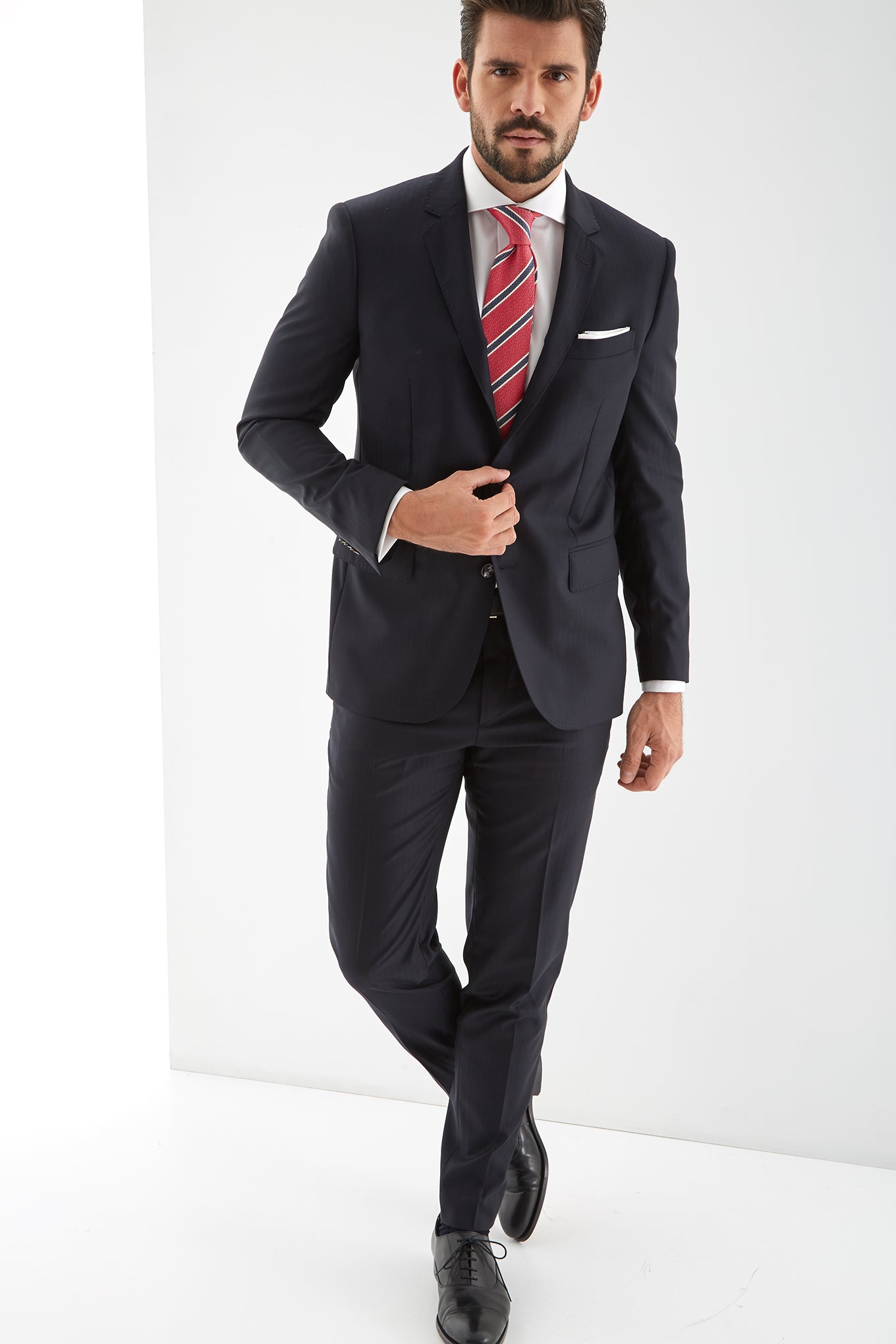Men's herringbone serge slim fit classic suit. Blazer with two-button fastening and four-button detail on the sleeve. Two side pockets, a chest pocket and three interior pockets. Back length on size 50 is 76cm. Trousers with zip and invisible button fastening. Features waist with belt loops and interior adherent material to fix the shirt. Ankle width on size 44 is 20 cm. Made of 130 high quality pure wool. Available at Sacoor Brothers' online store.
