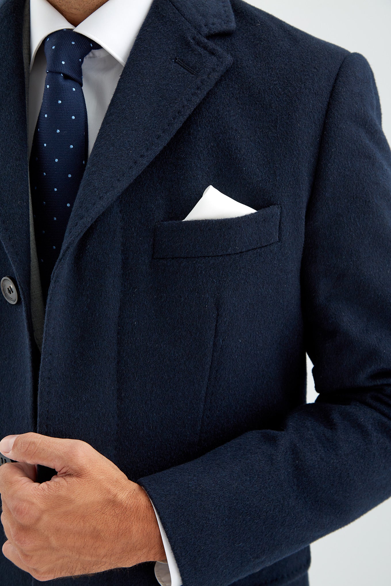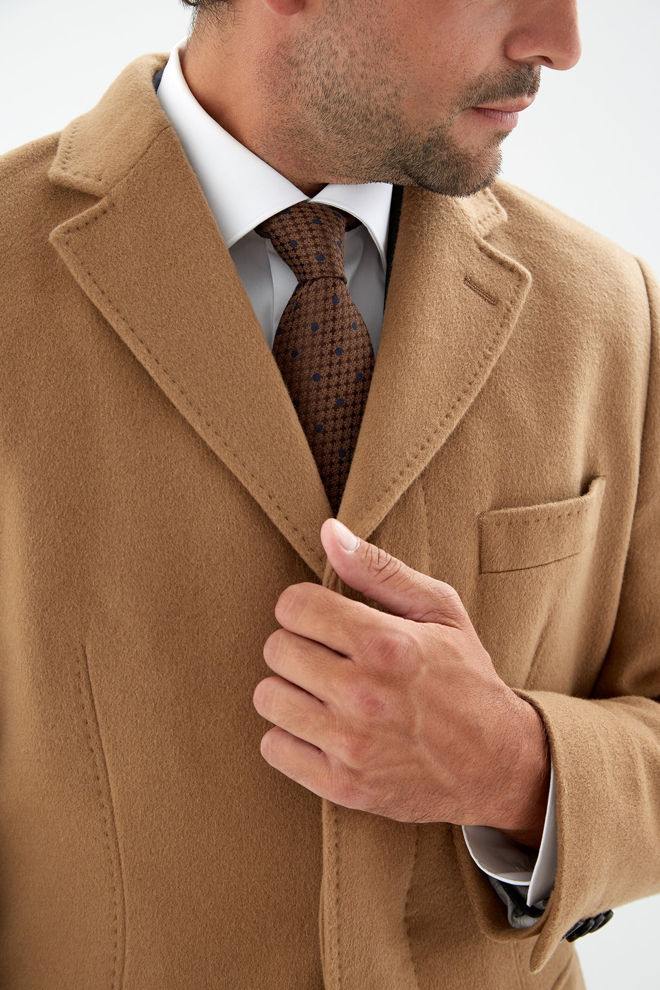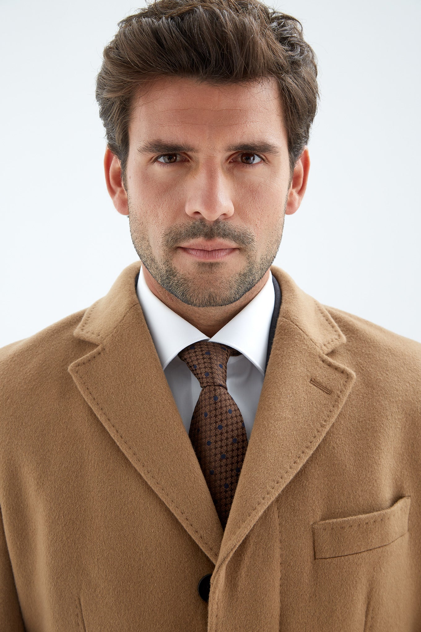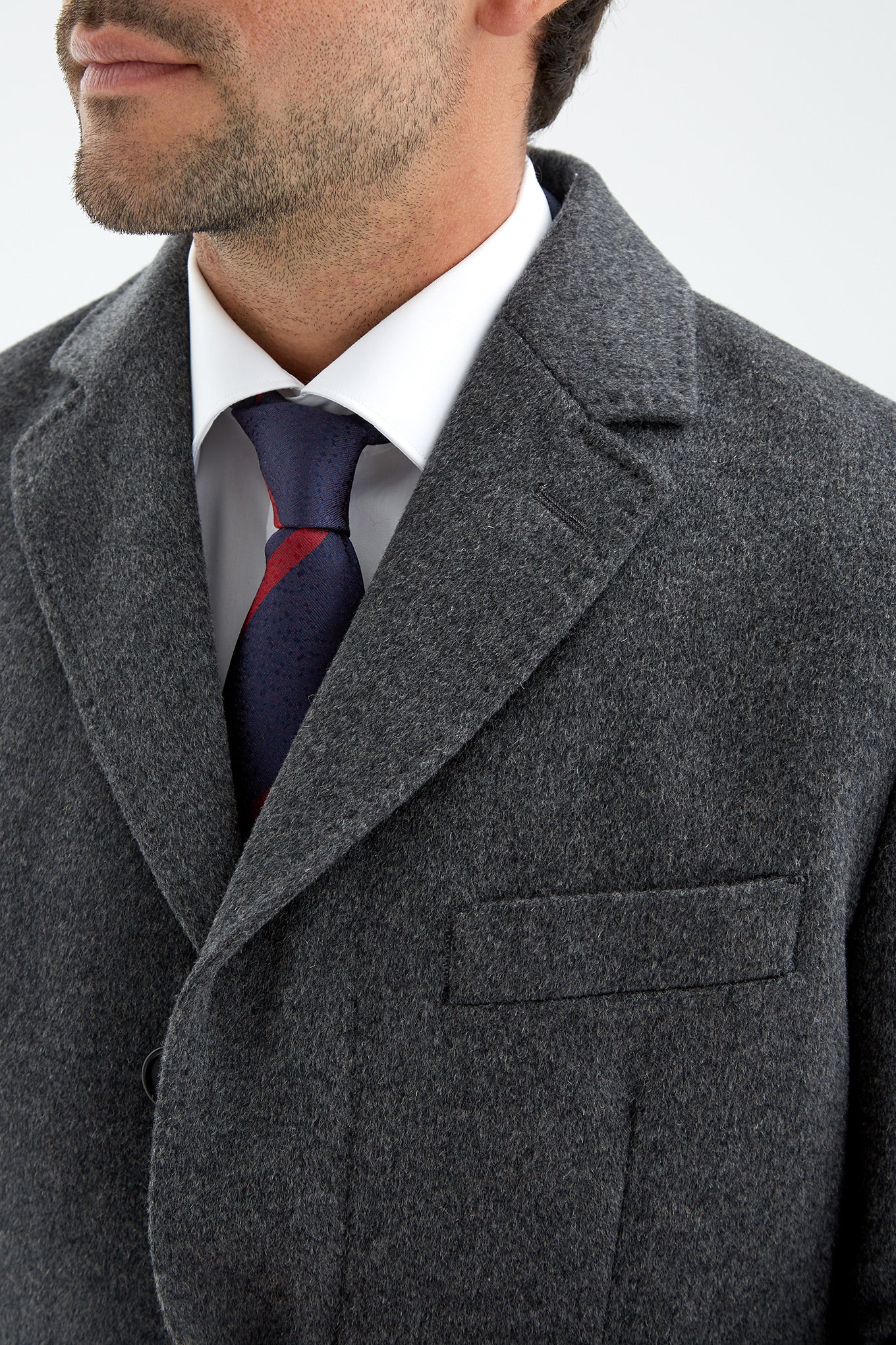 Men's wool and cashmere overcoat, a timeless and essential piece for the classic winter looks. Model with two pockets, one at chest height and three inside. Slight rear opening with a button. Closing with three invisible buttons.