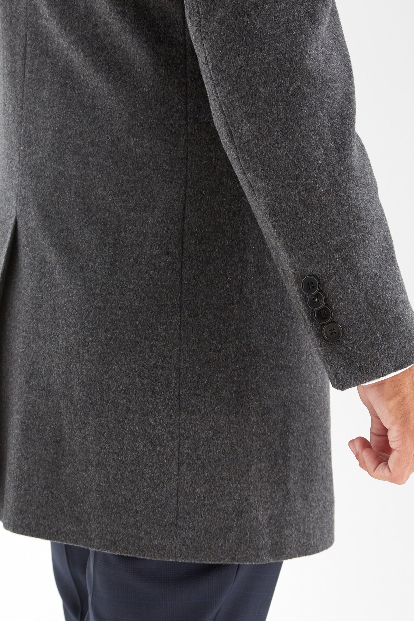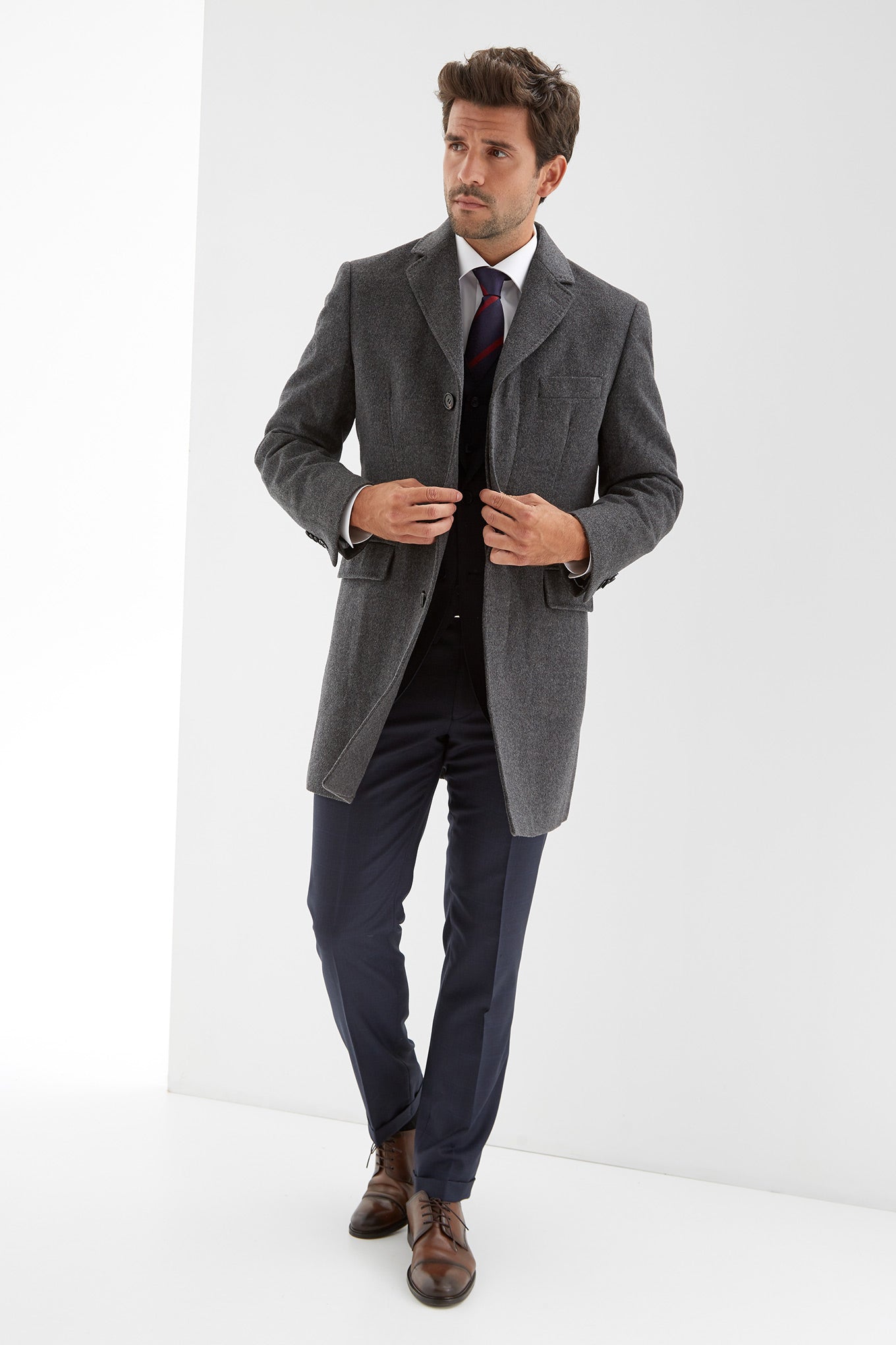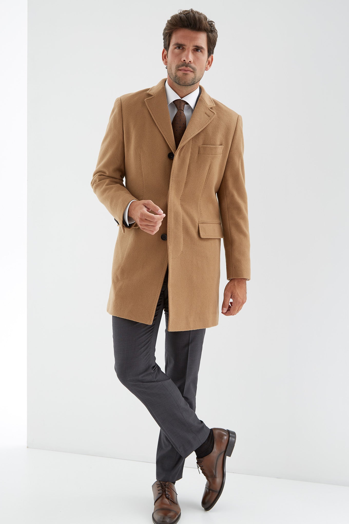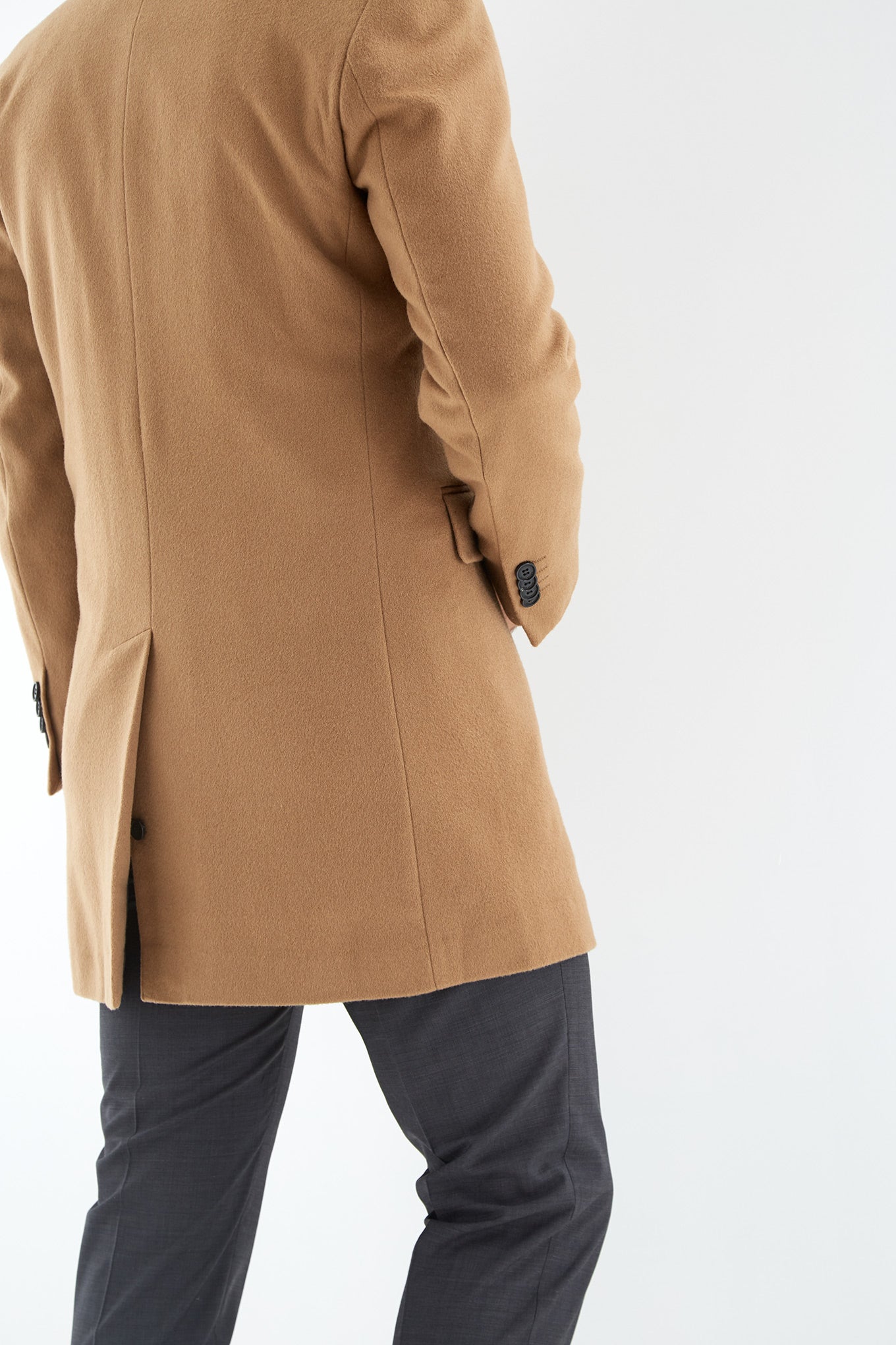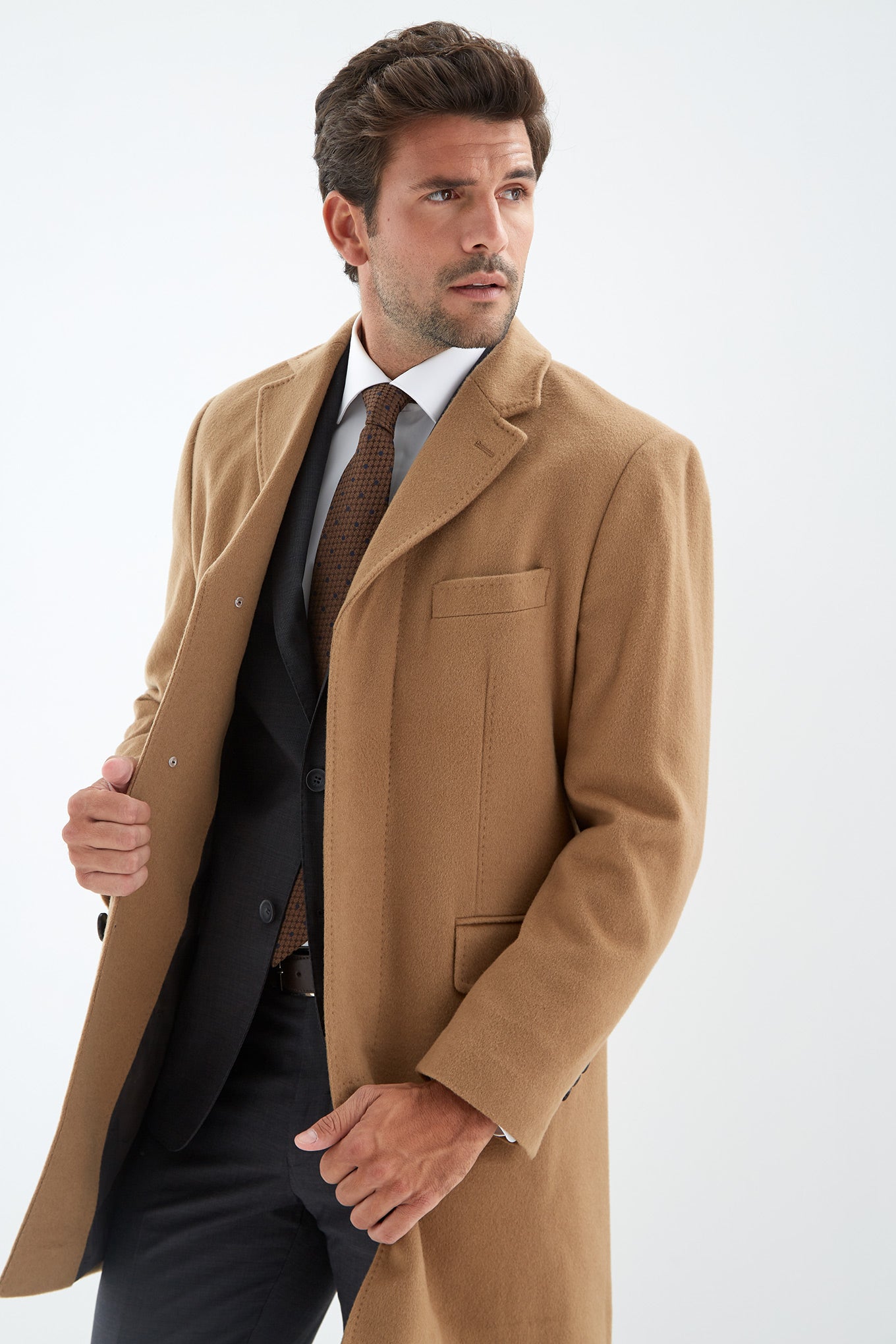 Men's wool and cashmere overcoat, a timeless and essential piece for the classic winter looks. Model with two pockets, one at chest height and three inside. Slight rear opening with a button. Closing with three invisible buttons.