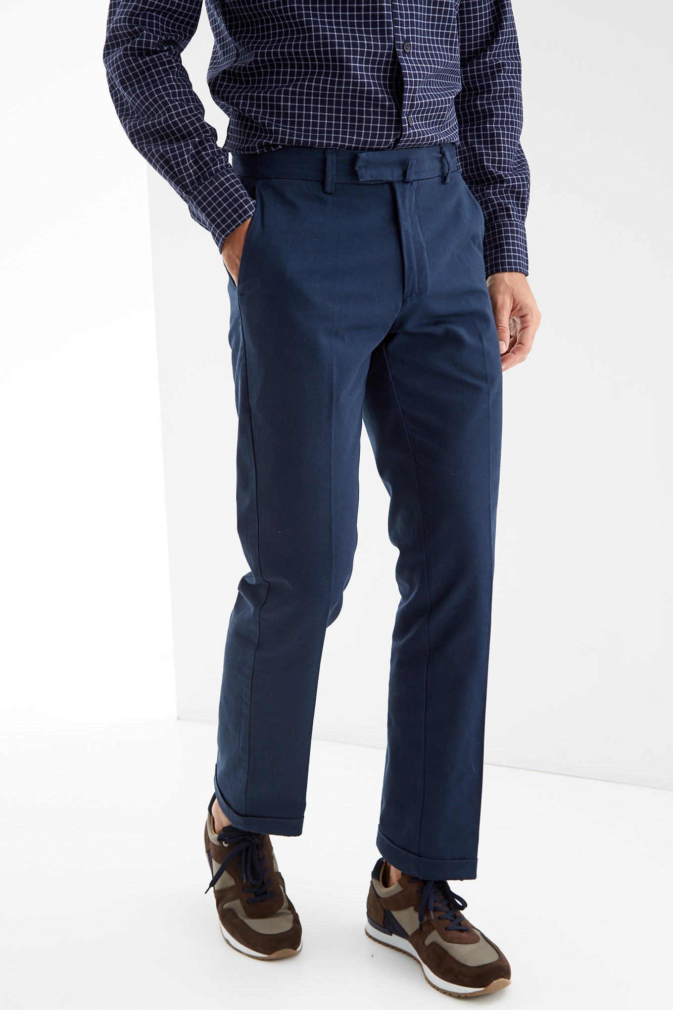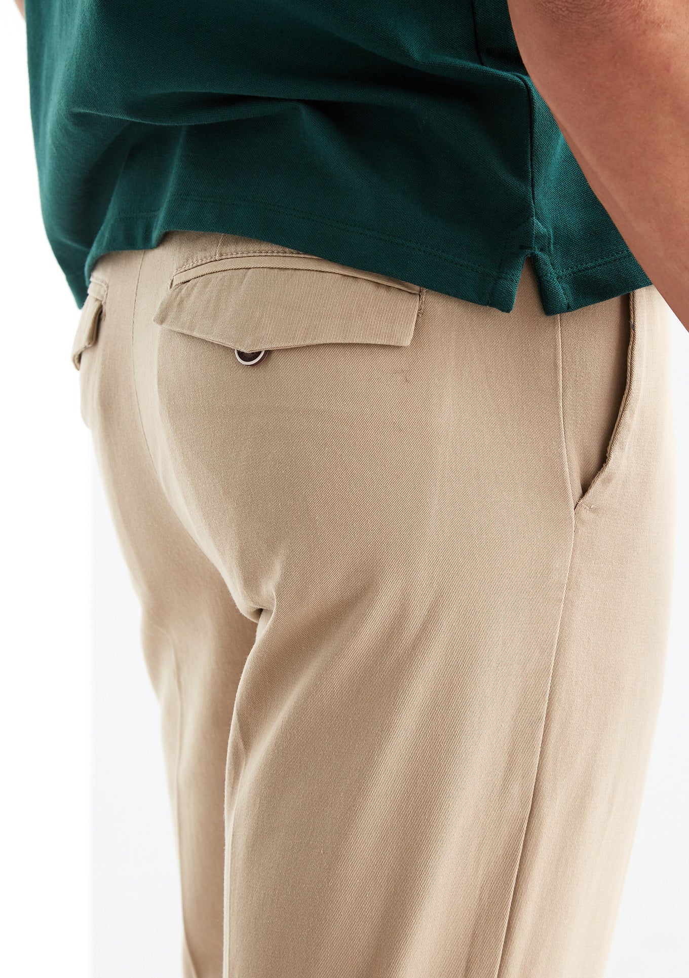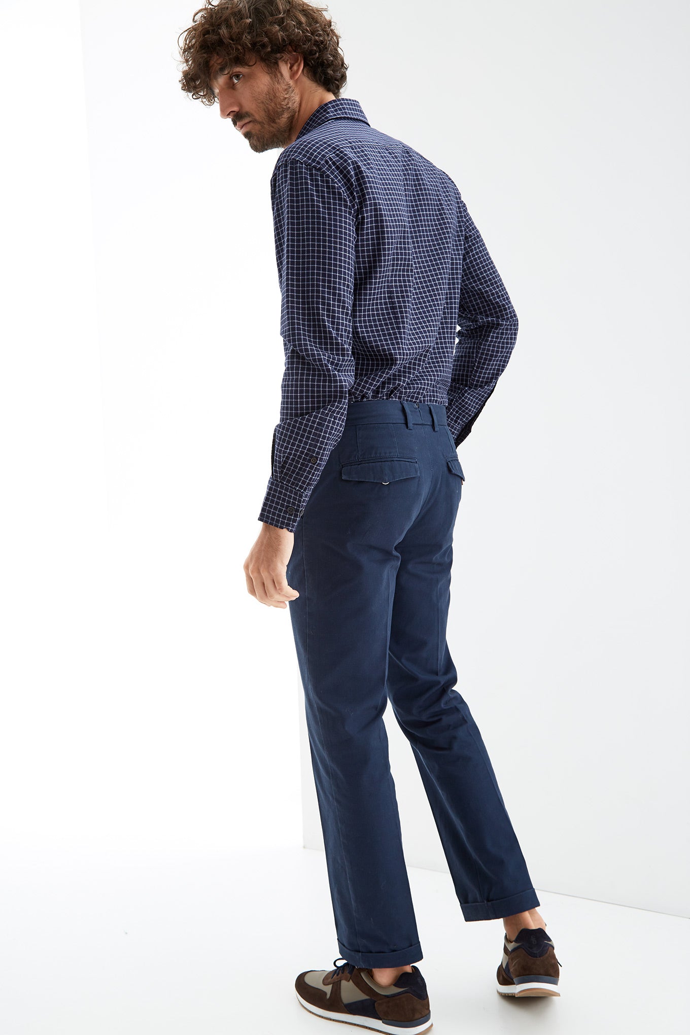 Men's regular fit chino trousers made 100% cotton. A must-have piece to complete any timeless closet. Featuring waist with belt loops, two buttons and zip fastening. Two side pockets and two front pockets with button fastening.