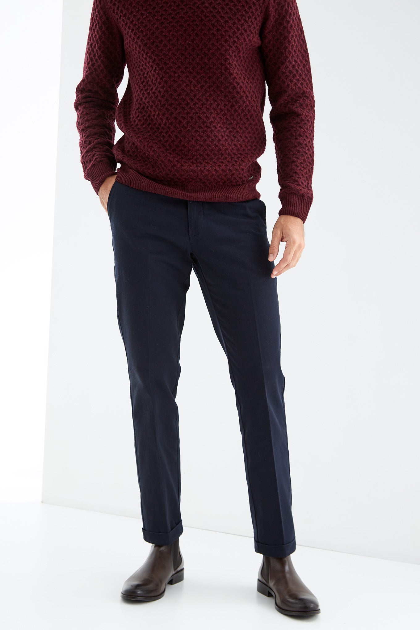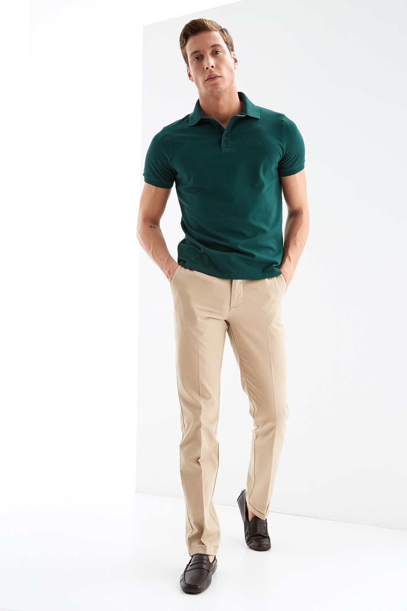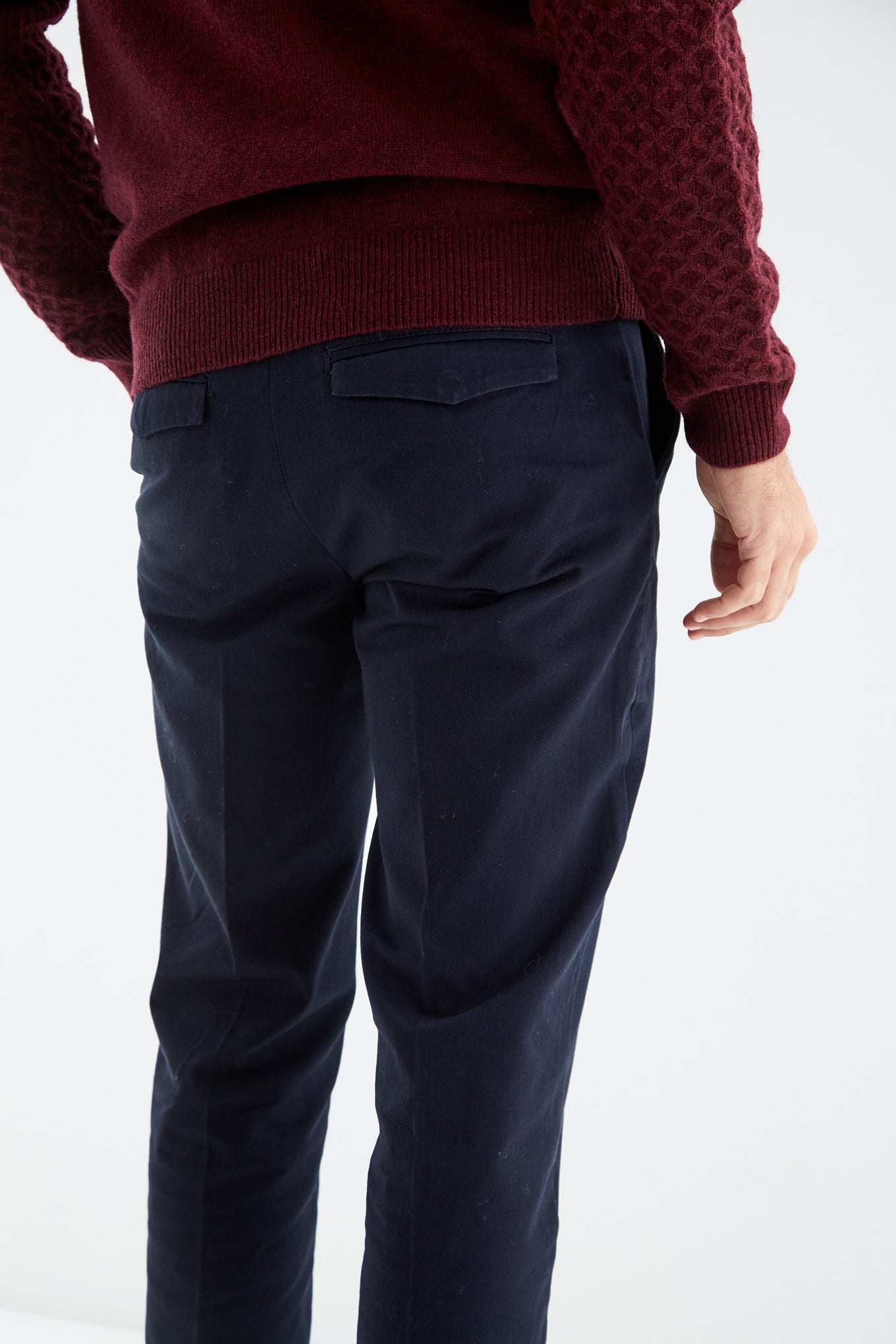 Men's regular fit chino trousers made 100% cotton. A must-have piece to complete any timeless closet. Featuring waist with belt loops, two buttons and zip fastening. Two side pockets and two front pockets with button fastening.