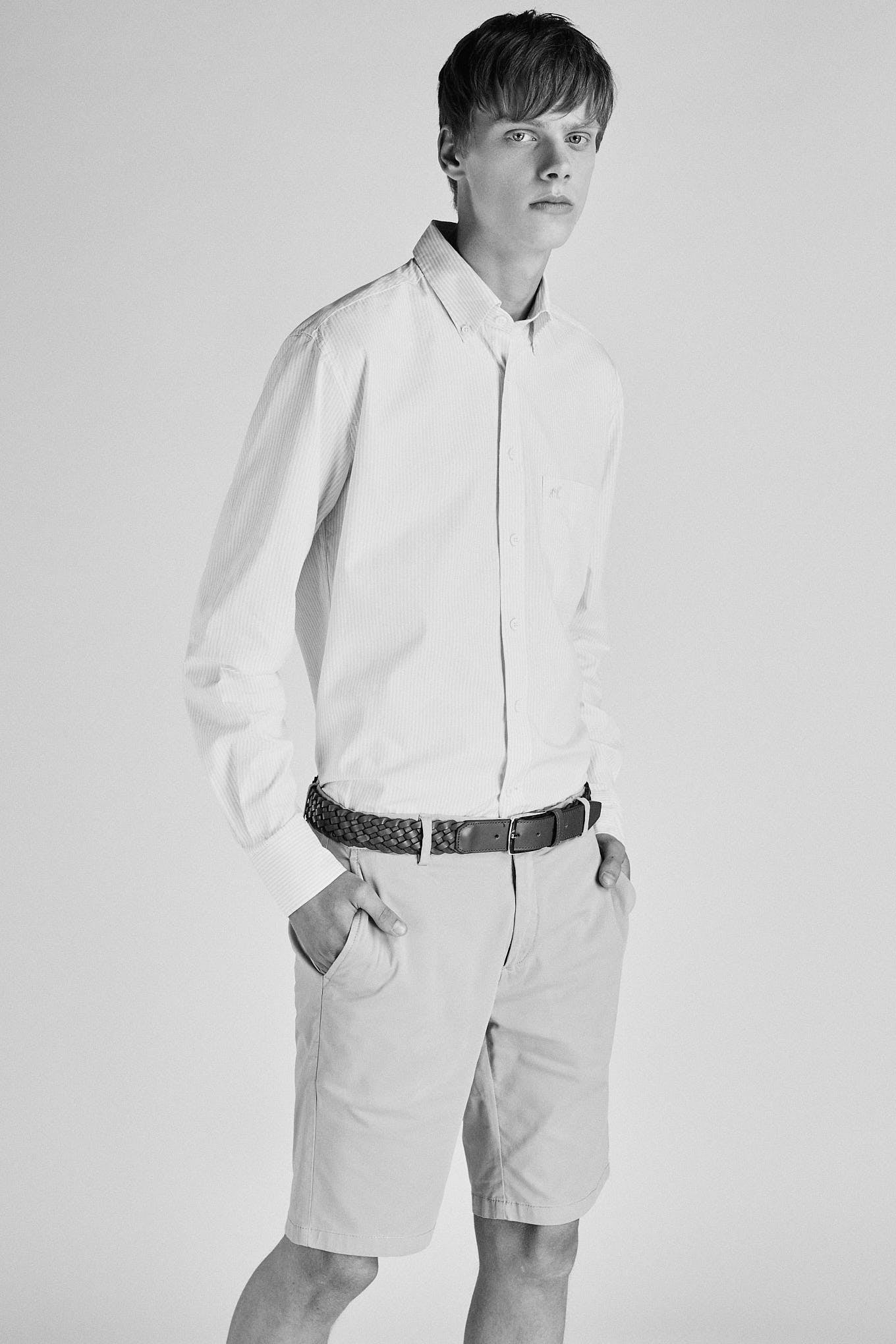 Men's striped shirt. Open collar with buttons. Brand logo embroidered on chest pocket. English stitching, more comfortable with a quality finish. Side support from triangular seams. Brand name on sleeves, next to the cuff. A relaxed and versatile shirt. The back length of size 40 is 80 cm and the sleeve length is 66 cm. See our Size Guide.