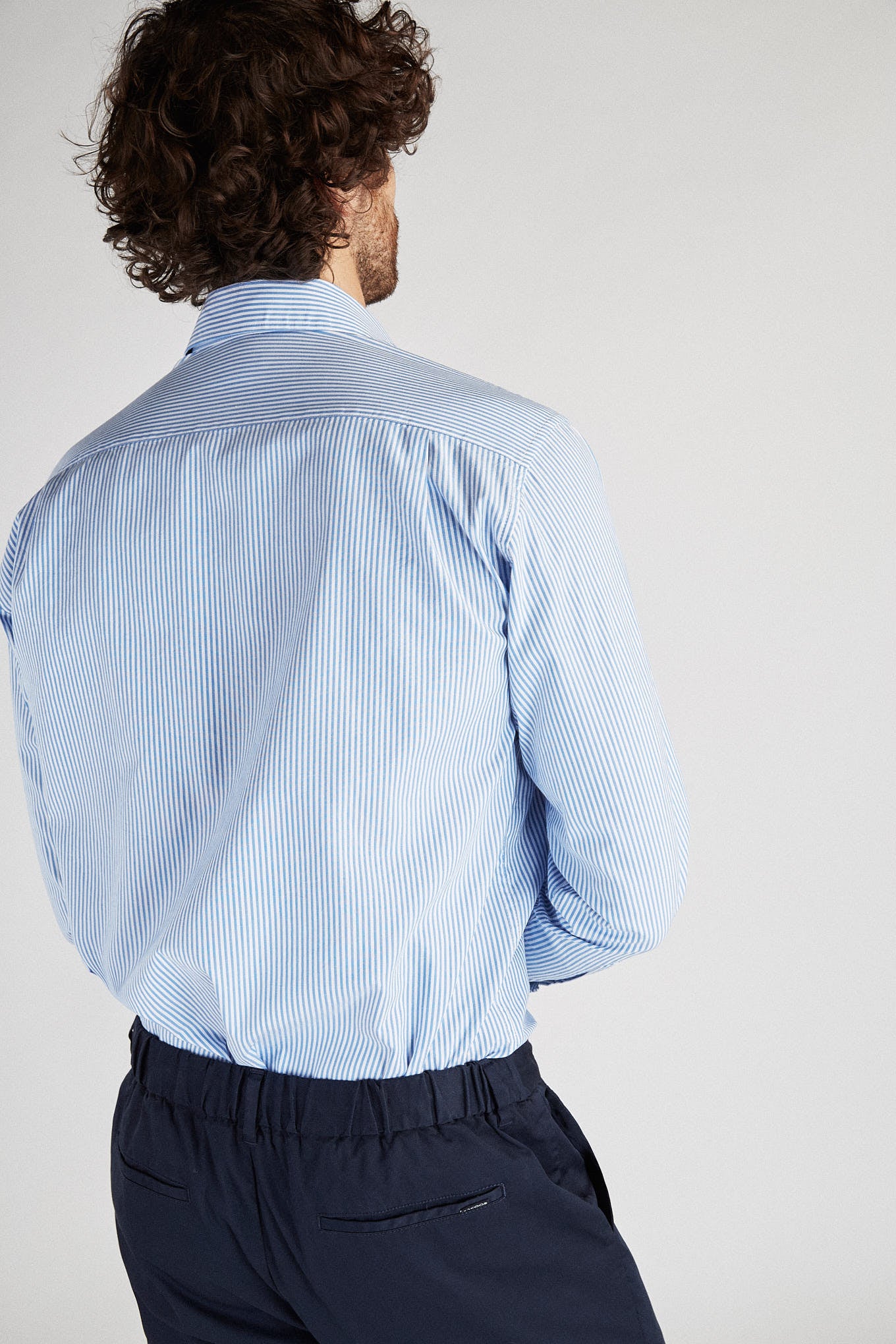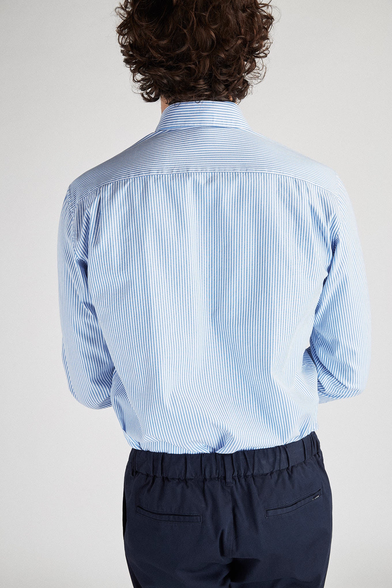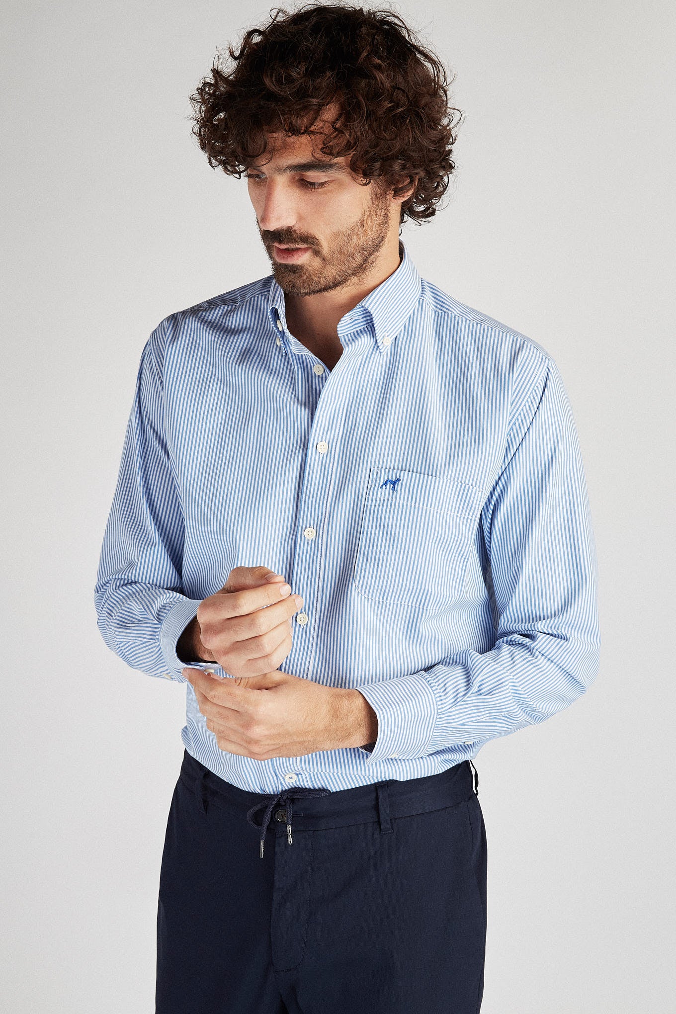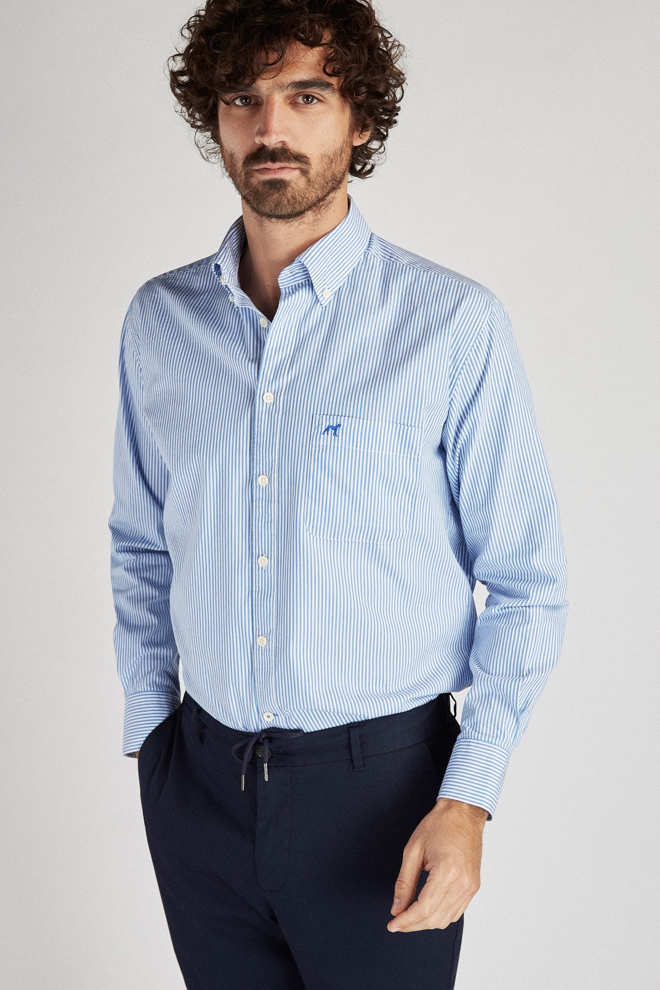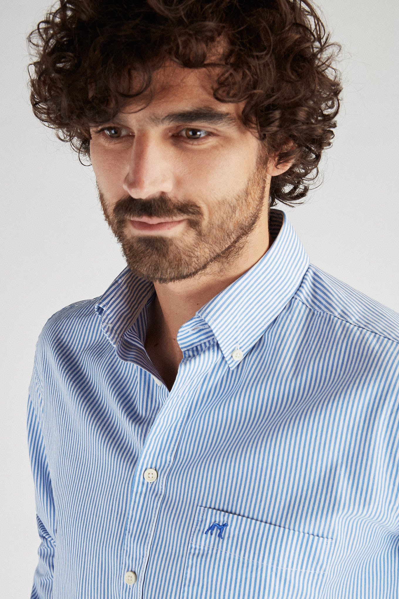 Men's striped shirt. Open collar with buttons. Brand logo embroidered on chest pocket. English stitching, more comfortable with a quality finish. Side support from triangular seams. Brand name on sleeves, next to the cuff. A relaxed and versatile shirt. The back length of size 40 is 80 cm and the sleeve length is 66 cm. See our Size Guide.