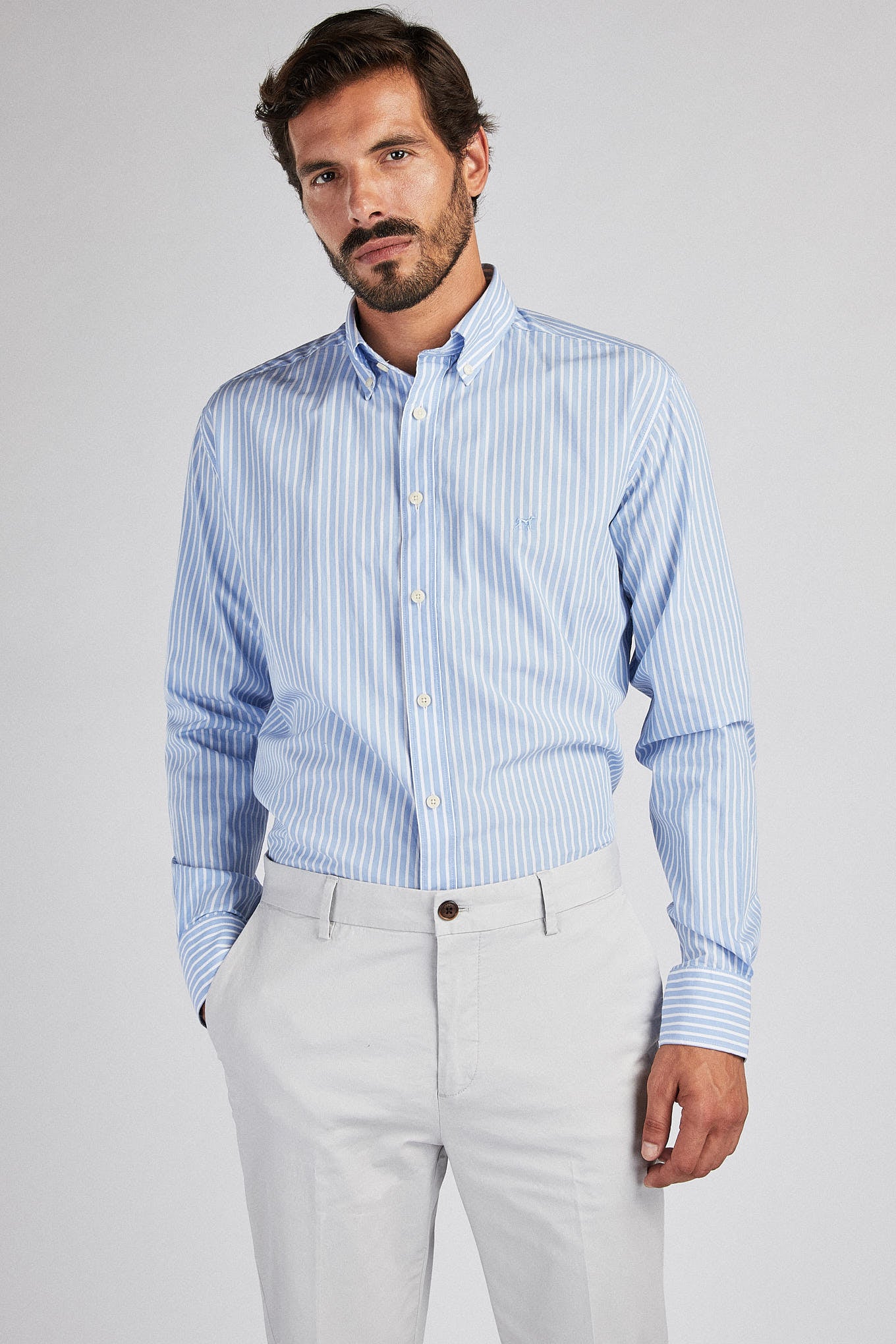 Men's shirt with striped pattern, 100% cotton. Open collar with buttons. Sacoor logo embroidered on chest pocket. Brand customisation at cuffs. English stitching, more comfortable and for a quality finish. Side support of triangular seams. You can wear it with your jeans or chinos. The back length of size 40 is 78 cm and the sleeve length is 66 cm. See our Size Guide.