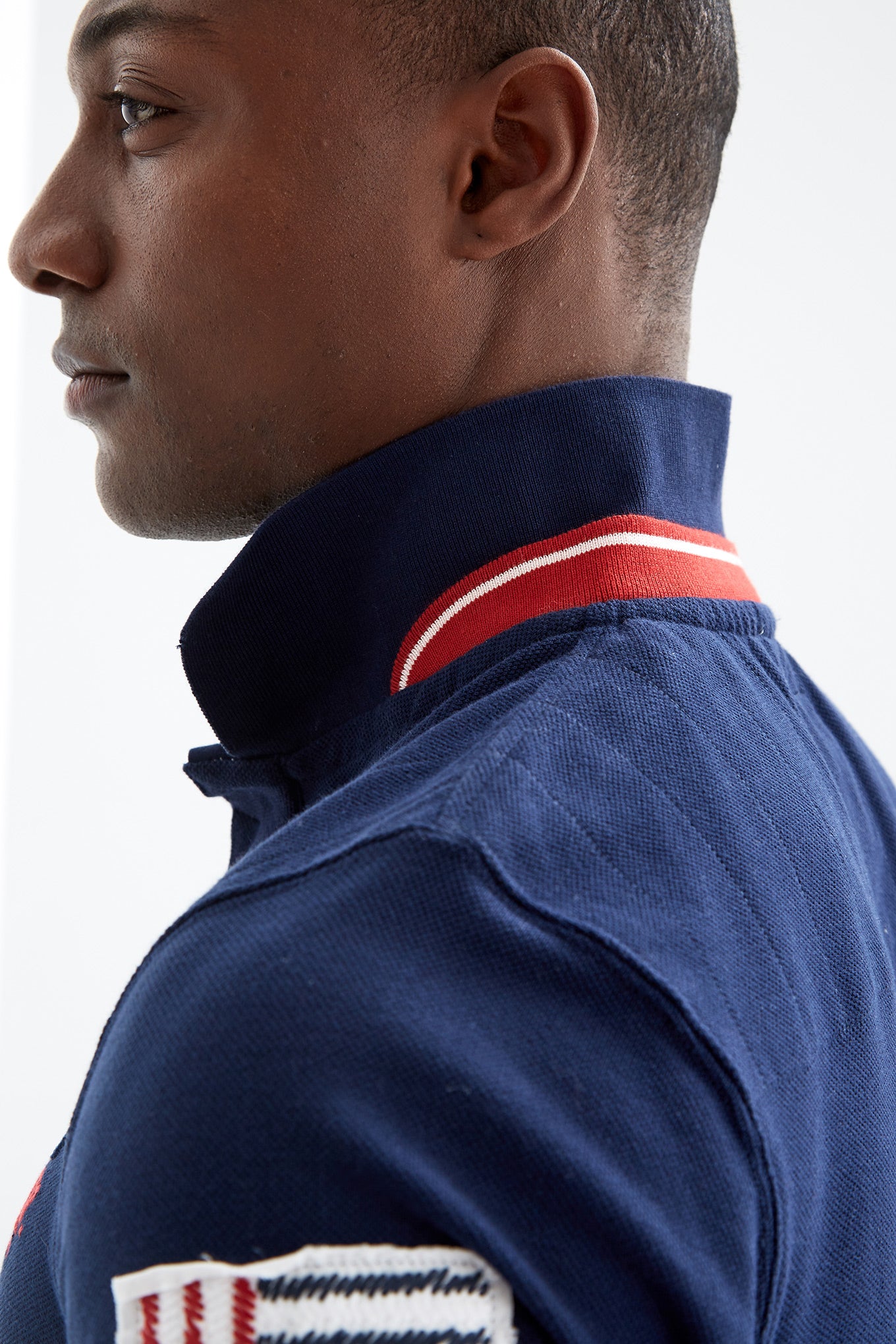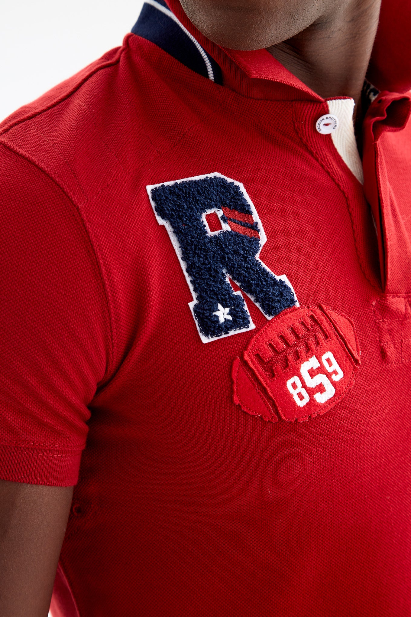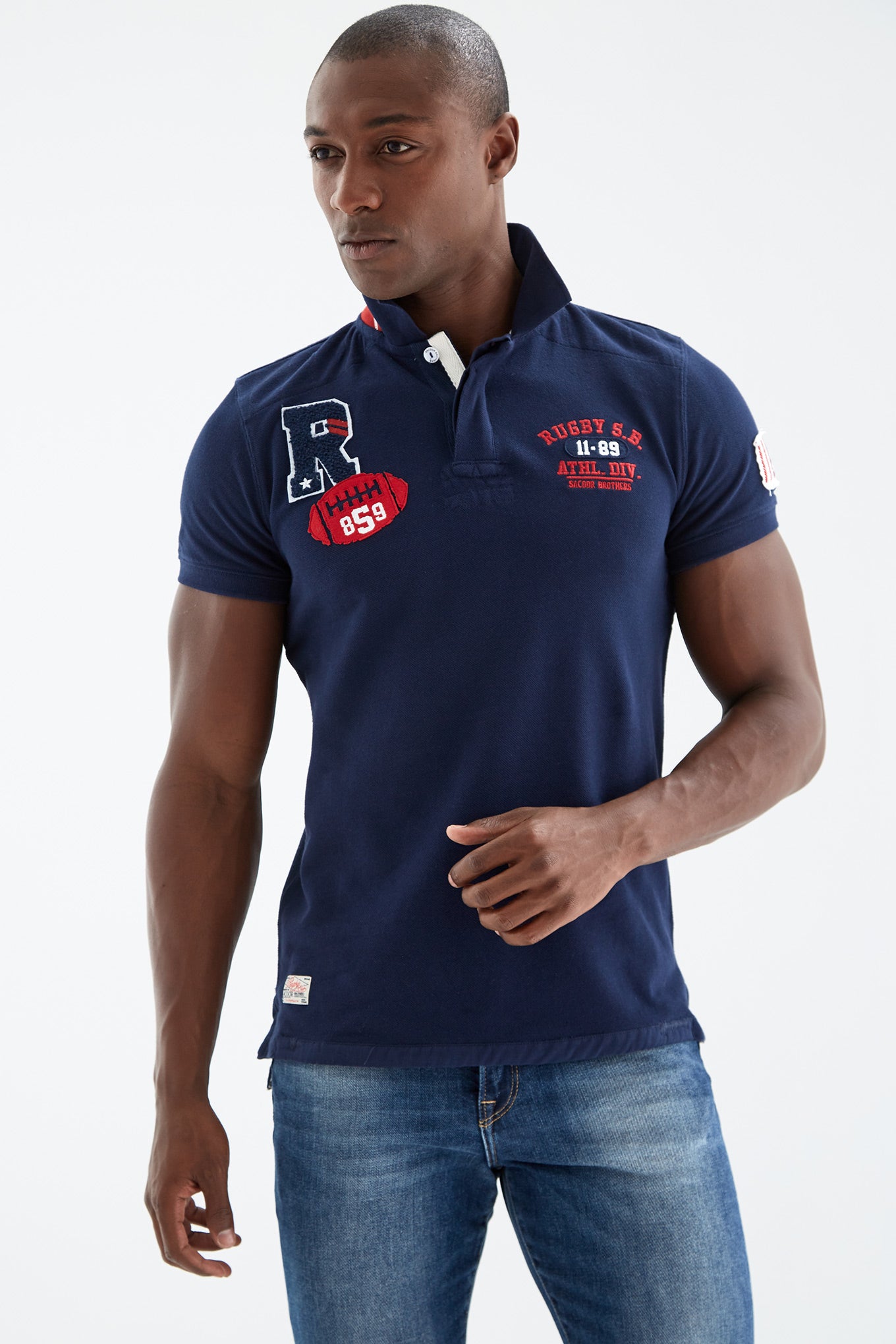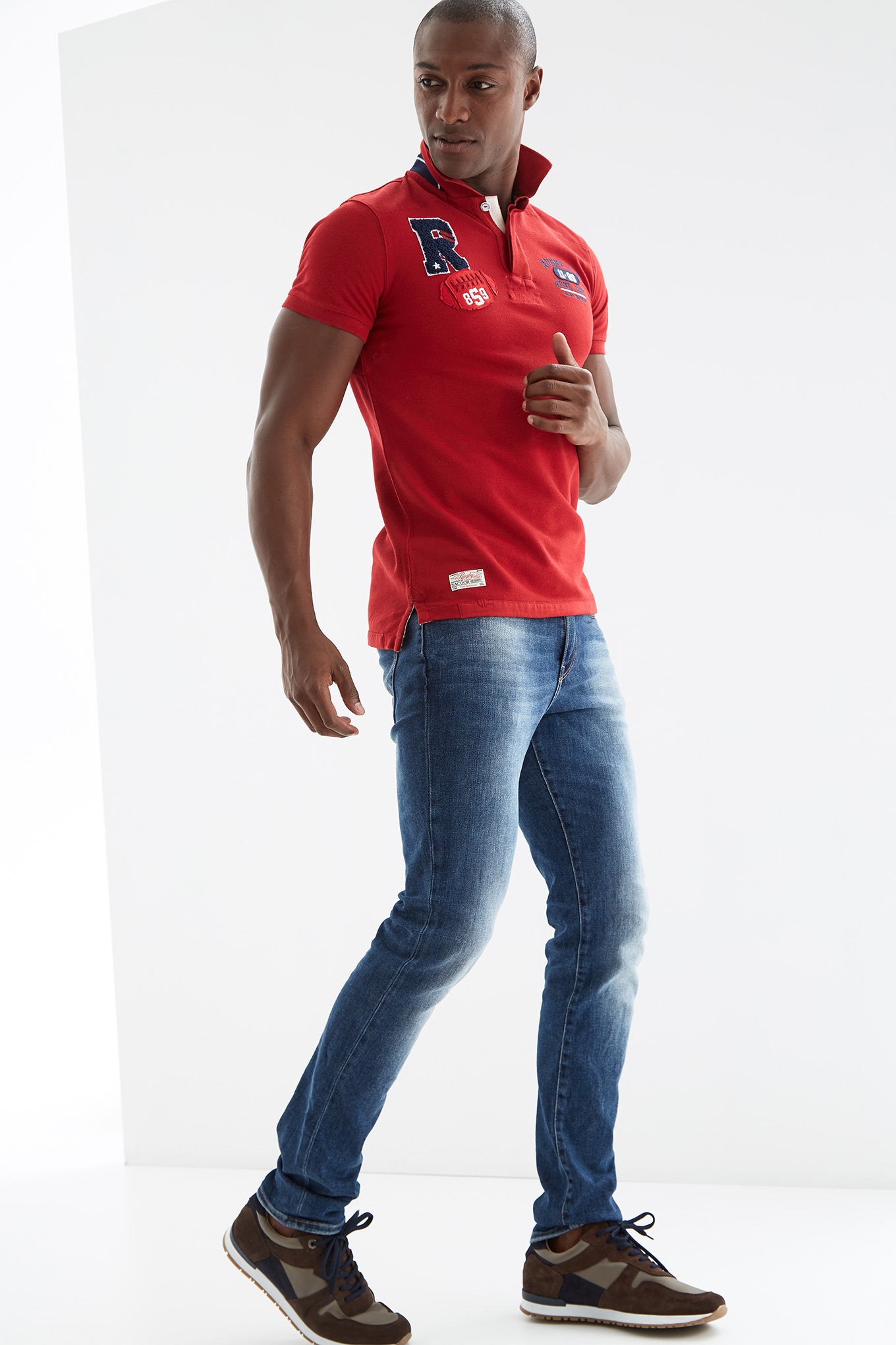 Men's slim fit short sleeved jersey polo shirt. Made of pure cotton. Classic neckline with rivet button fastening. Embroidered details on the chest and sleeves.