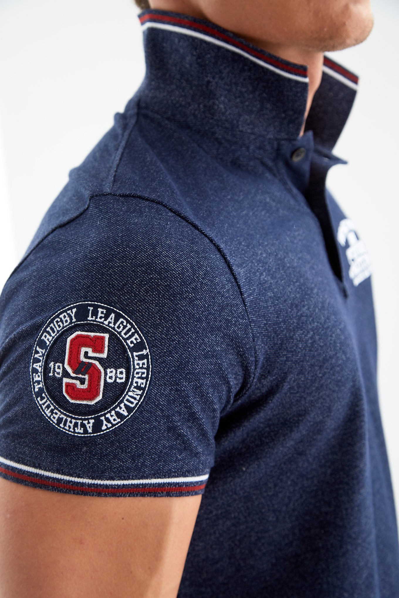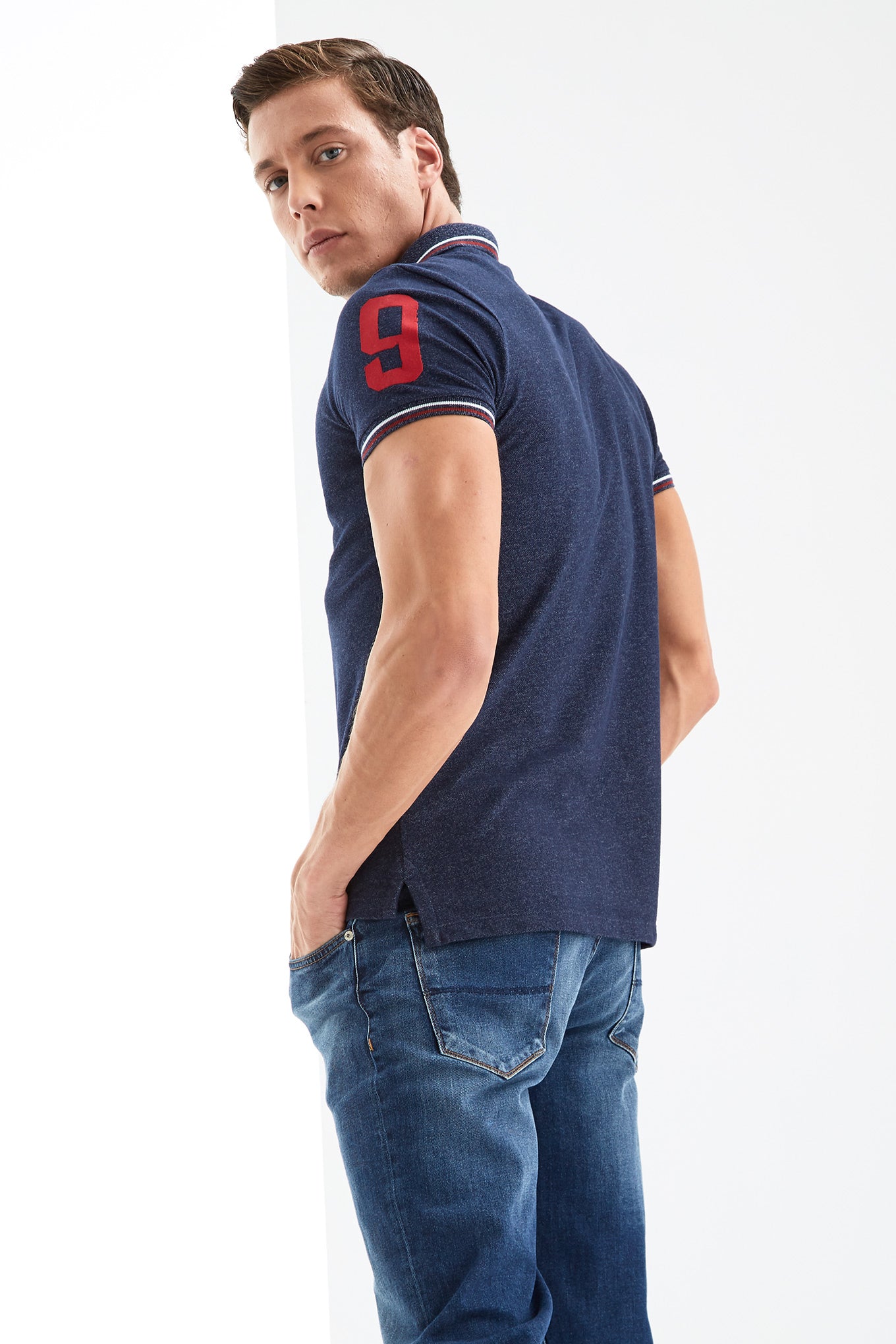 Men's slim fit short sleeved jersey polo shirt. Made of cotton. Classic neckline with rivet button fastening. Embroidered details on the chest and sleeves.