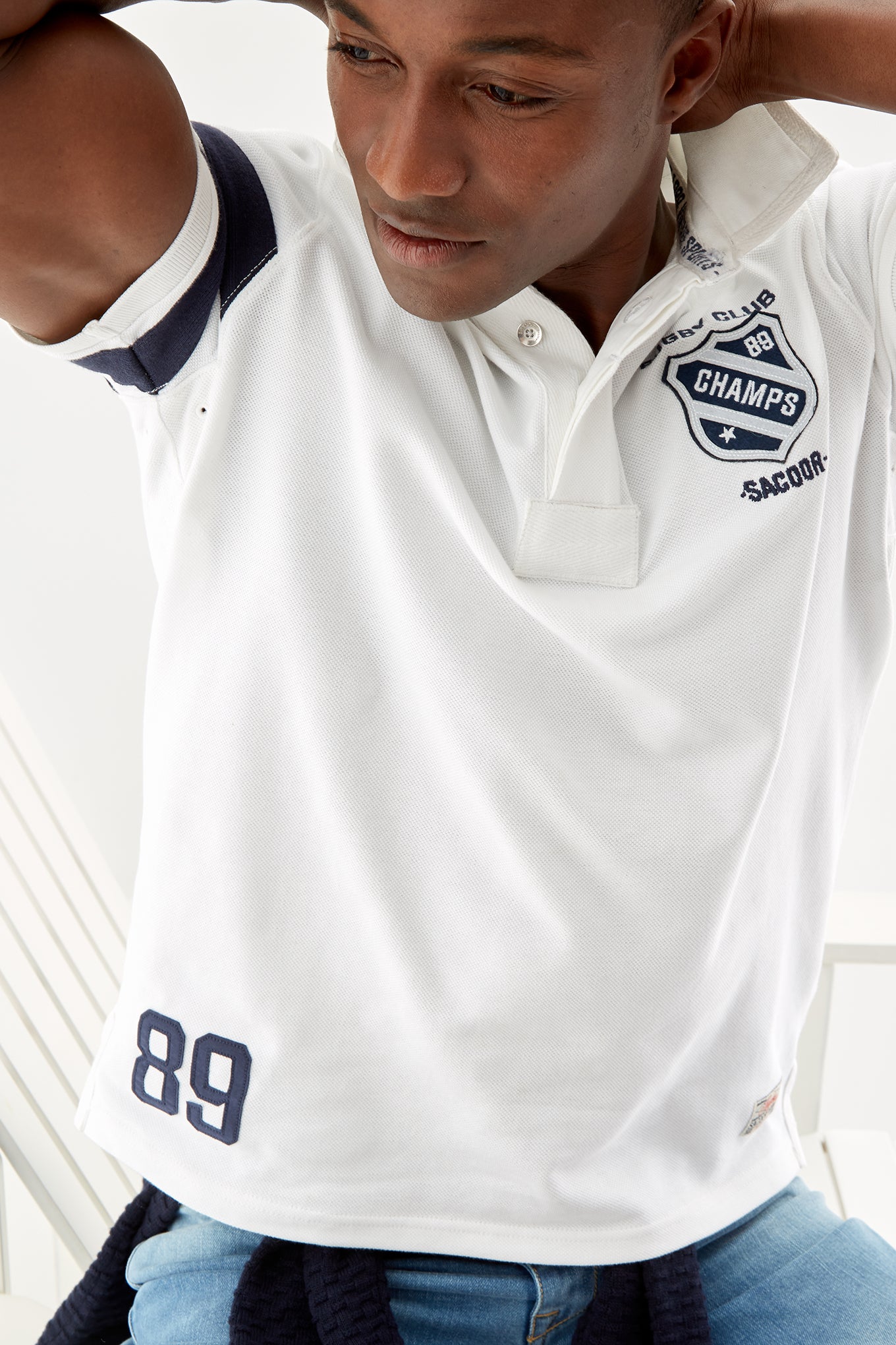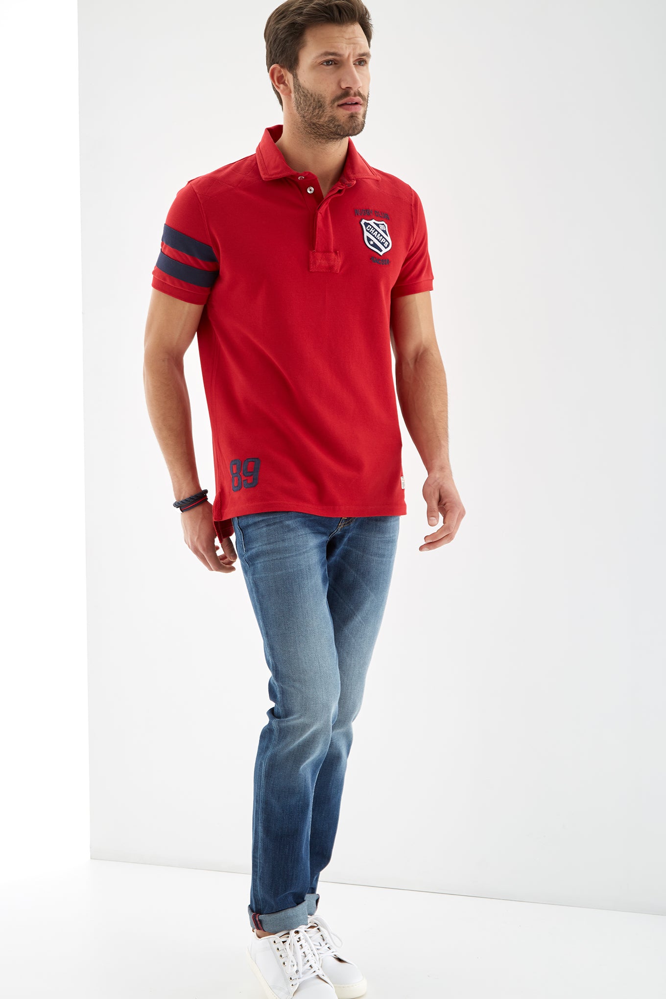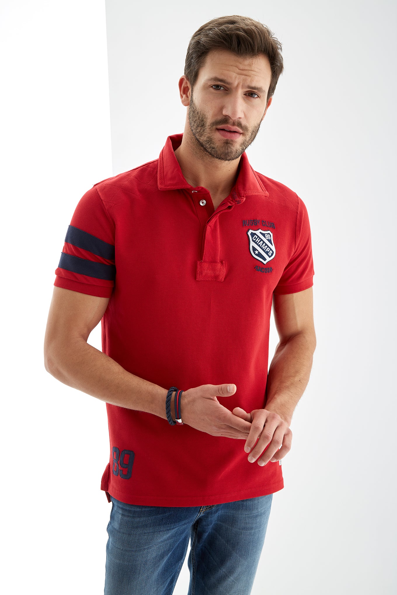 Men's slim fit knitted sports polo. Classic neckline and short sleeves with two-stripe detail on one sleeve. Embroidered and patch detail on the chest and number 89 detail embroidered on the bottom right. Made of pure cotton. Available at Sacoor Brothers' online store.