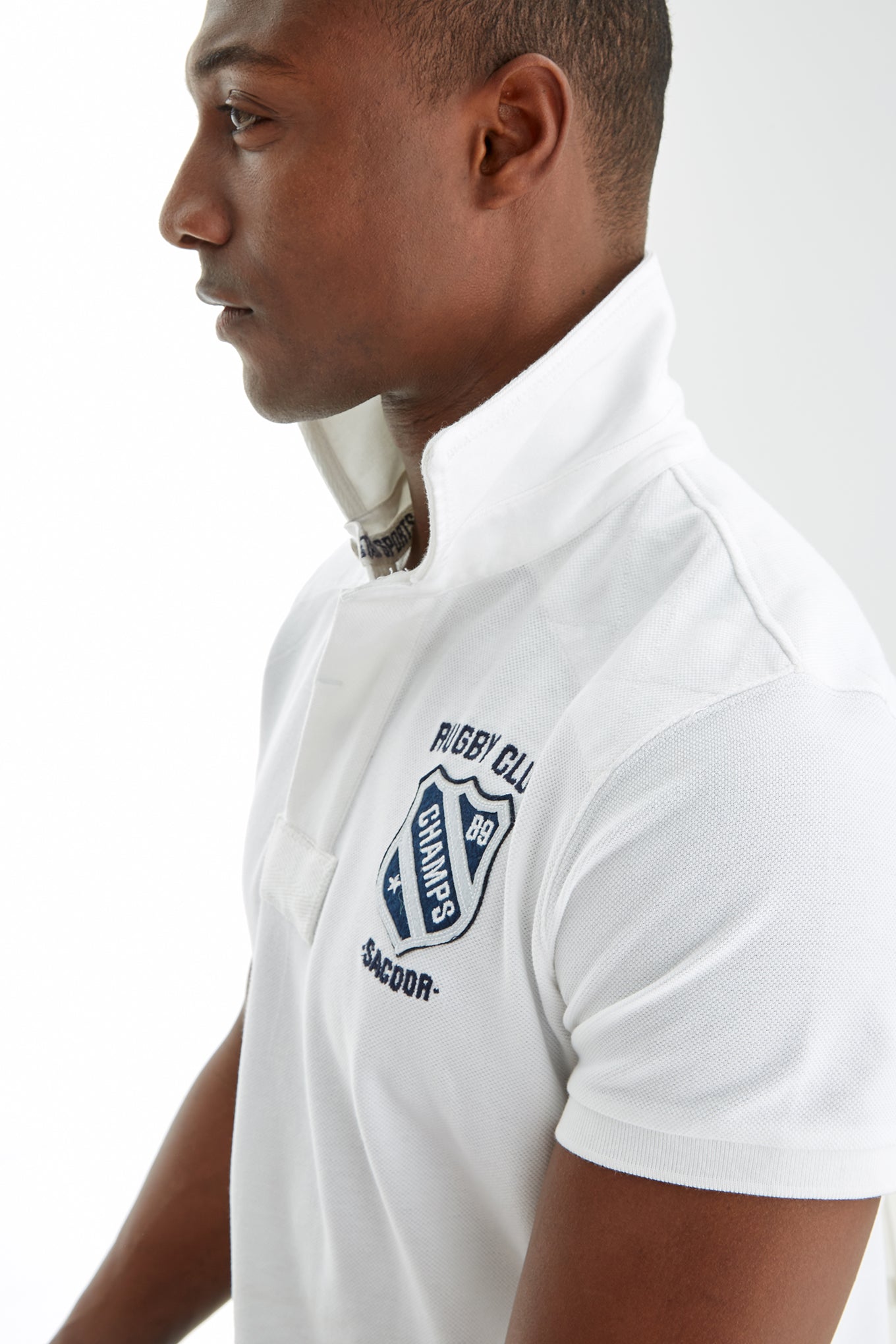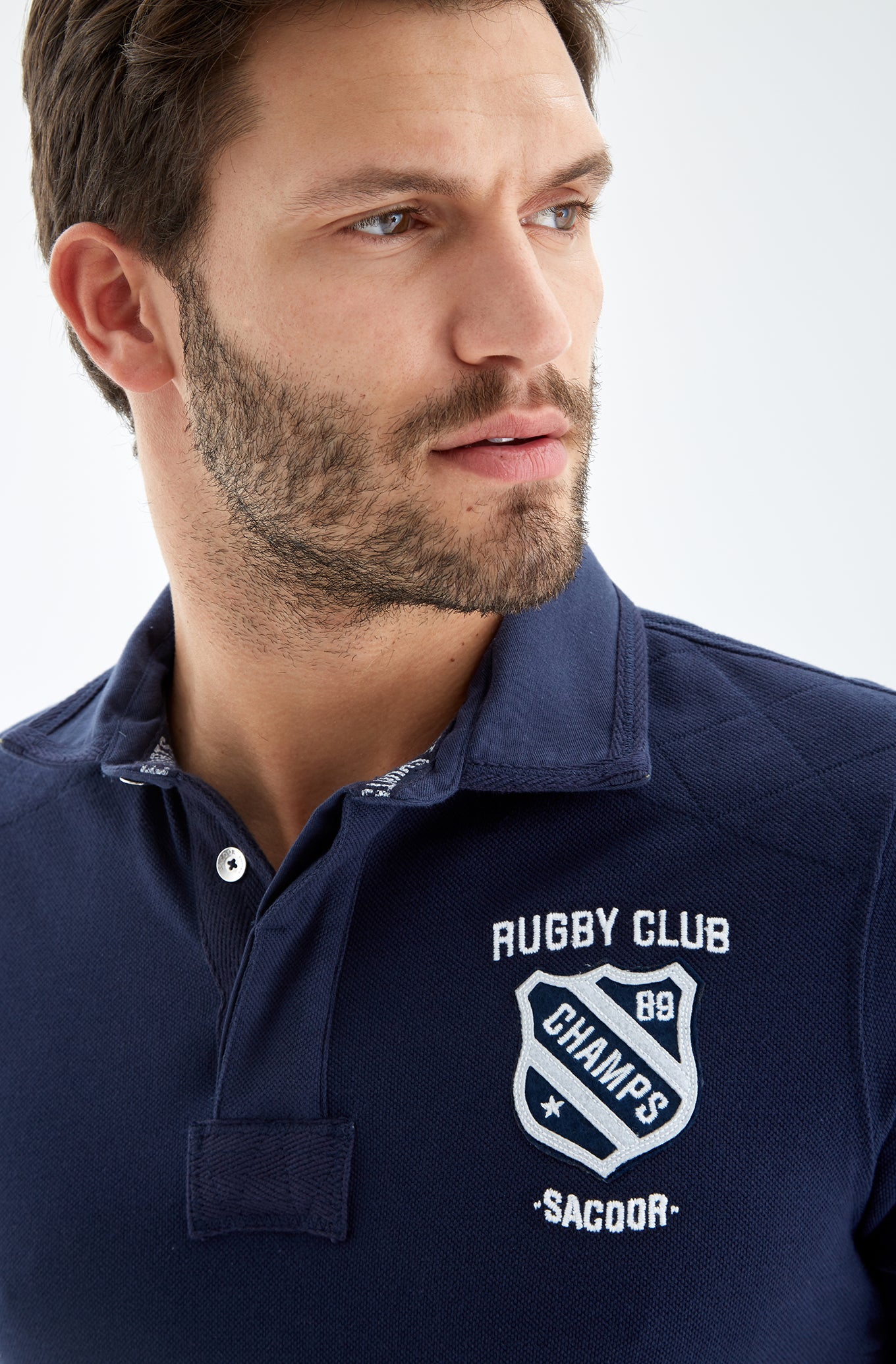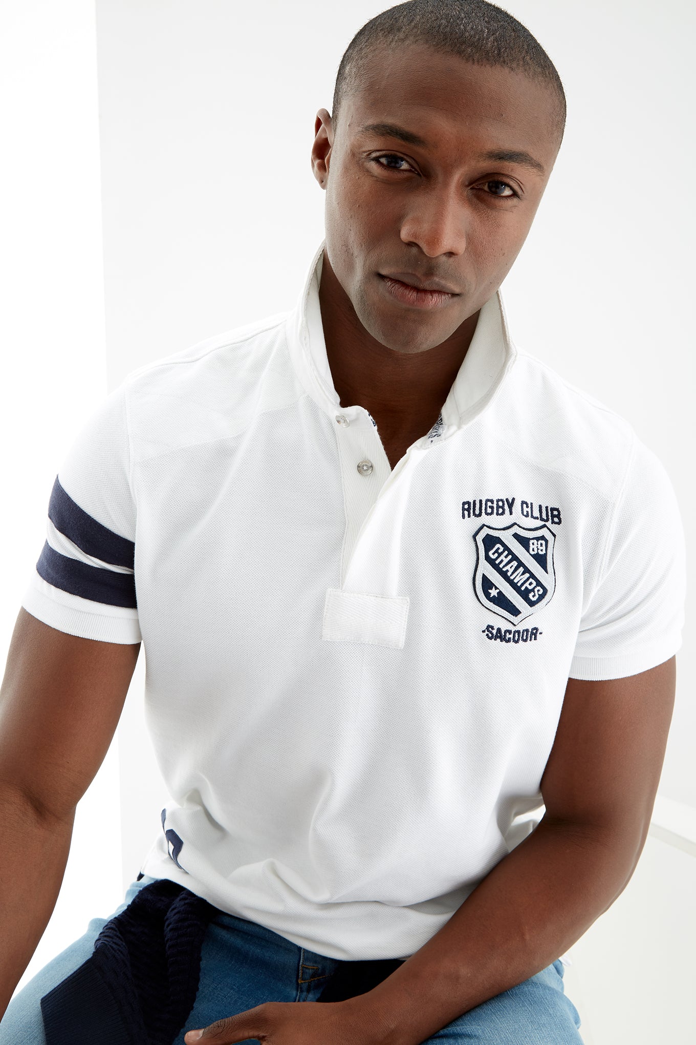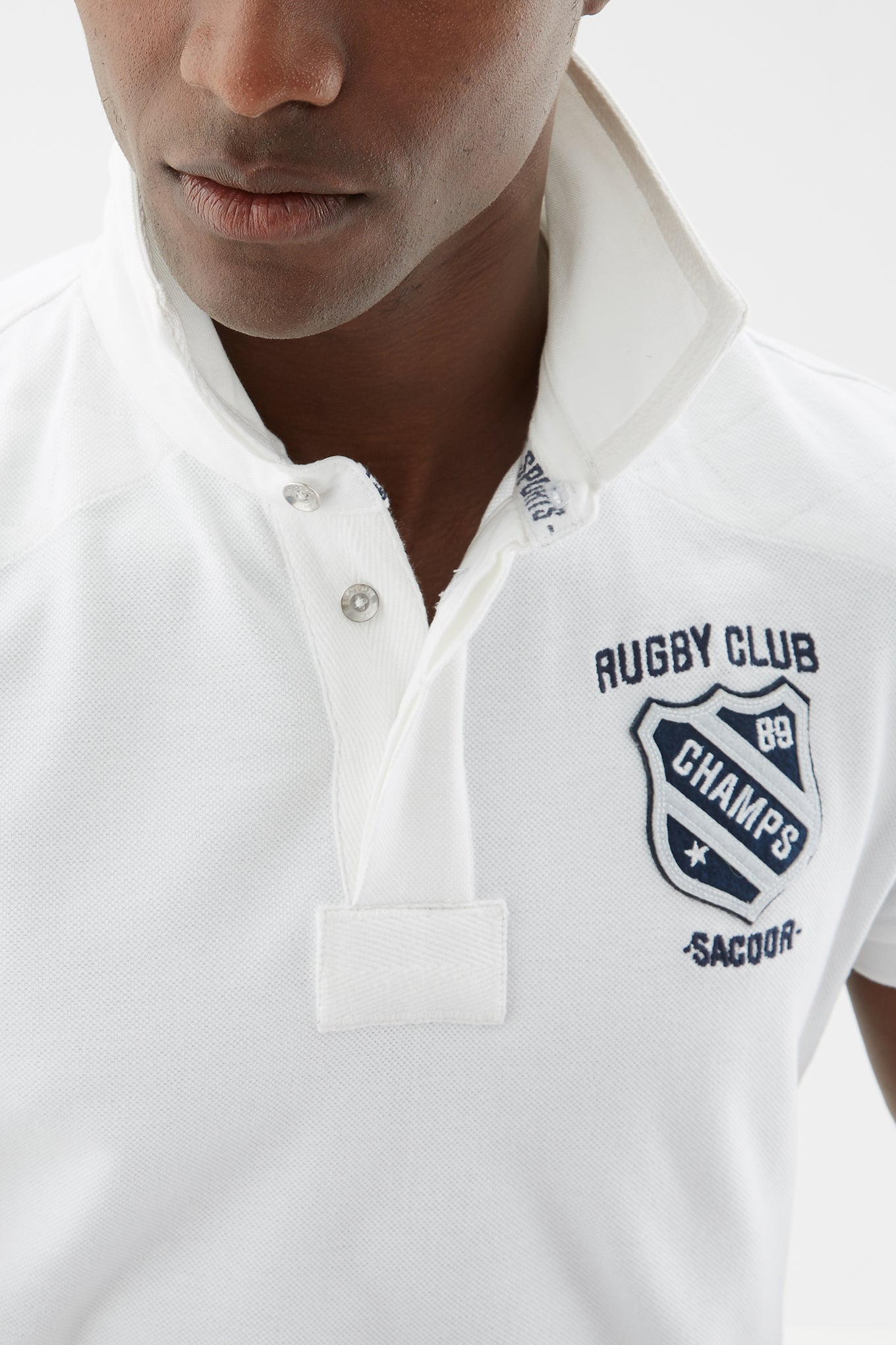 Men's slim fit knitted sports polo. Classic neckline and short sleeves with two-stripe detail on one sleeve. Embroidered and patch detail on the chest and number 89 detail embroidered on the bottom right. Made of pure cotton. Available at Sacoor Brothers' online store.