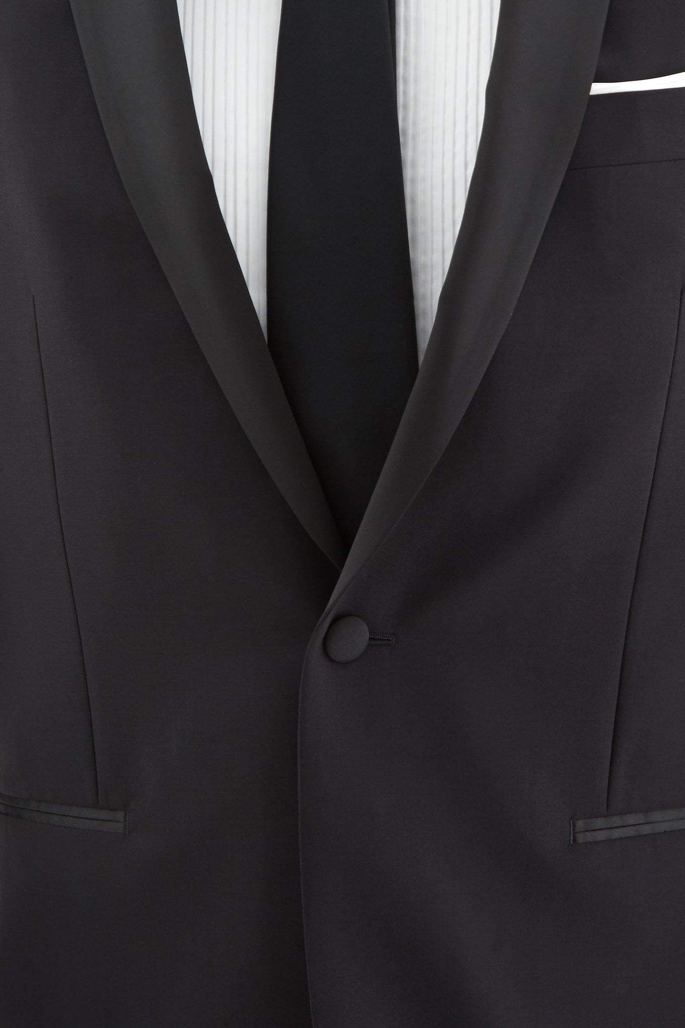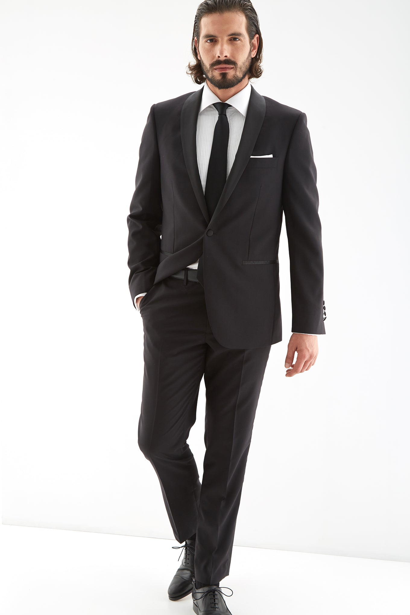 Men's slim fit classic tuxedo. Features a coat with satin shawl lapels. One-fabric button fastening and four-button detail on the sleeves, two side pockets, a chest pocket, three interior pockets and two openings on the back. Back length on size 50 is 76 cm. Trousers with zip and invisible button fastening. Features waist with belt loops and interior adherent material to fix the shirt. Satin side detail. Ankle width on size 44 is 20 cm. Made of 100% wool with 130 high quality. Available at Sacoor Brothers' online store.