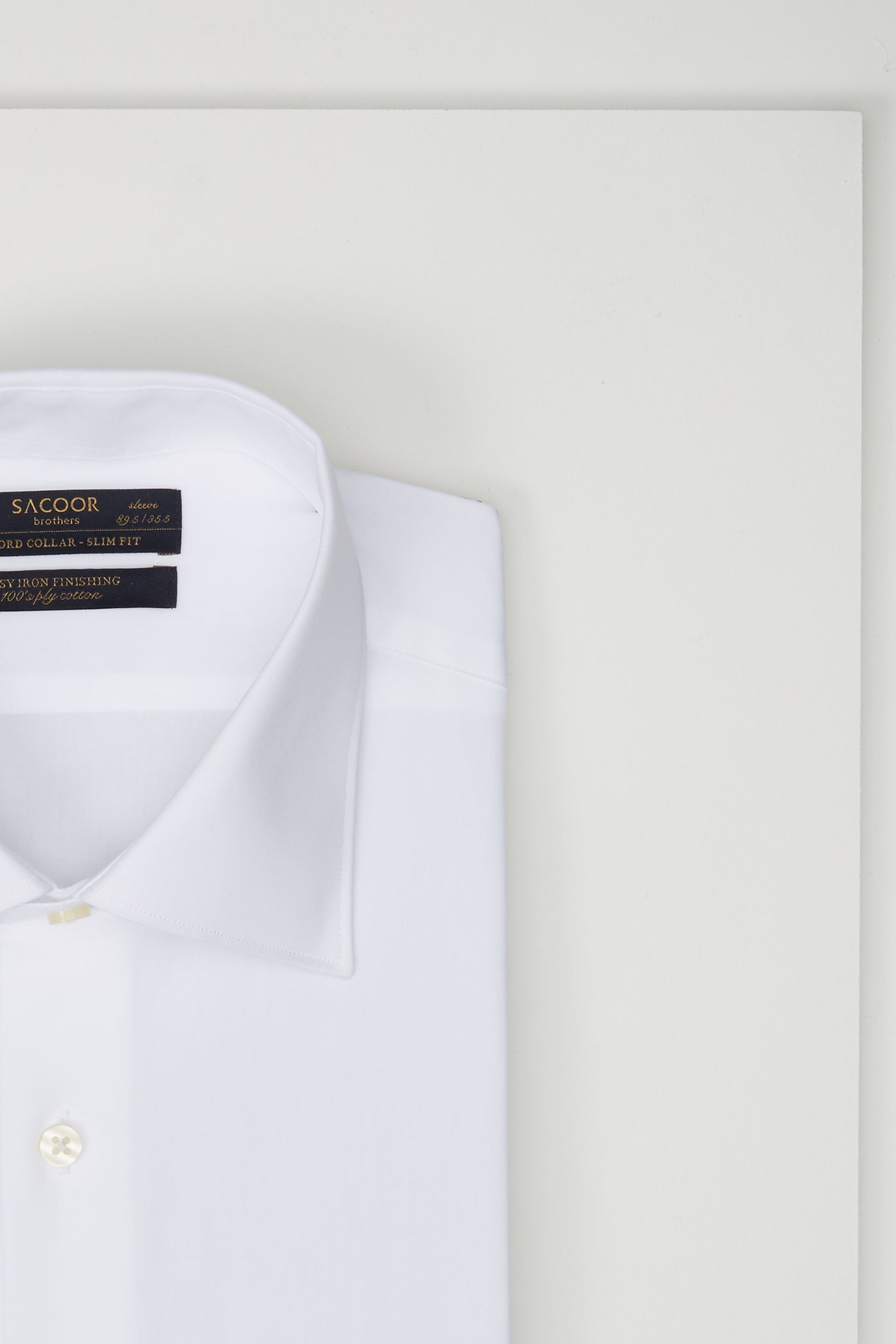 Men's plain slim fit classic shirt. Long sleeves and cuff buttons. Oxford collar with stays. Made of 100% cotton. Available at Sacoor Brothers' online store.