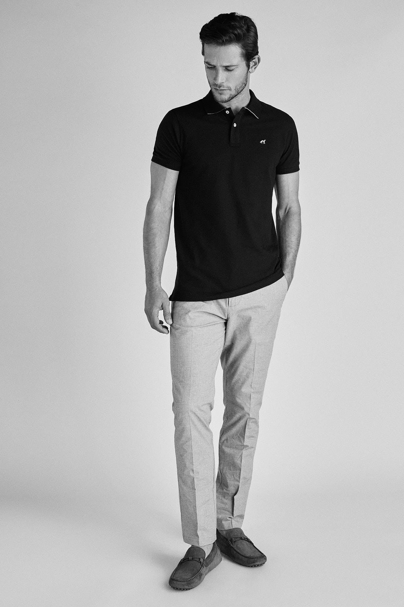 Versatile and comfortable Men's chinos. Micro-pattern with soft texture. Trousers with reinforced waistband and loops. With zipper and buttons. Side and back pockets. Elastane gives you more freedom of movement.