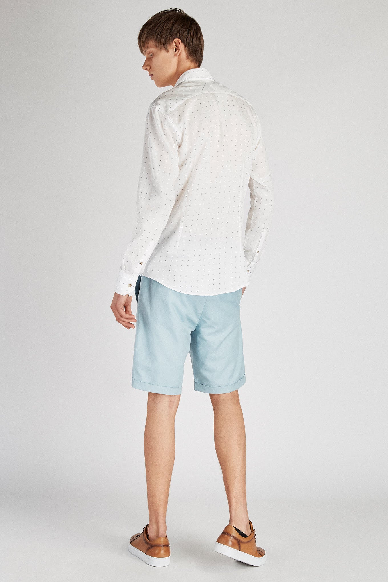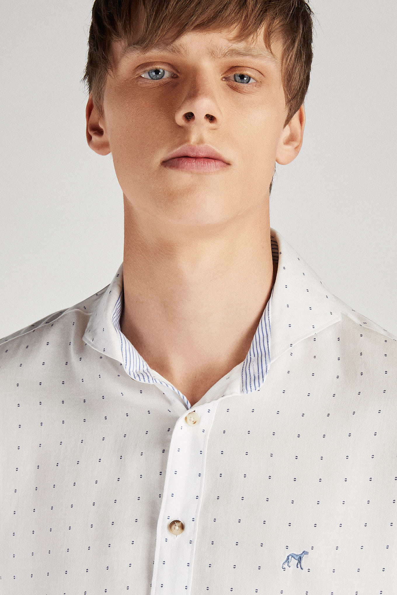 Men's shirt with micro-pattern, 100% cotton. Open collar, with stretchers included. Contrasting fabric on the neck area and strip matching the buttons. English stitching, more comfortable with a quality finish. Support from side seams. Embroidered Sacoor logo on chest. You can wear it with your jeans, chinos or Bermuda shorts. The back length of size 40 is 78 cm and the sleeve length is 66 cm. See our Size Guide.
