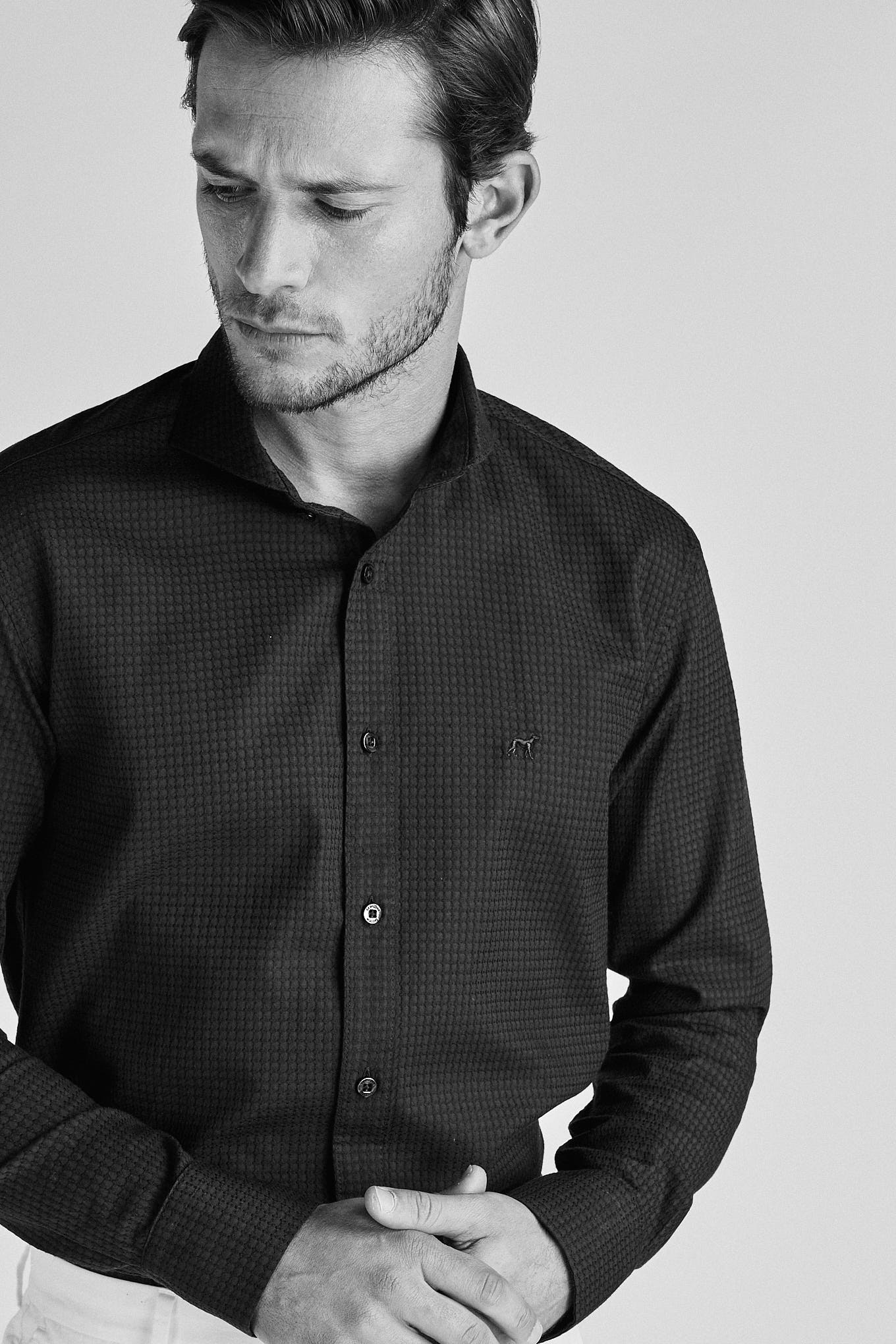 Men's shirt, slim fit, in textured fabric, 100% cotton. Cut with a more relaxed and modern look. Open collar, with stays included. English stitching, more comfortable with a quality finish. Sacoor logo embroidered on the front. The size 40 back length is 78 cm and the sleeve length is 66 cm. See our Size Guide.