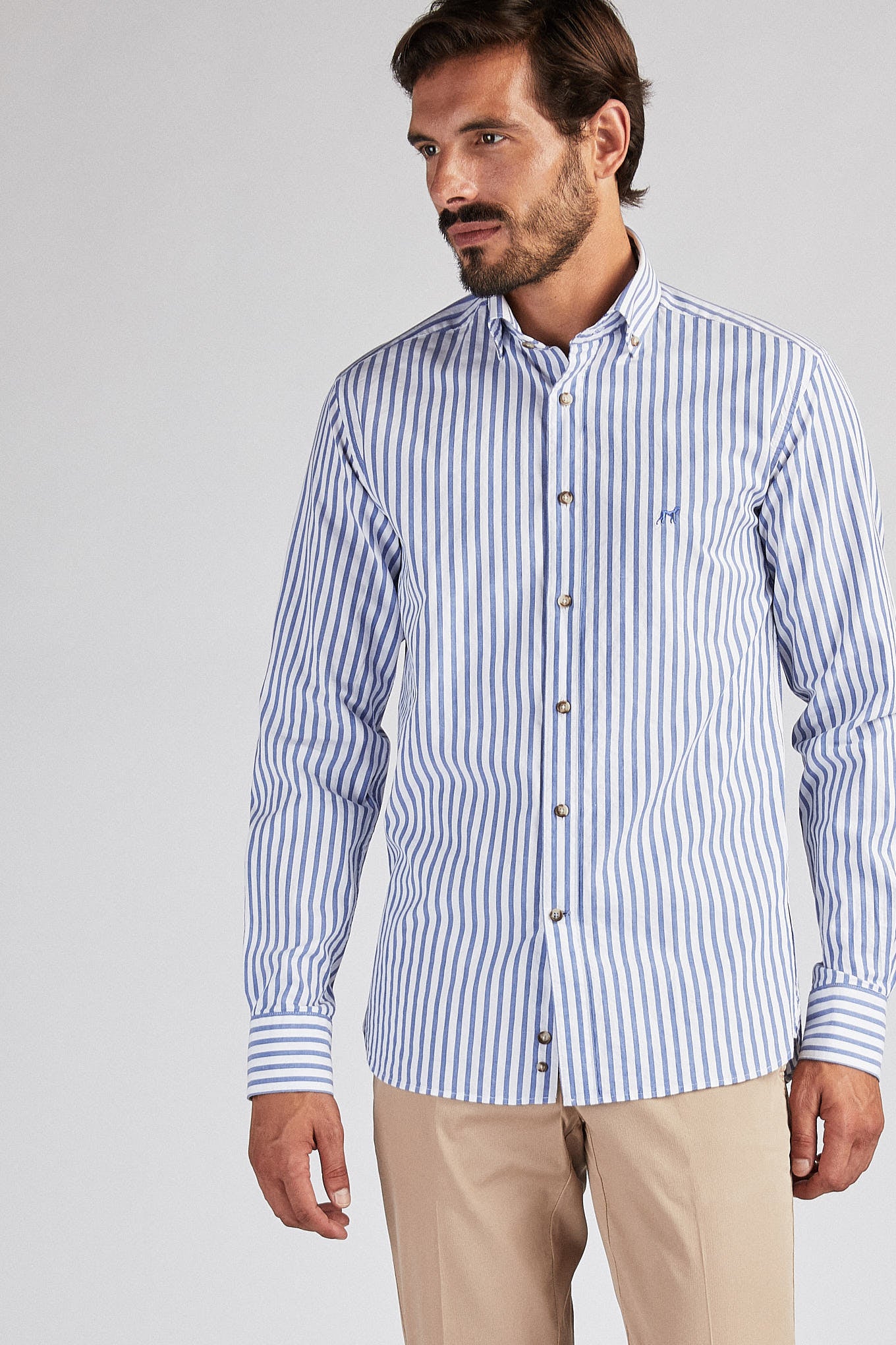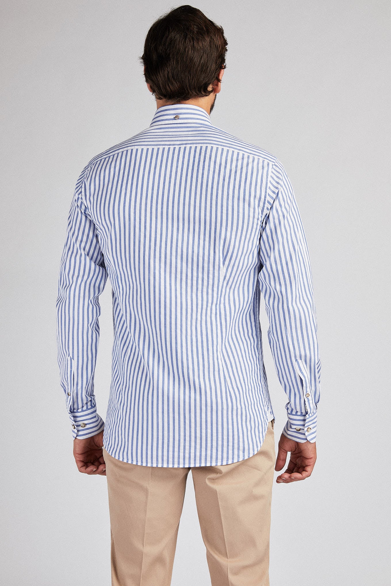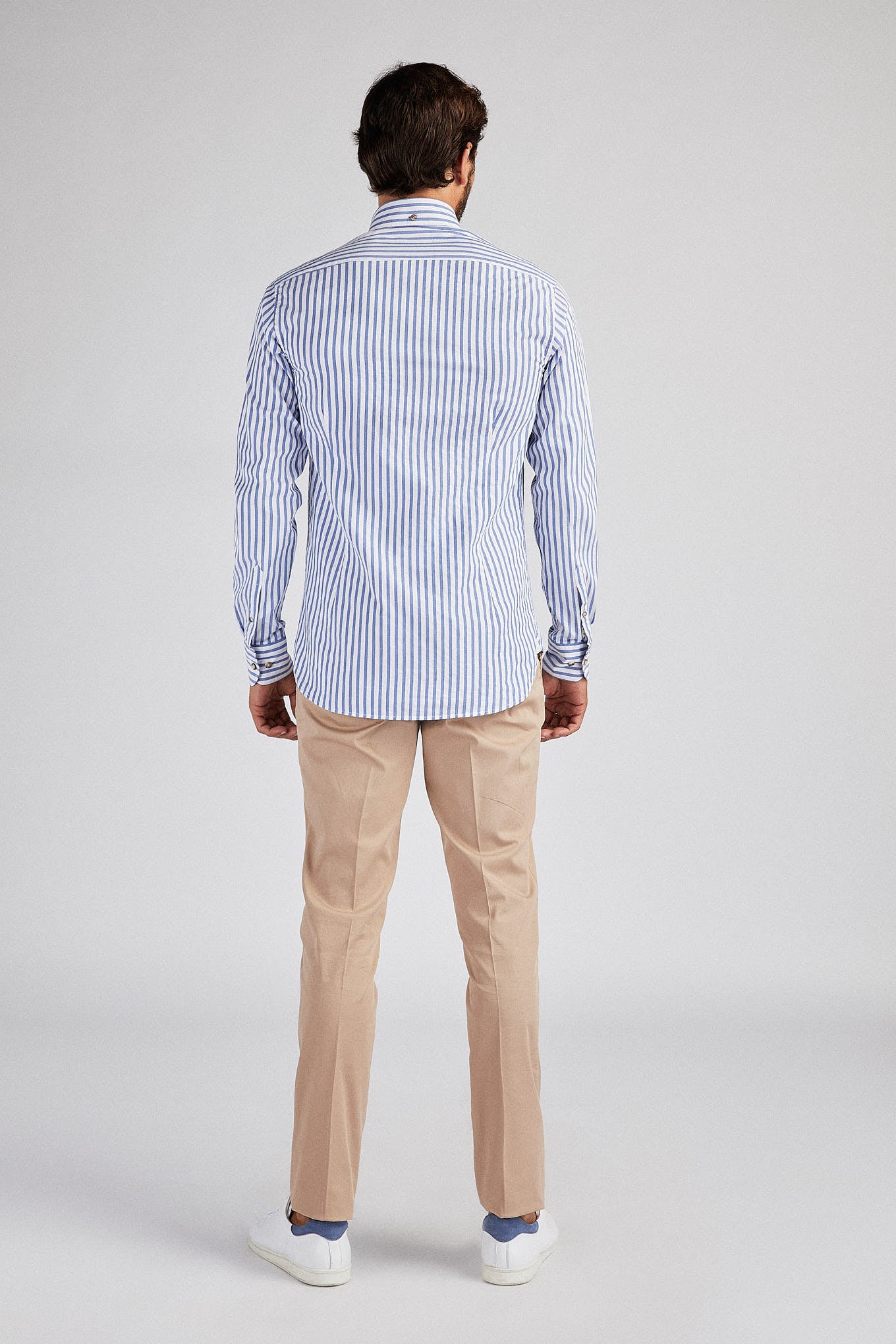 Men's striped shirt. Open collar with buttons, including on the back. Brand logo embroidered on the chest. English stitching, more comfortable with a quality finish. Side support from triangular seams, with the date 1989 - the year the Sacoor Brothers brand was born. The back length of size 40 is 80 cm and the sleeve length is 66 cm. See our Size Guide.