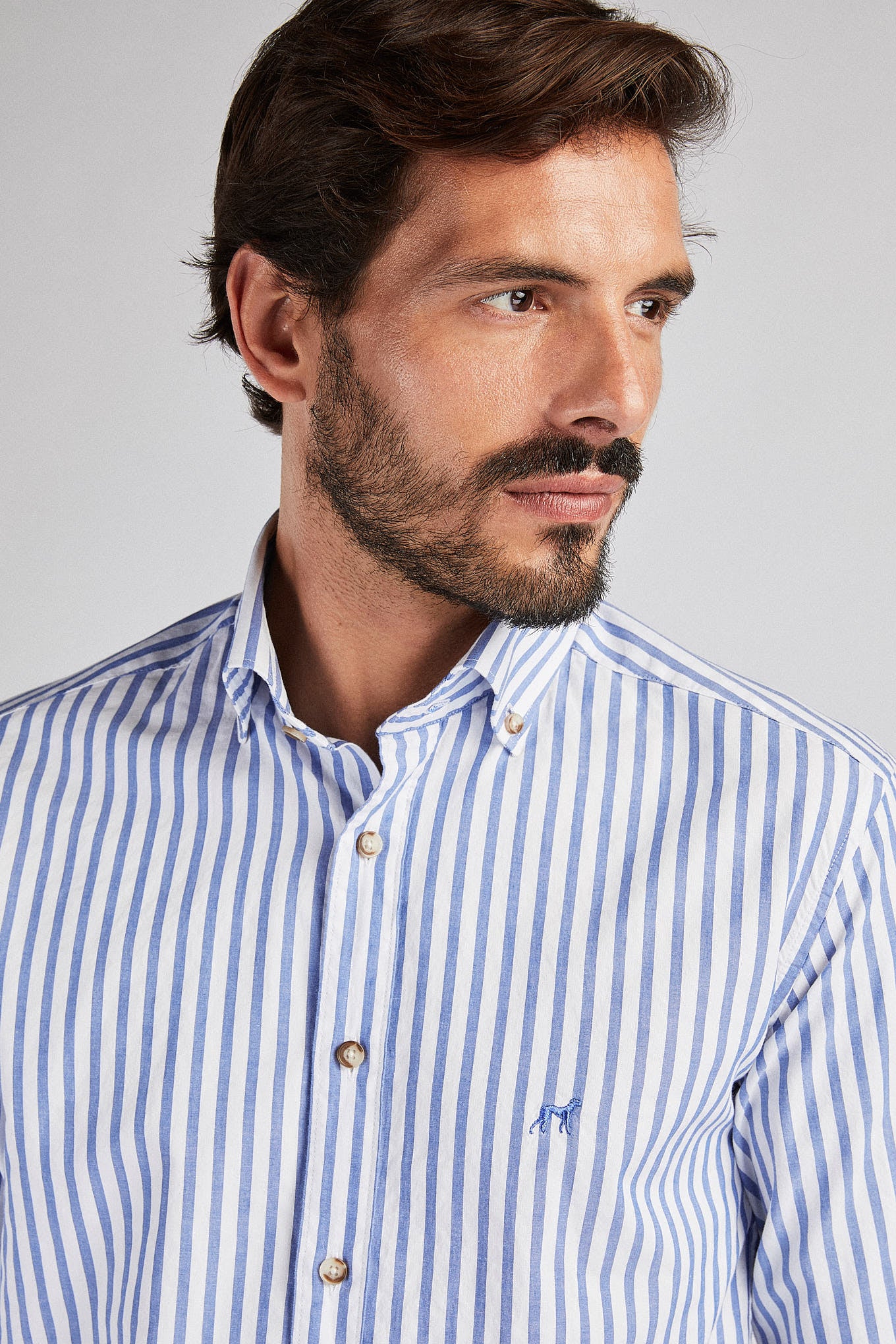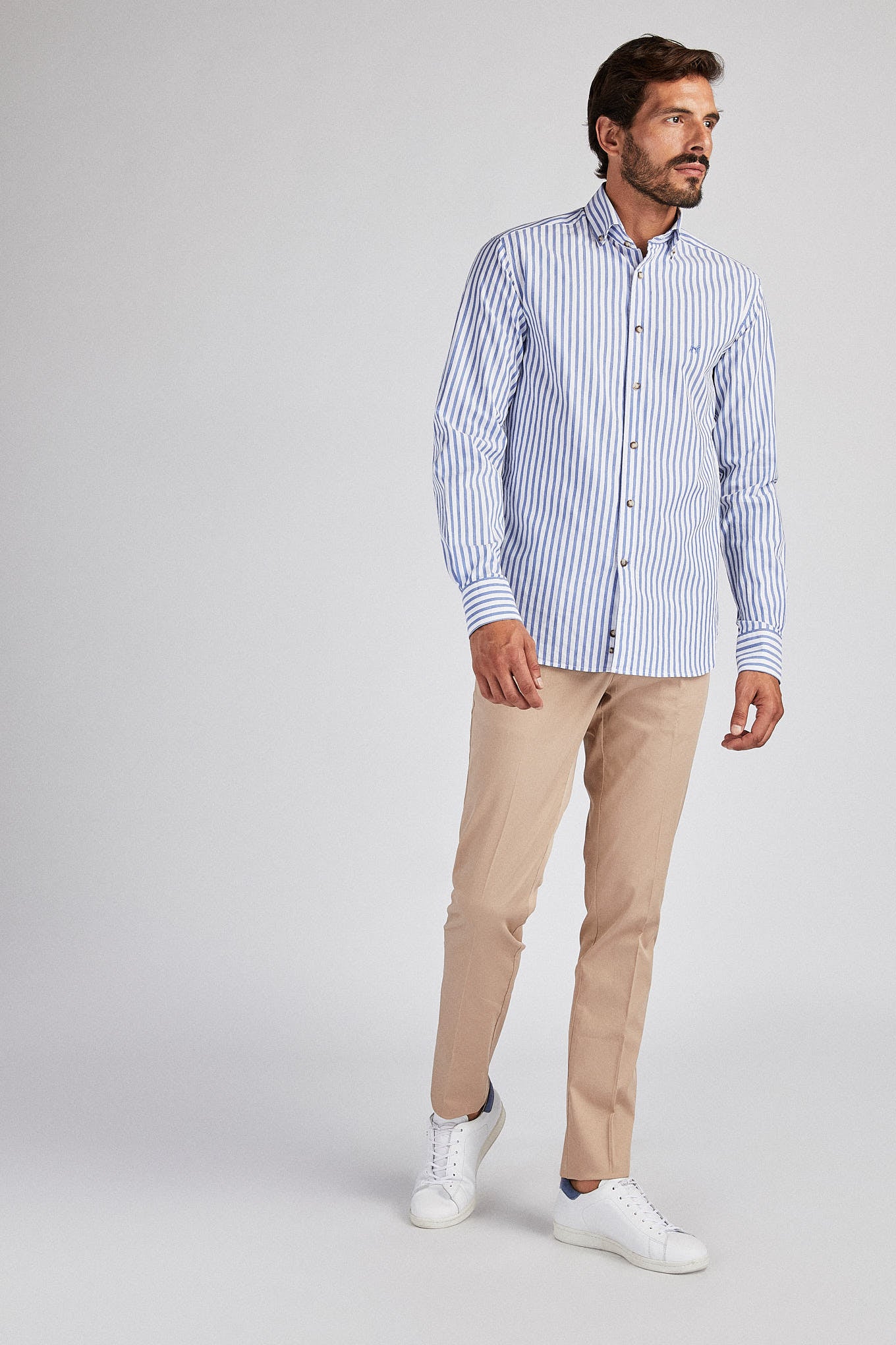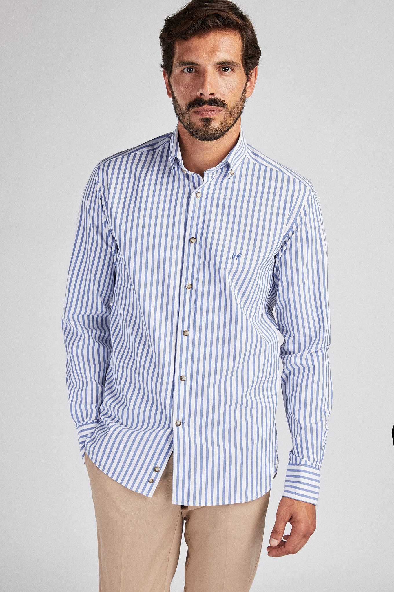 Men's striped shirt. Open collar with buttons, including on the back. Brand logo embroidered on the chest. English stitching, more comfortable with a quality finish. Side support from triangular seams, with the date 1989 - the year the Sacoor Brothers brand was born. The back length of size 40 is 80 cm and the sleeve length is 66 cm. See our Size Guide.