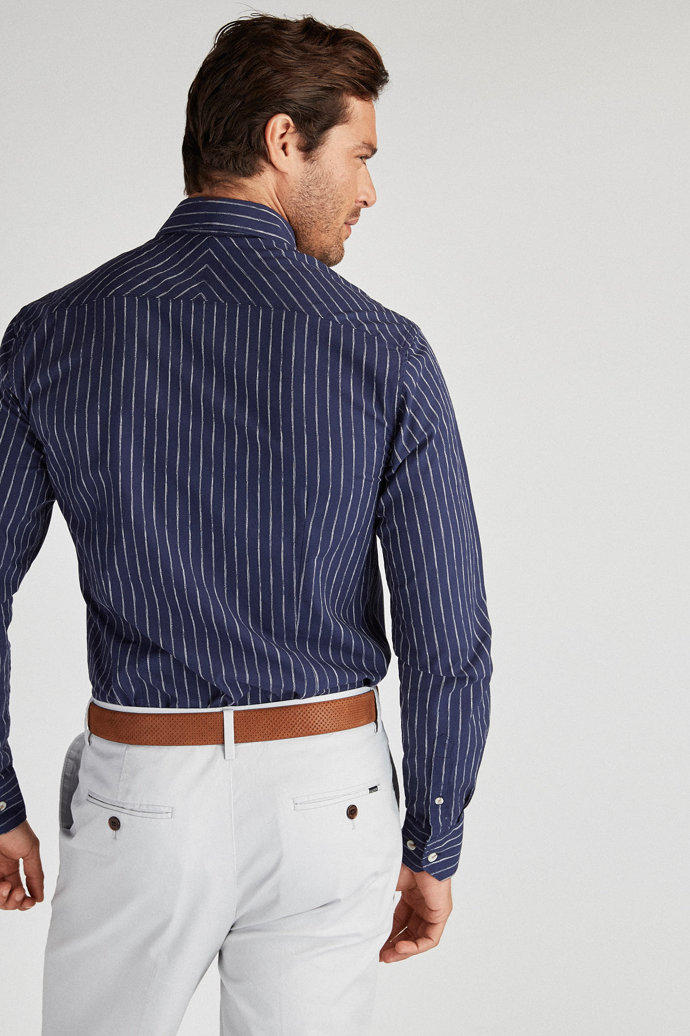 Men's shirt, striped pattern with light texture, 100% cotton. Open collar, with stays included. English stitching, more comfortable with a quality finish. Embroidered Sacoor logo on the chest. You can wear it with your jeans or chinos. The size 40 back length is 78 cm and the sleeve length is 66 cm. See our Size Guide.