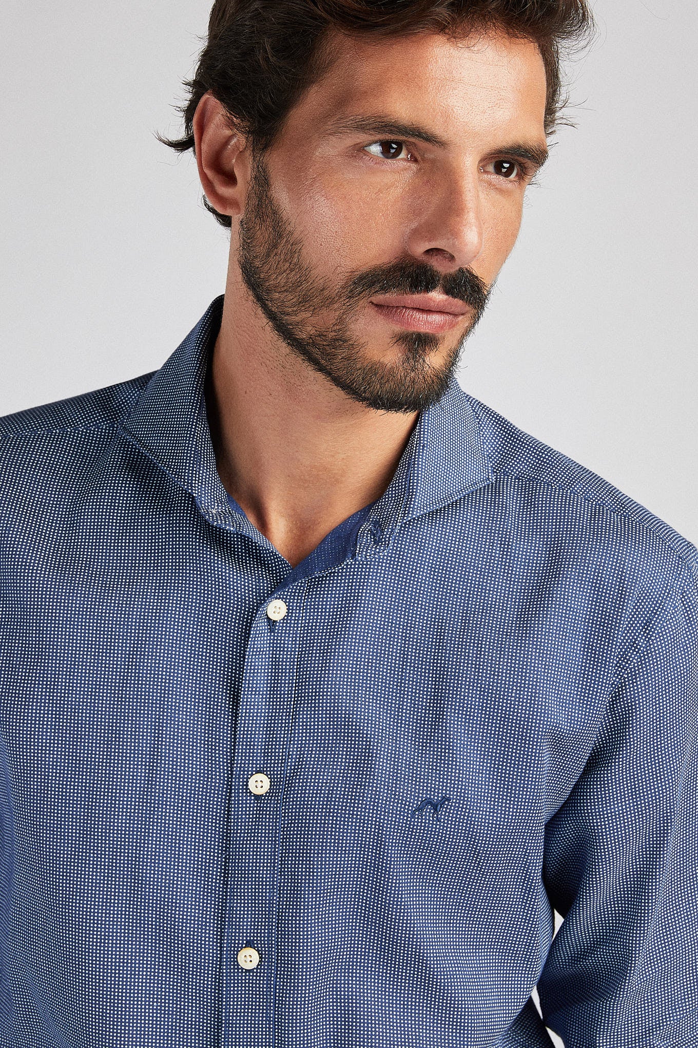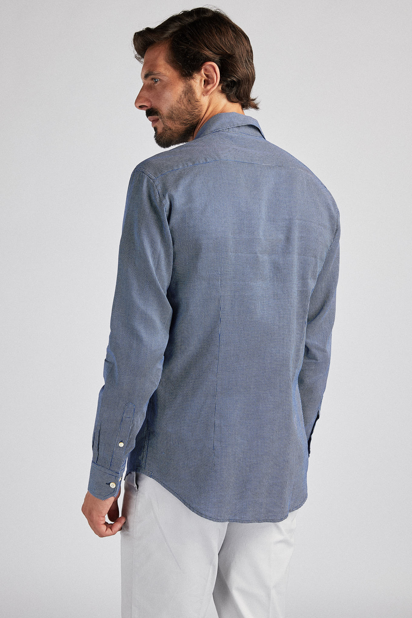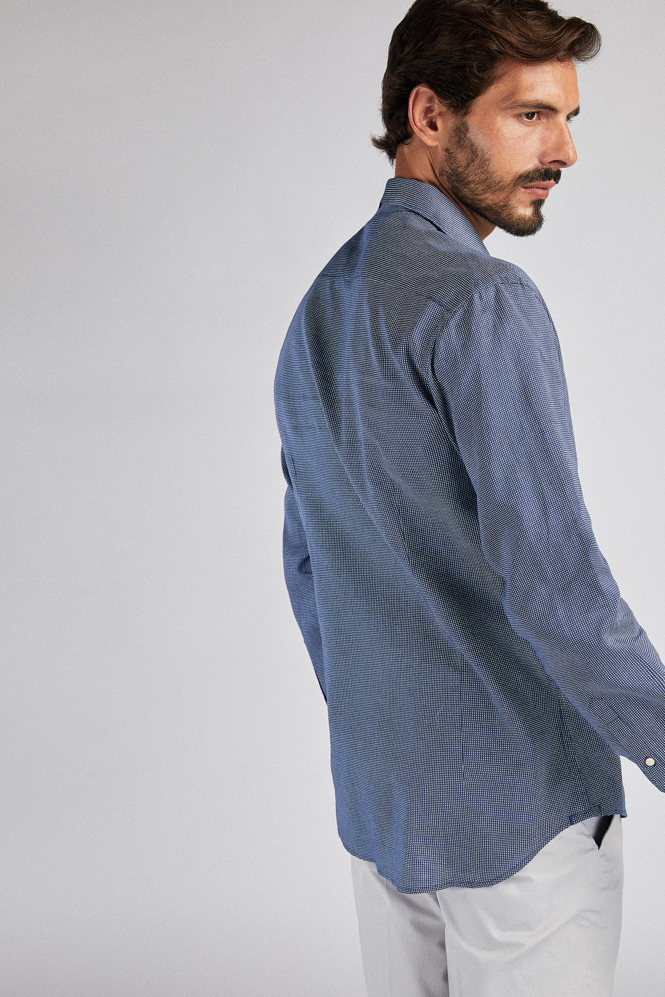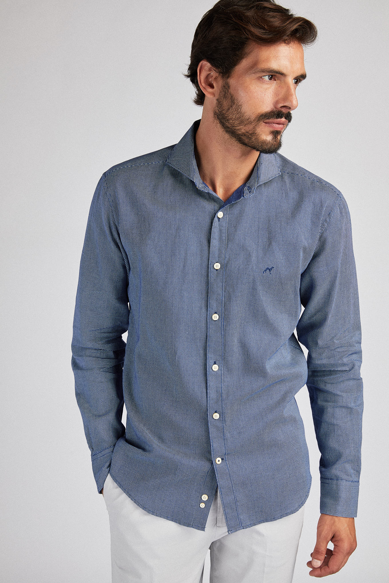 Men's shirt, very light and cool, in 100% linen. Small dotted pattern. Open collar, with stretchers included. Sacoor logo embroidered on chest. English stitching, more comfortable with a quality finish. Side support of seams. Ideal for combining with a variety of other Sacoor pieces on warmer days.