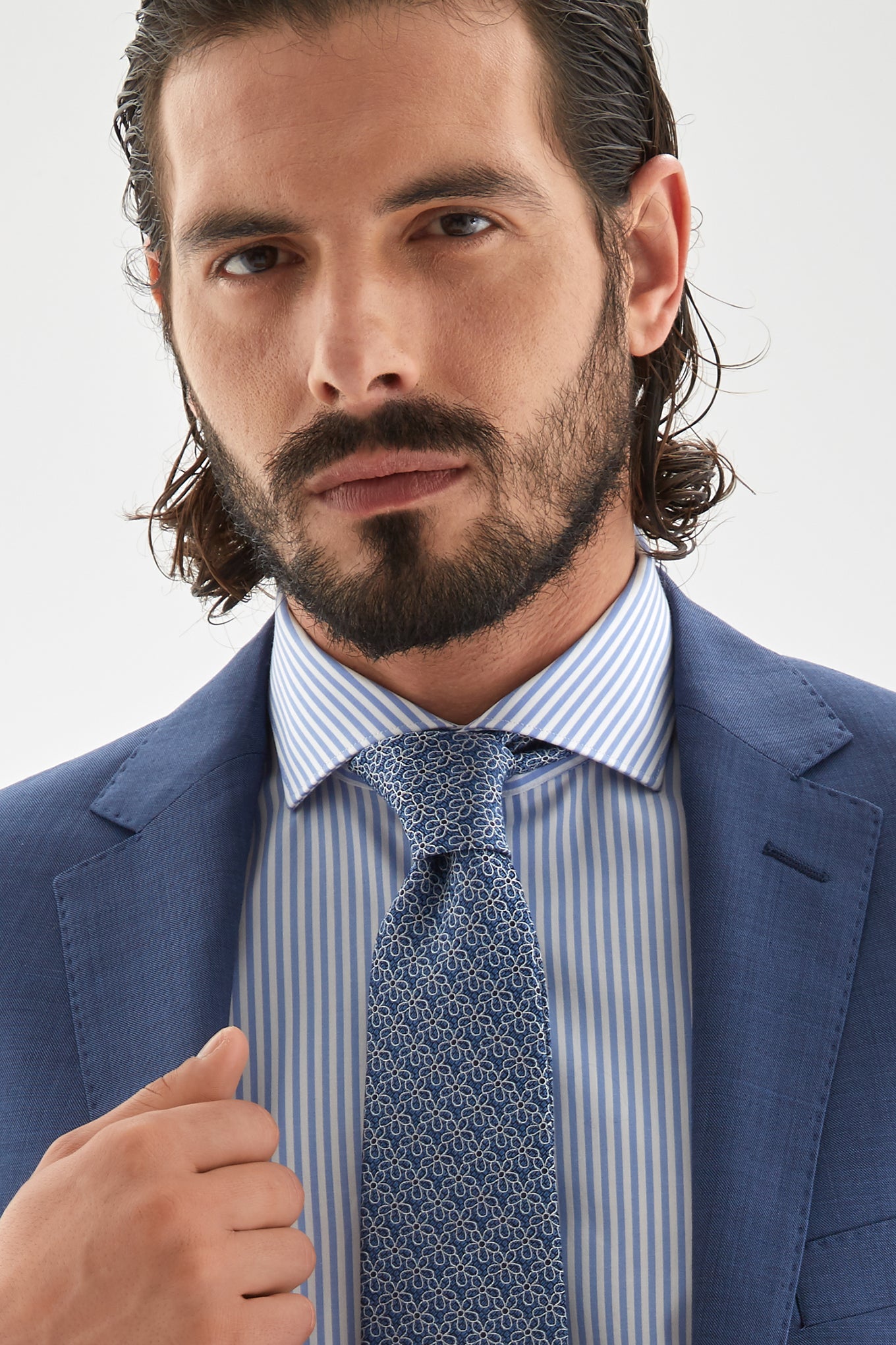 Men's slim fit classic suit. Blazer with two-button fastening and four-button detail on the sleeve. Two side pockets, a chest pocket and three interior pockets. Back length on size 50 is 76 cm. Trousers with zip and invisible button fastening. Features waist with belt loops and interior adherent material to fix the shirt. Ankle width on size 44 is 20 cm. Made of 140 high quality pure wool. Available at Sacoor Brothers' online store.