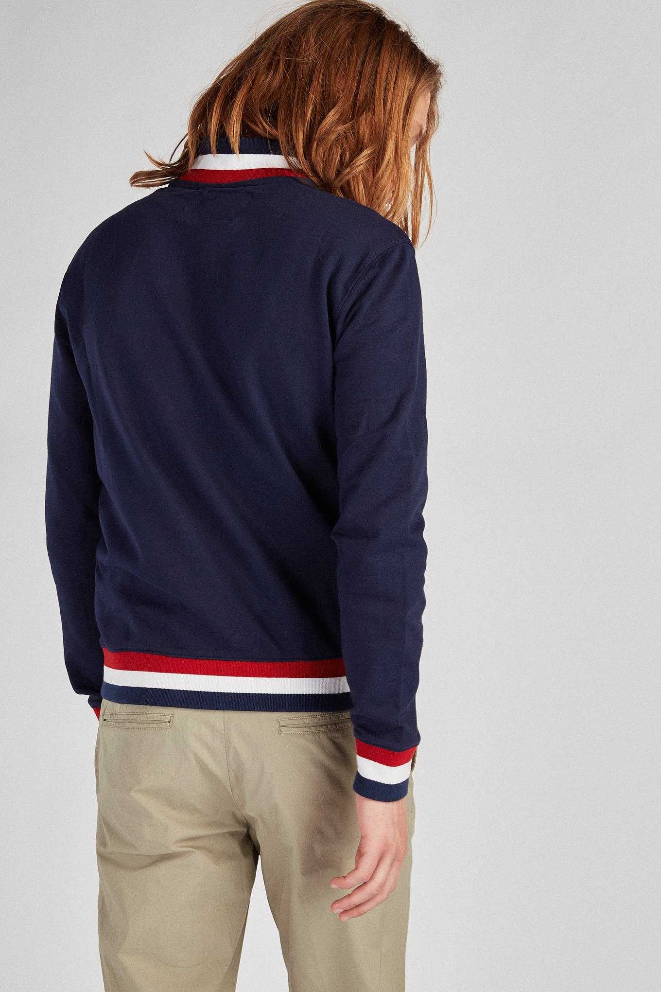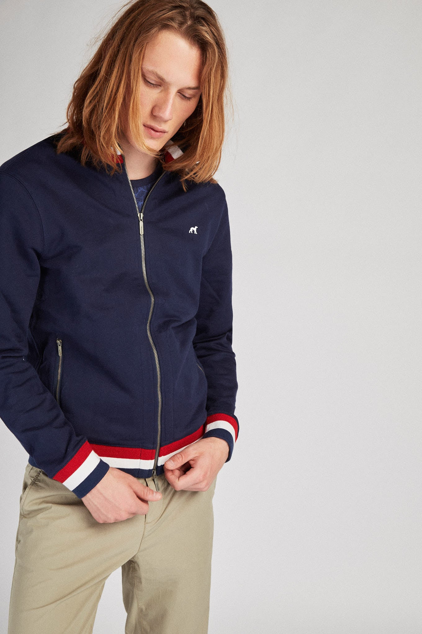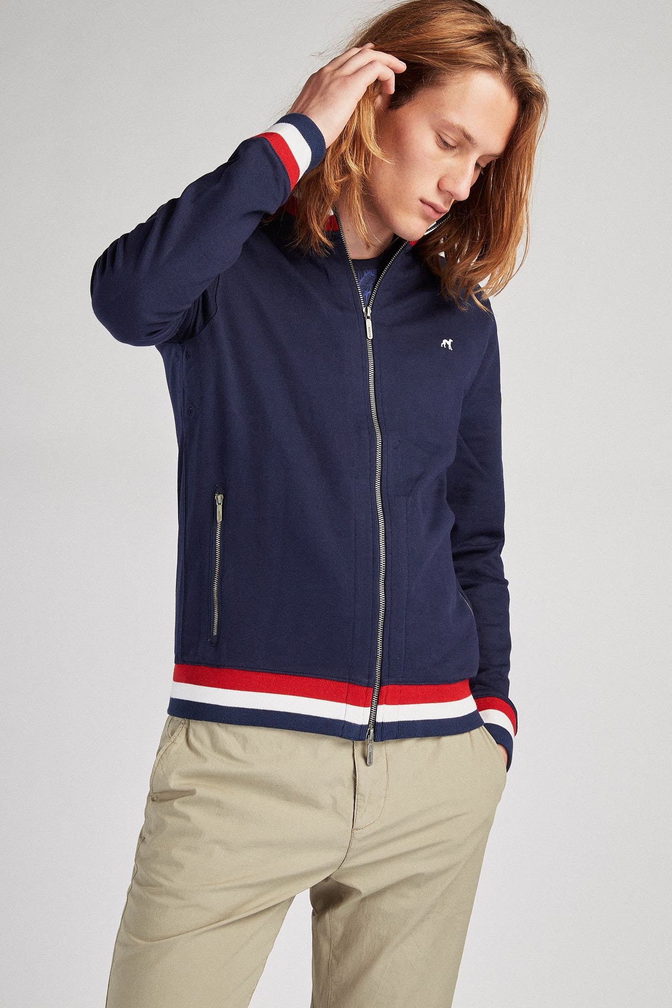 Men's jacket in a sporty style, ideal for weekend hikes and moments of relaxation. Silicone Sacoor logo printed on chest. With side pockets and striped ribbed trims at hem, neckline and cuffs. Zip fastening with 2 zip pulls.