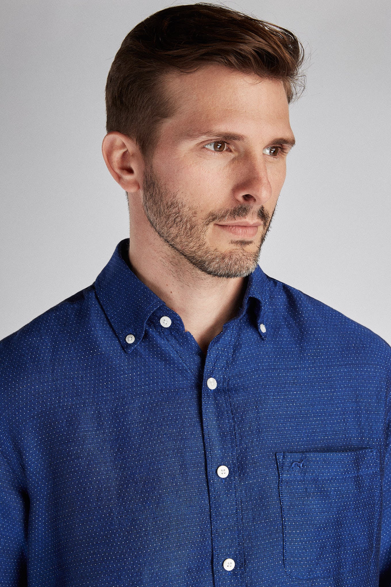 Very light and cool men's shirt made of linen and cotton. Small dotted pattern. Open collar with buttons. Sacoor logo embroidered on chest pocket, and brand customisation at the cuffs. English stitching, more comfortable and for a quality finish. Side support of triangular seams. Contrasting striped pattern inside shirt. You can wear it with your jeans or chinos. The back length of size 40 is 78 cm and the sleeve length is 66 cm. See our Size Guide.