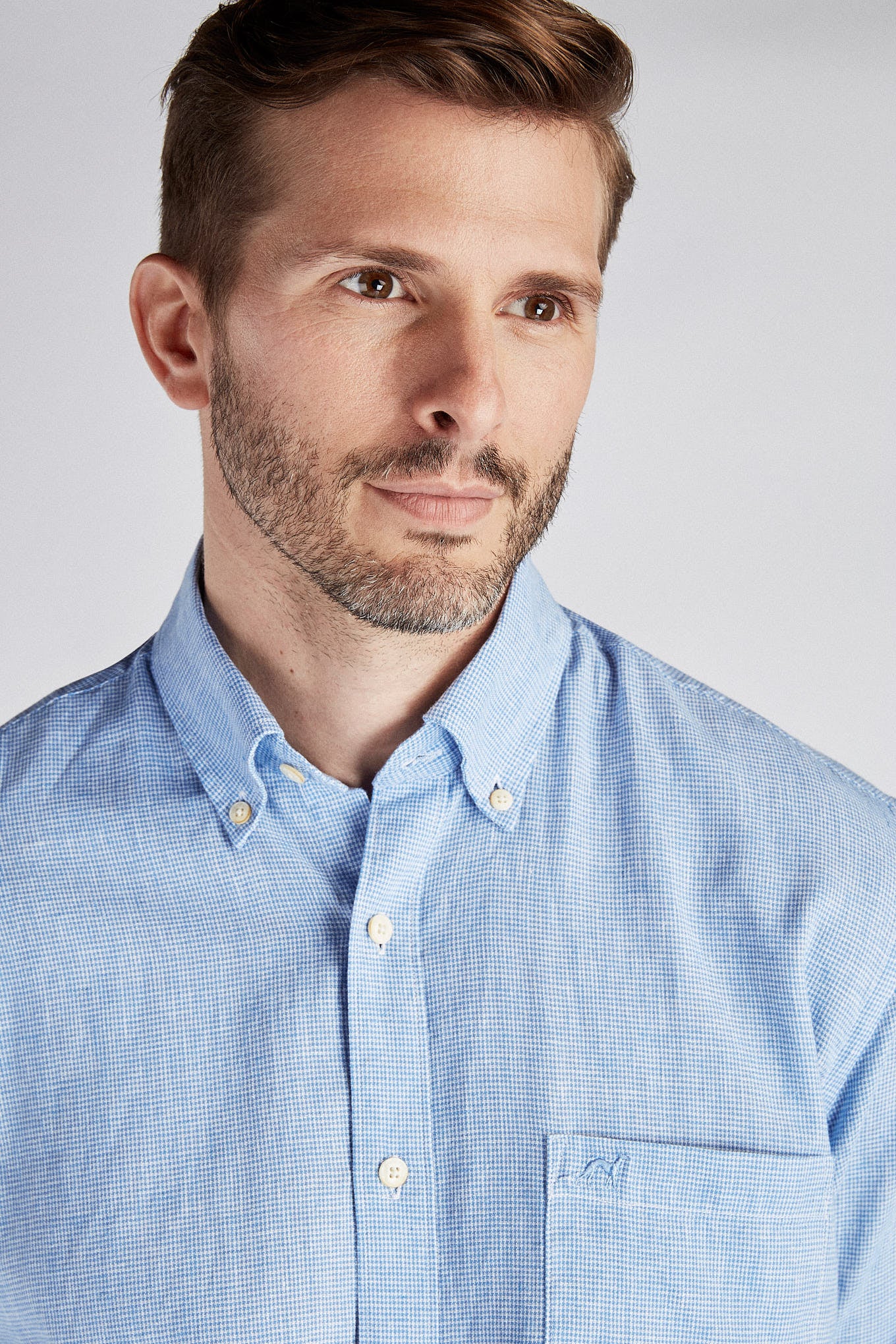 Very light and cool men's shirt made of linen and cotton. Narrow checked pattern. Open collar with buttons. Sacoor logo embroidered on chest pocket, and brand customisation at the cuffs. English stitching, more comfortable and for a quality finish. Side support of triangular seams. You can wear it with your jeans or chinos. Available at Sacoor Brothers online store. The back length of size 40 is 78 cm and the sleeve length is 66 cm. See our Size Guide.