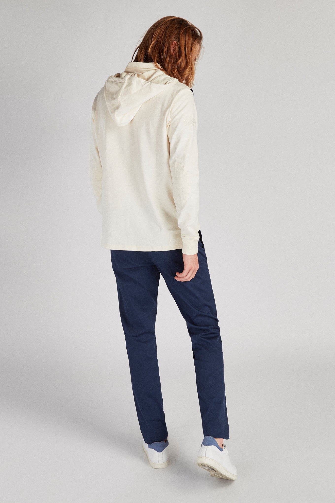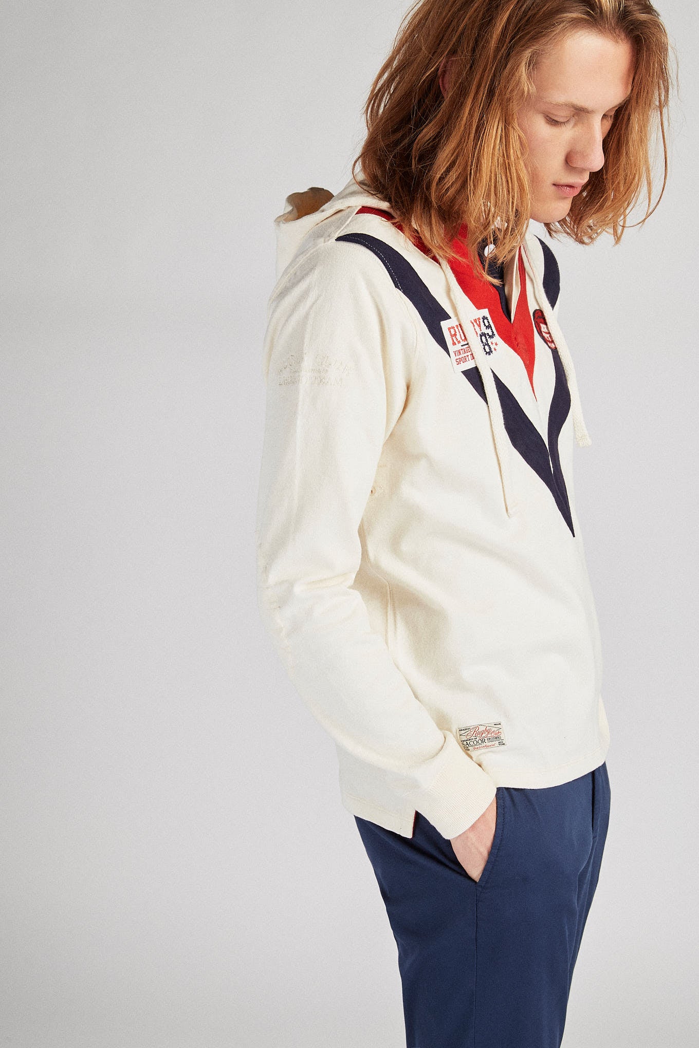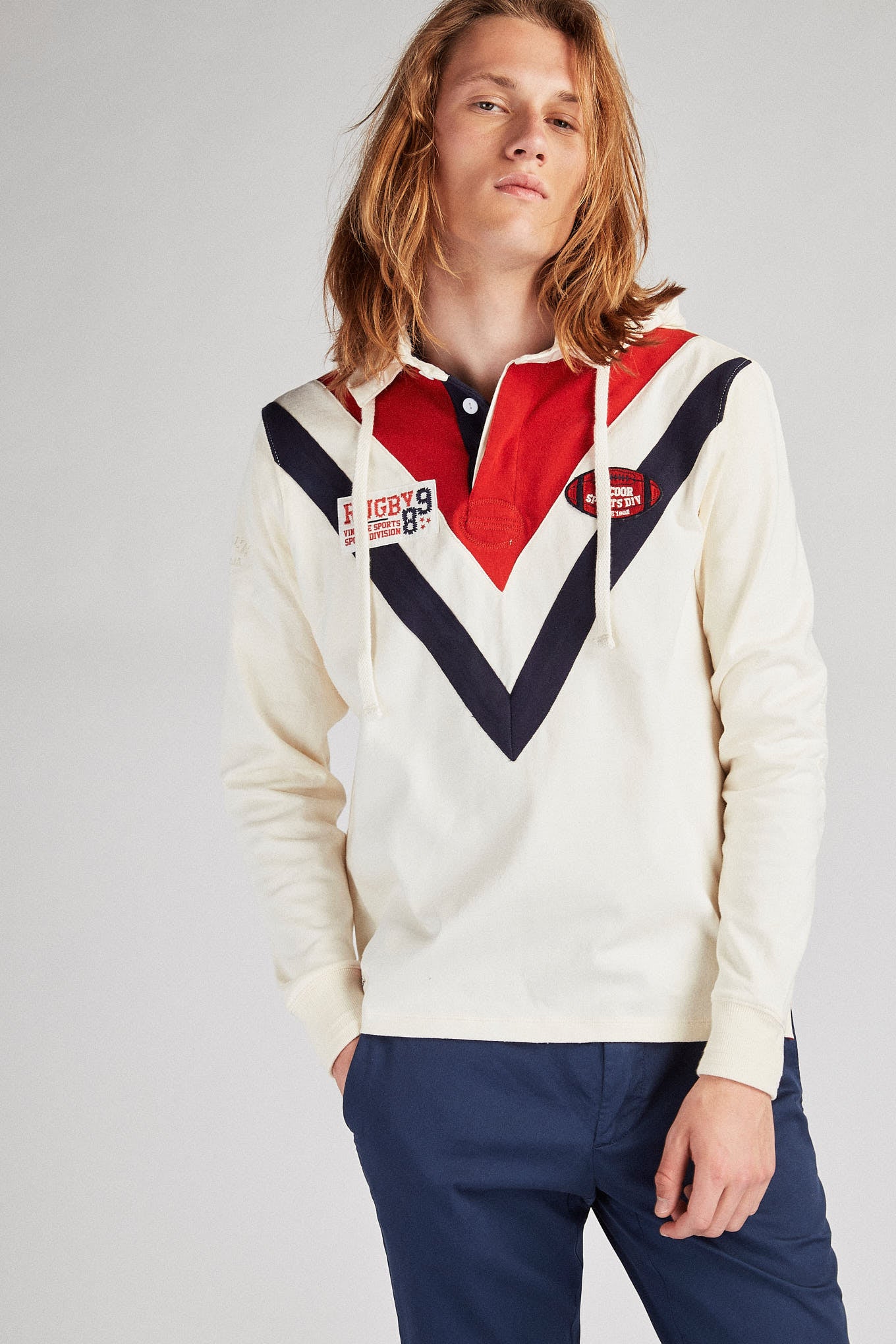 Men's long-sleeved polo piquet shirt with elbow pads. Removable hood with drawstrings for adjusting. Combines plain fabric with stripes to create a peaked design on the front. Sporty badges and embroidery on front and sleeves. Regular neckline with 2 buttons. Ribbed trims on cuff. Slight side vents. Lettering on hem typical of "Rugby Club" models; a sportier version for the new season.