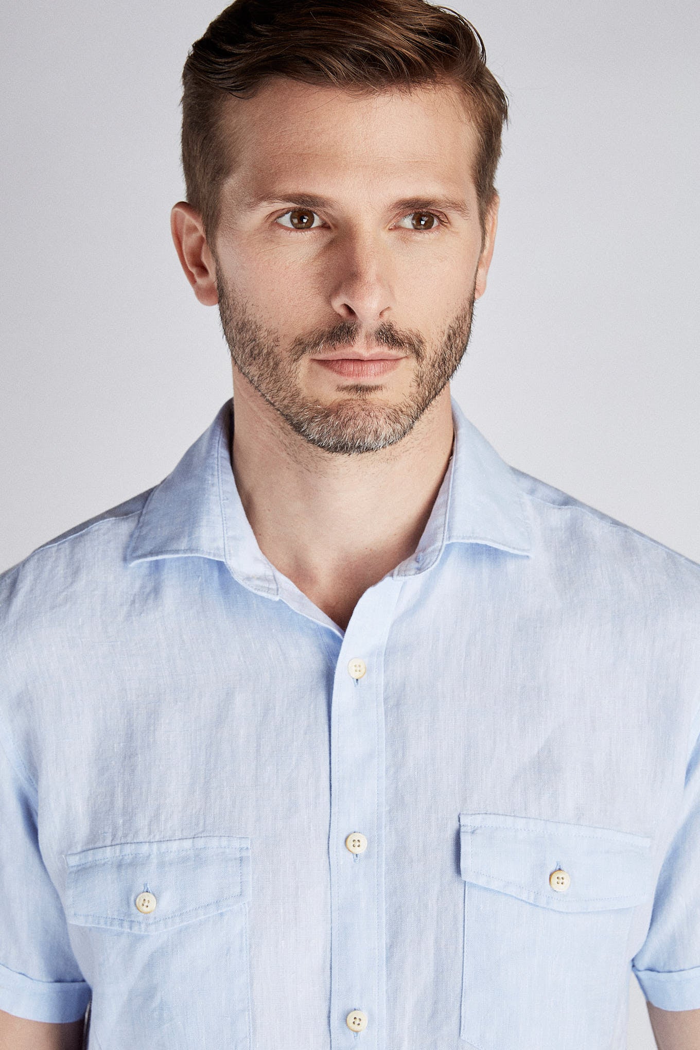 Plain mixed fabric men's turn-up short sleeve shirt. Open collar, with stretchers included. Two front pockets. English stitching, more comfortable and for a quality finish. Side support of seams. 100% linen, very cool and relaxed. The size 40 back length is 78 cm. See our Size Guide.
