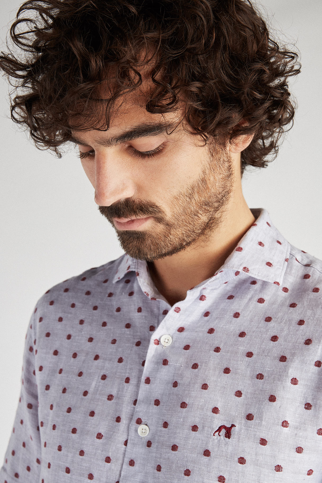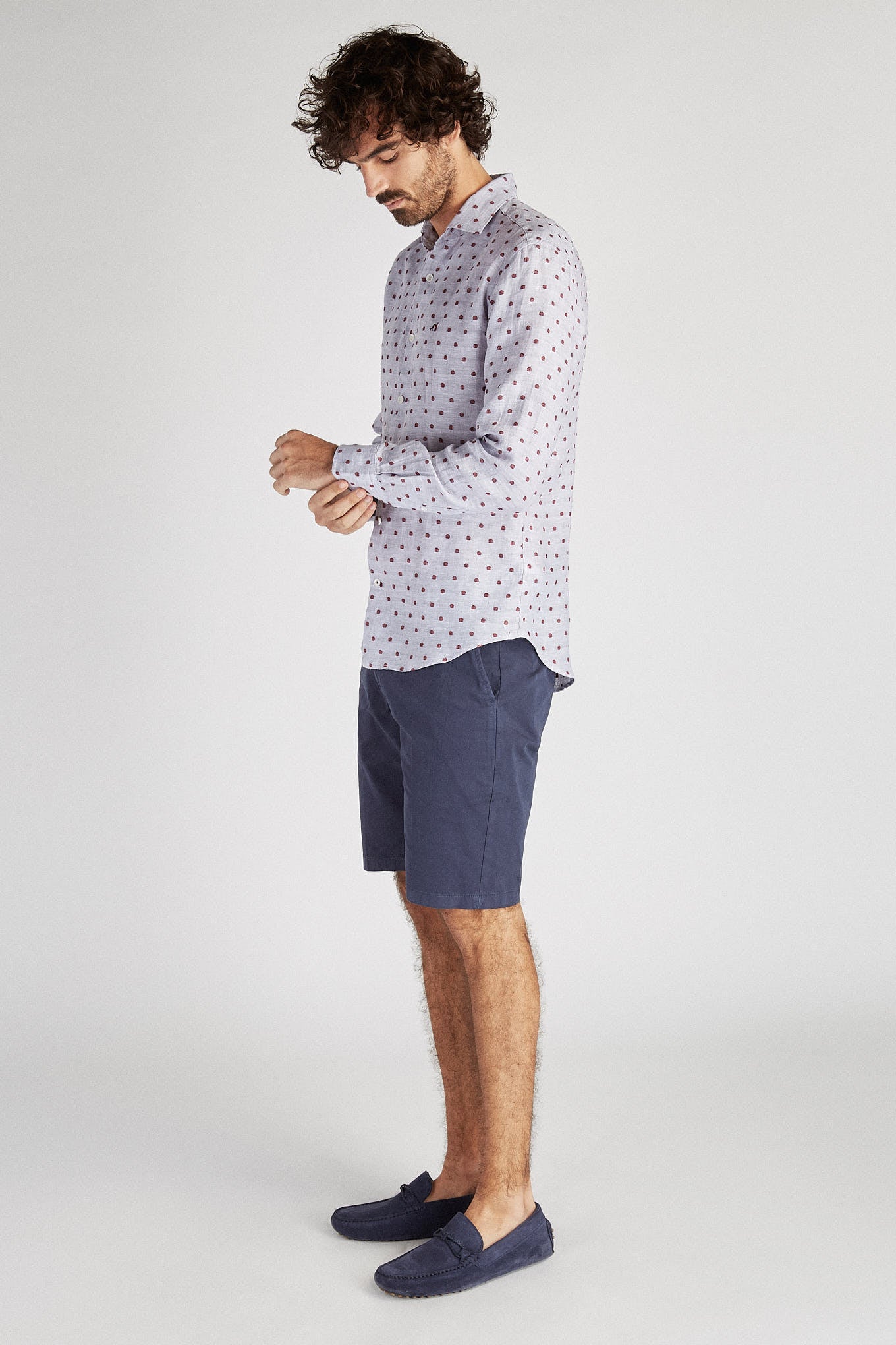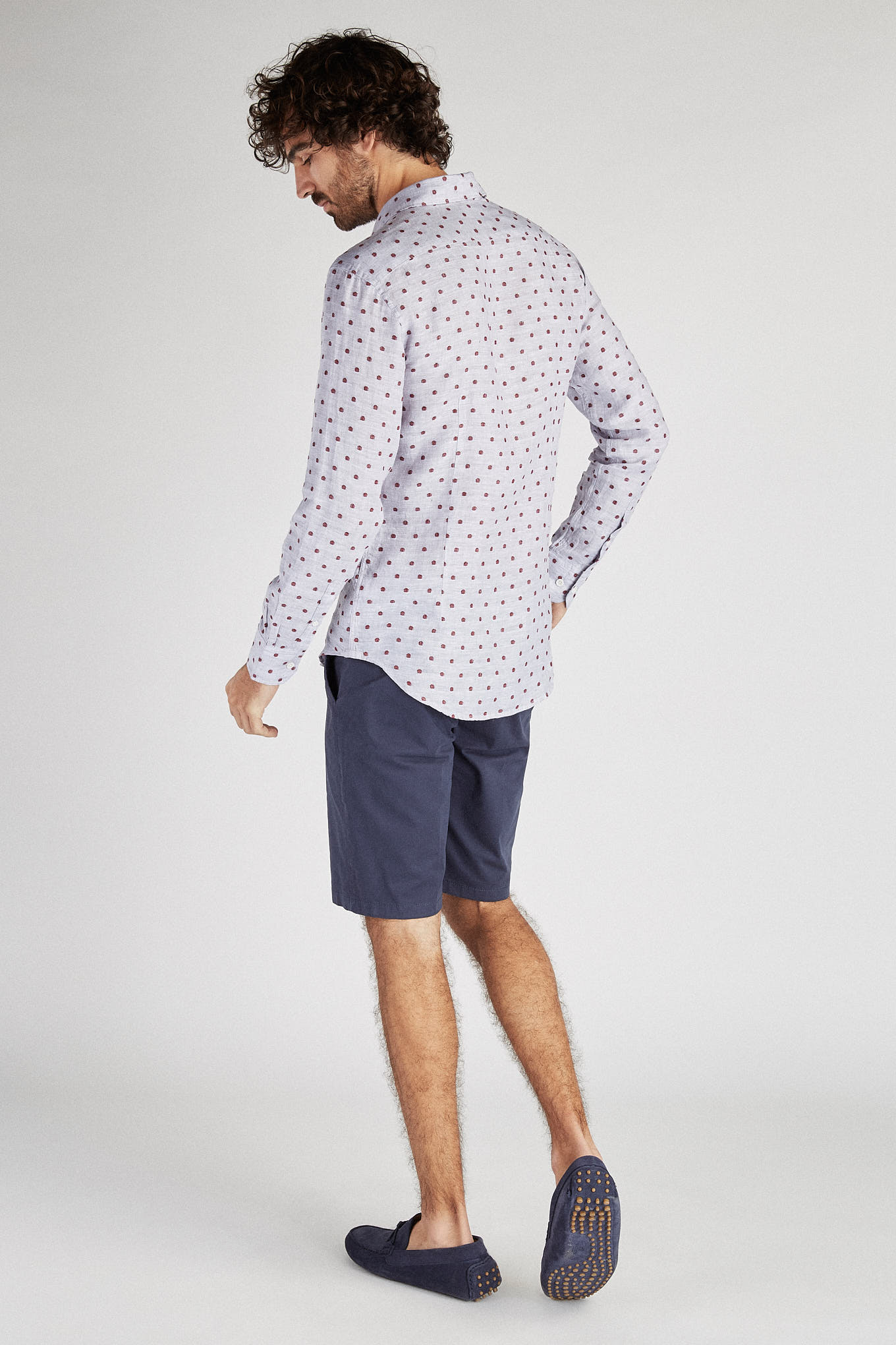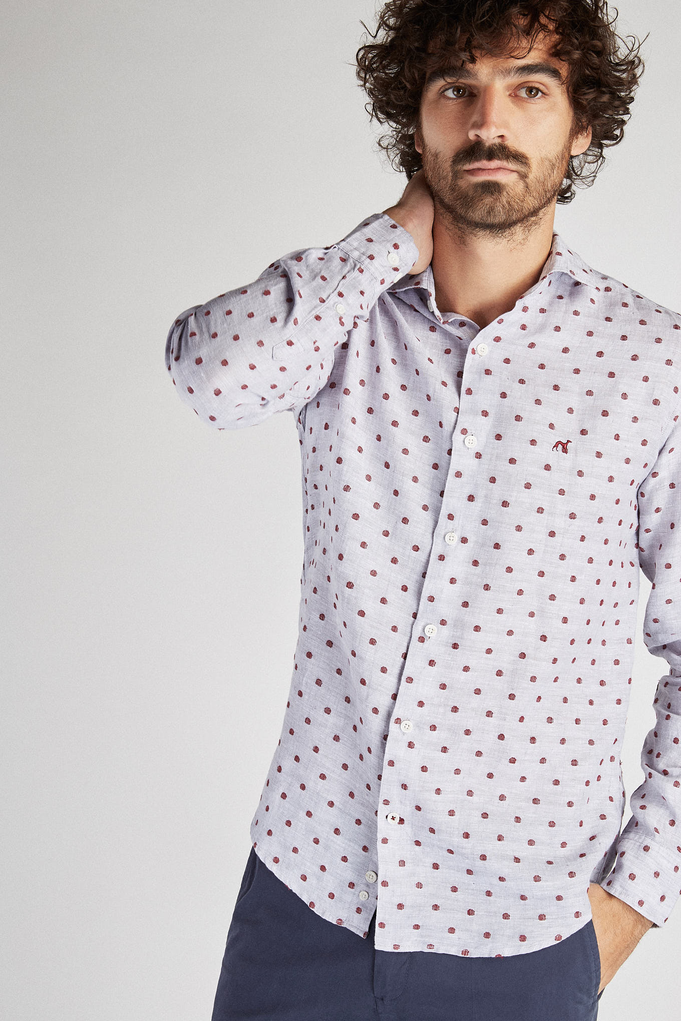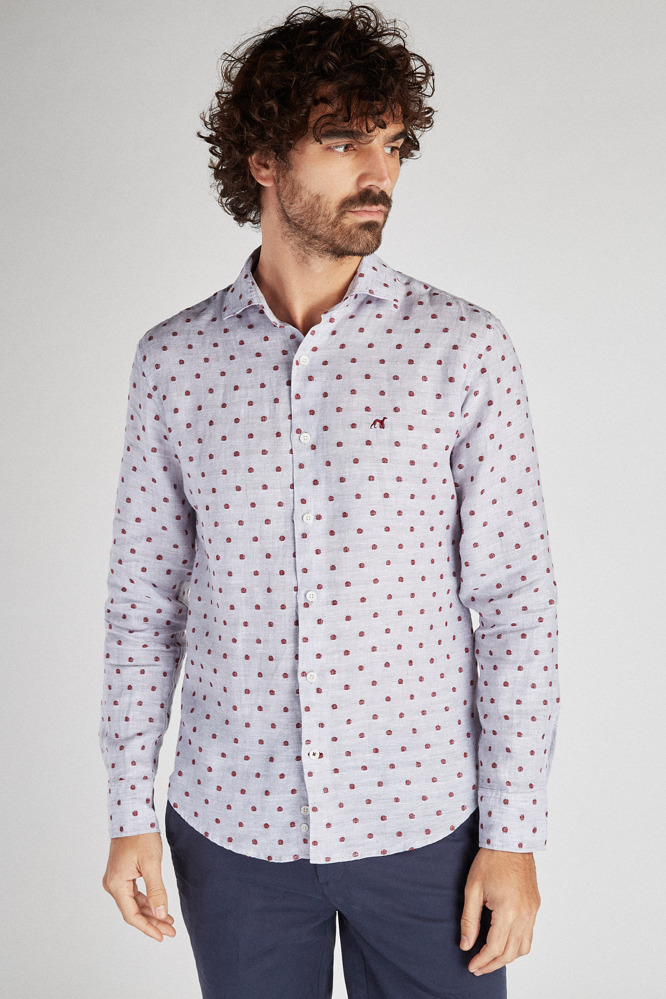 Men's shirt with circles pattern on mixed background. In linen and cotton, very cool and relaxed. Open collar, with stretchers included. English stitching, more comfortable with a quality finish. Embroidered Sacoor logo on chest. Side support from seams. The back length of size 40 is 78 cm and the sleeve length is 66 cm. See our Size Guide.