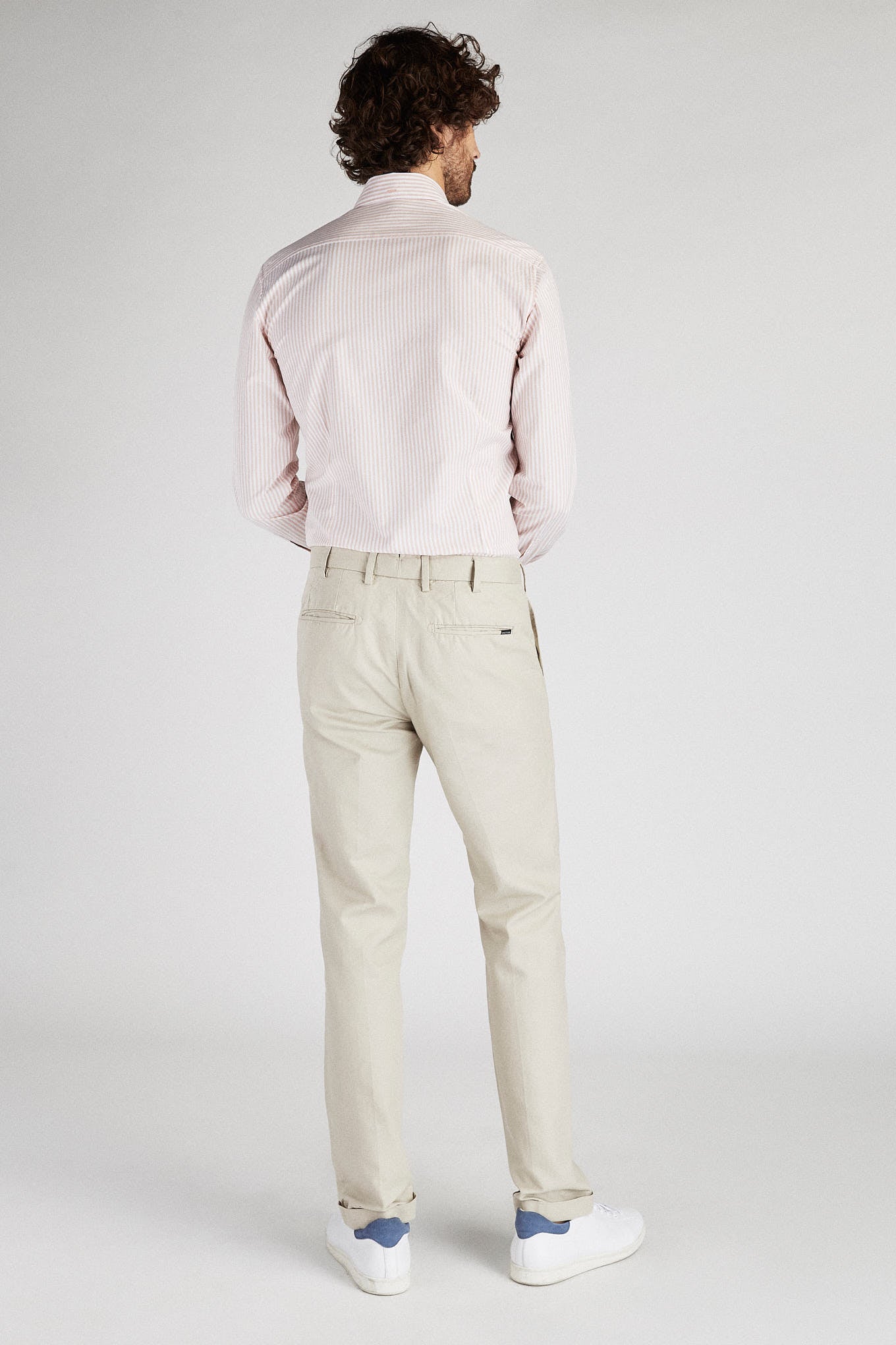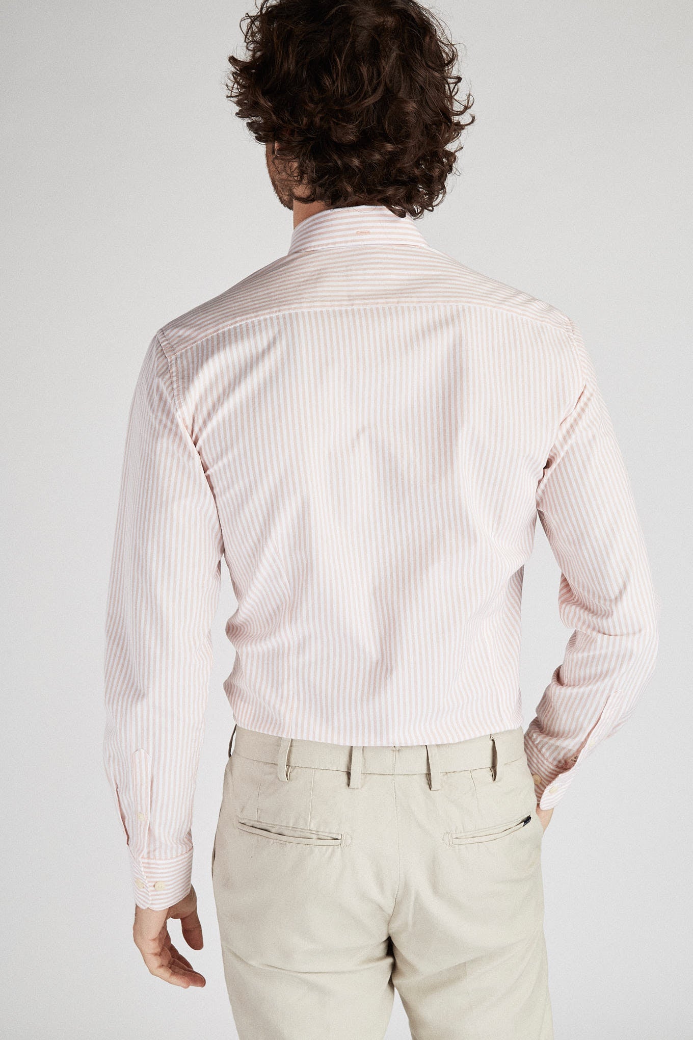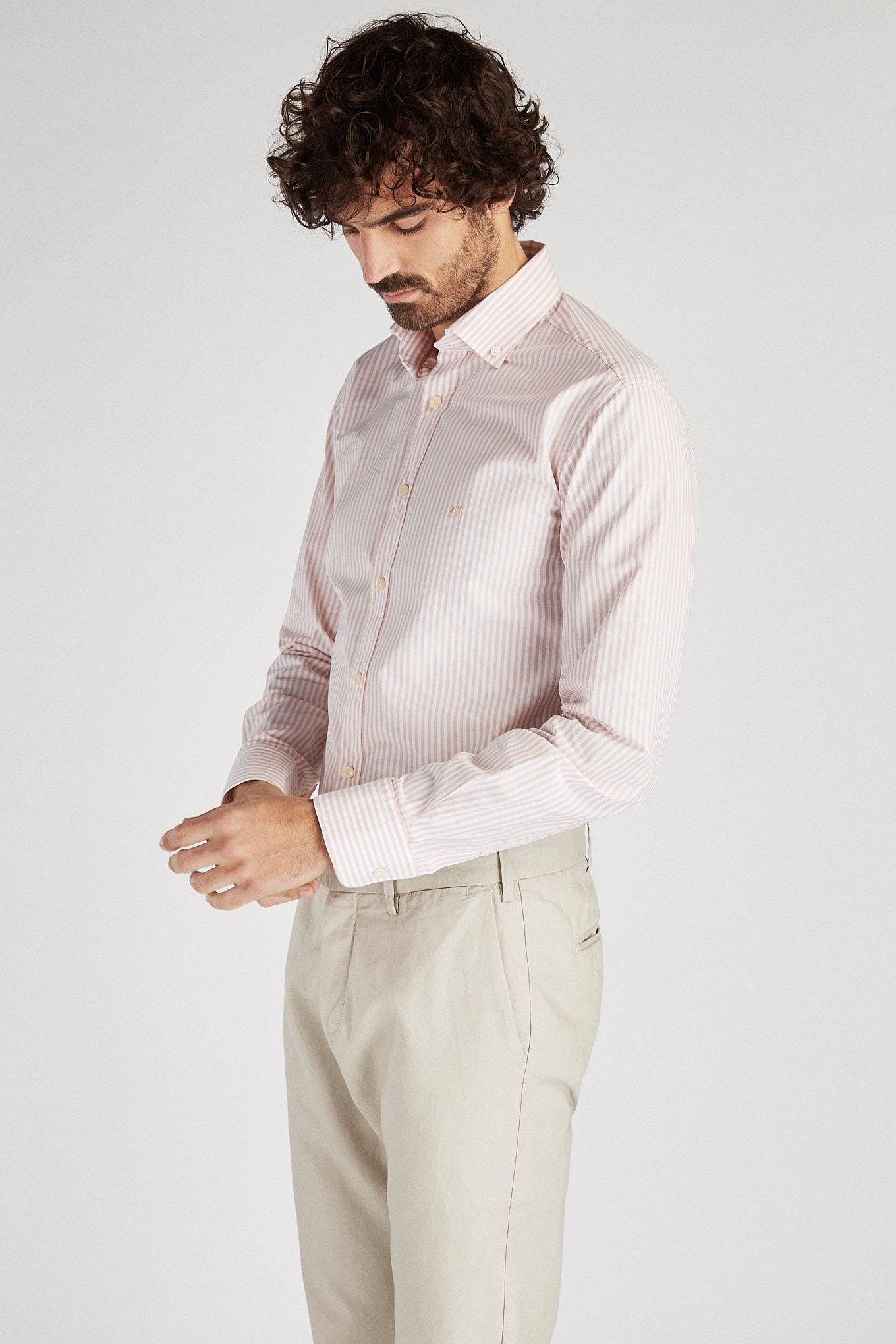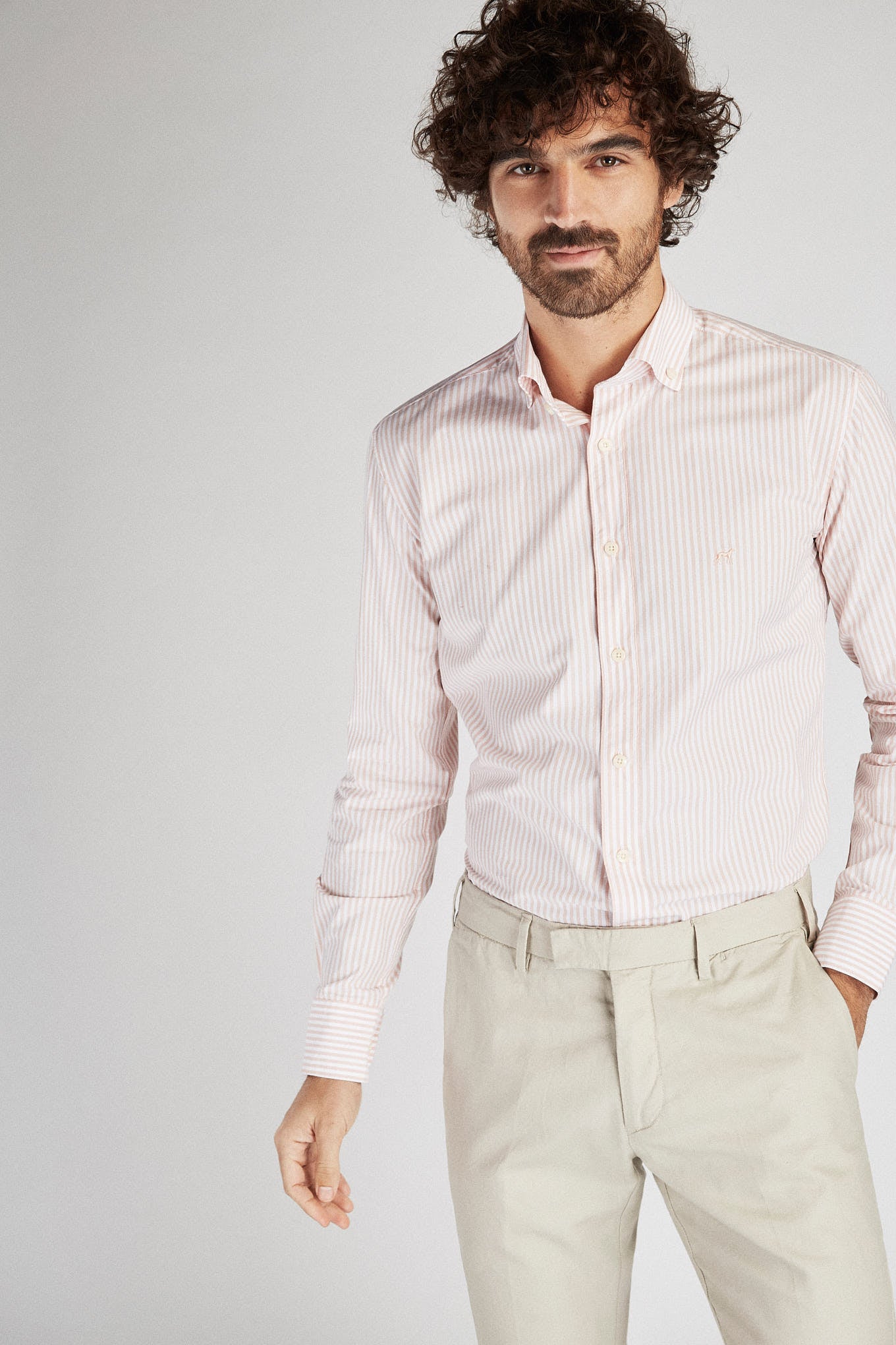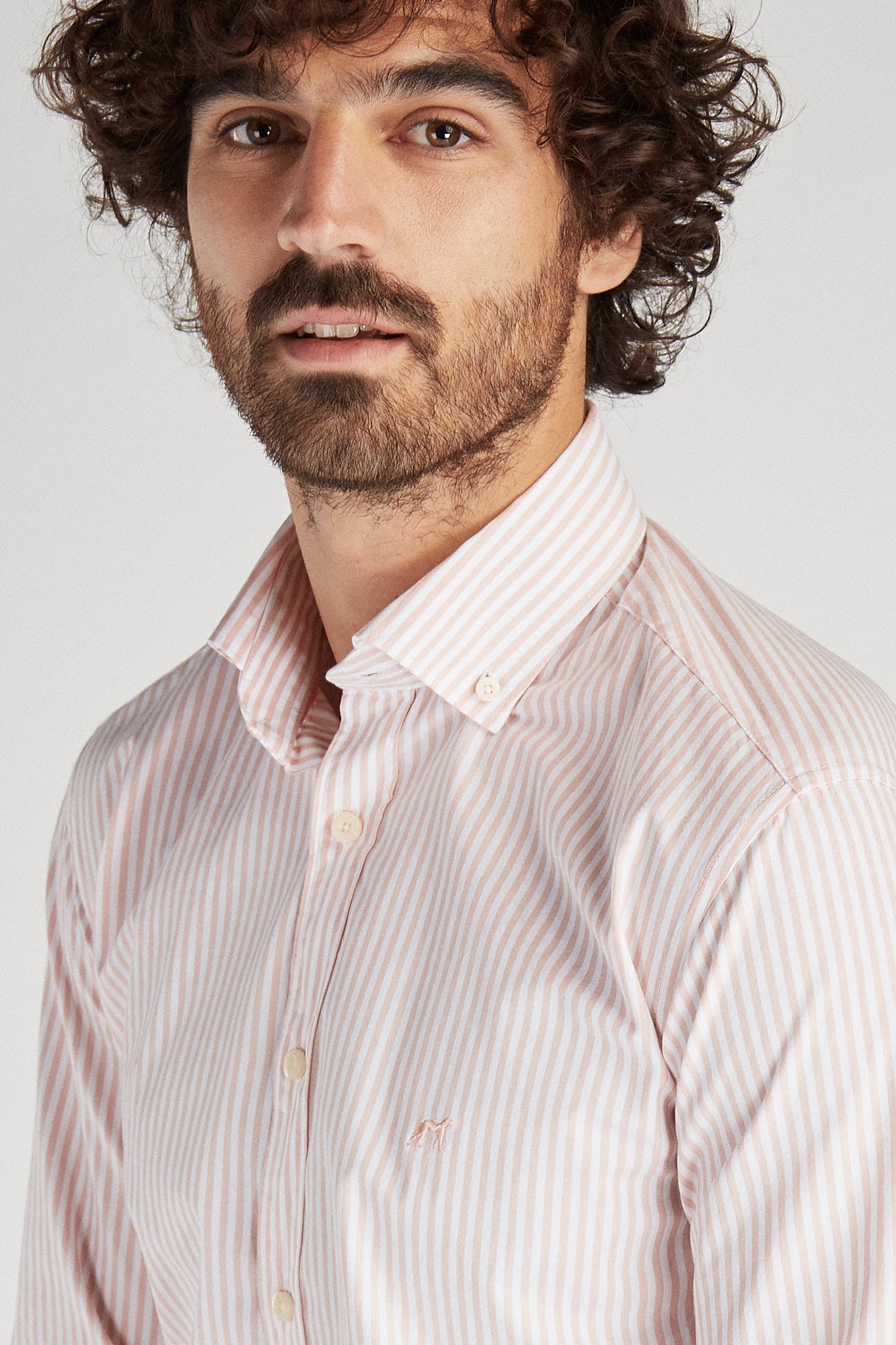 Men's shirt with striped pattern. Open collar with buttons, including on the back. Brand logo embroidered on the chest. English stitching, more comfortable with a quality finish. Side support from triangular seams, with the date 1989 - the year the Sacoor Brothers brand was born. Available at Sacoor Brothers online store. The back length of size 40 is 78 cm and the sleeve length is 66 cm. See our Size Guide.