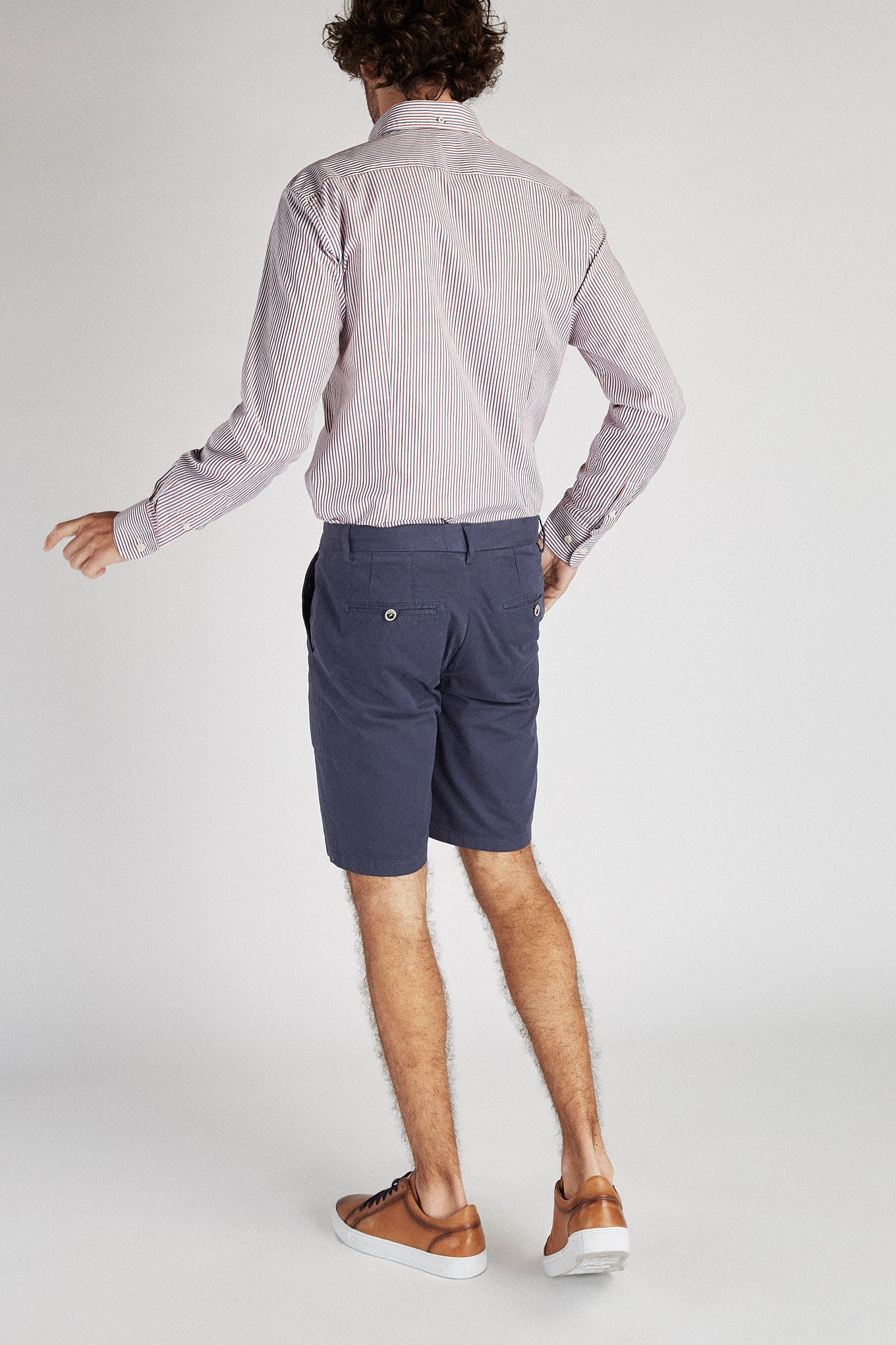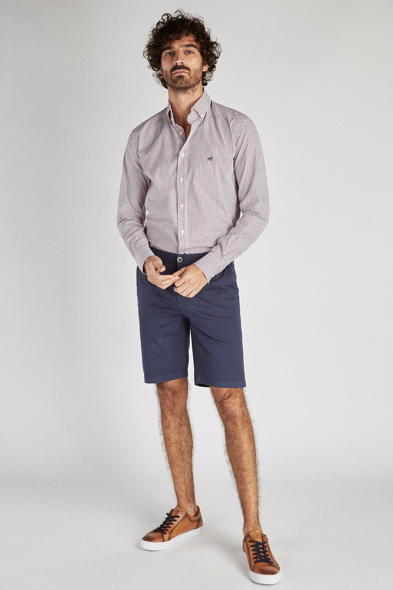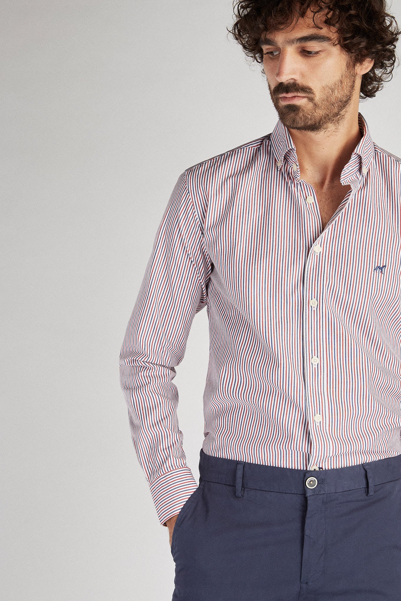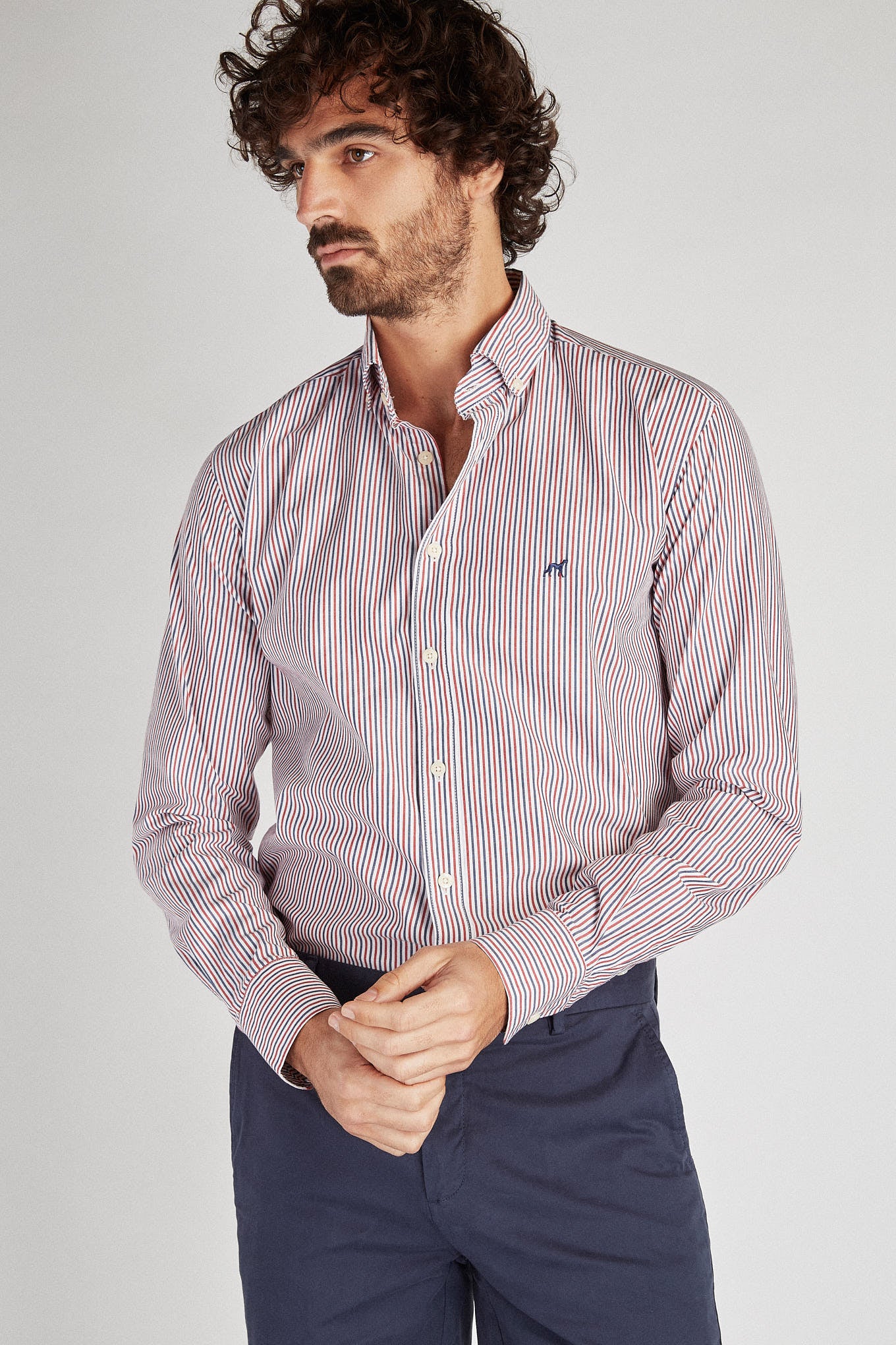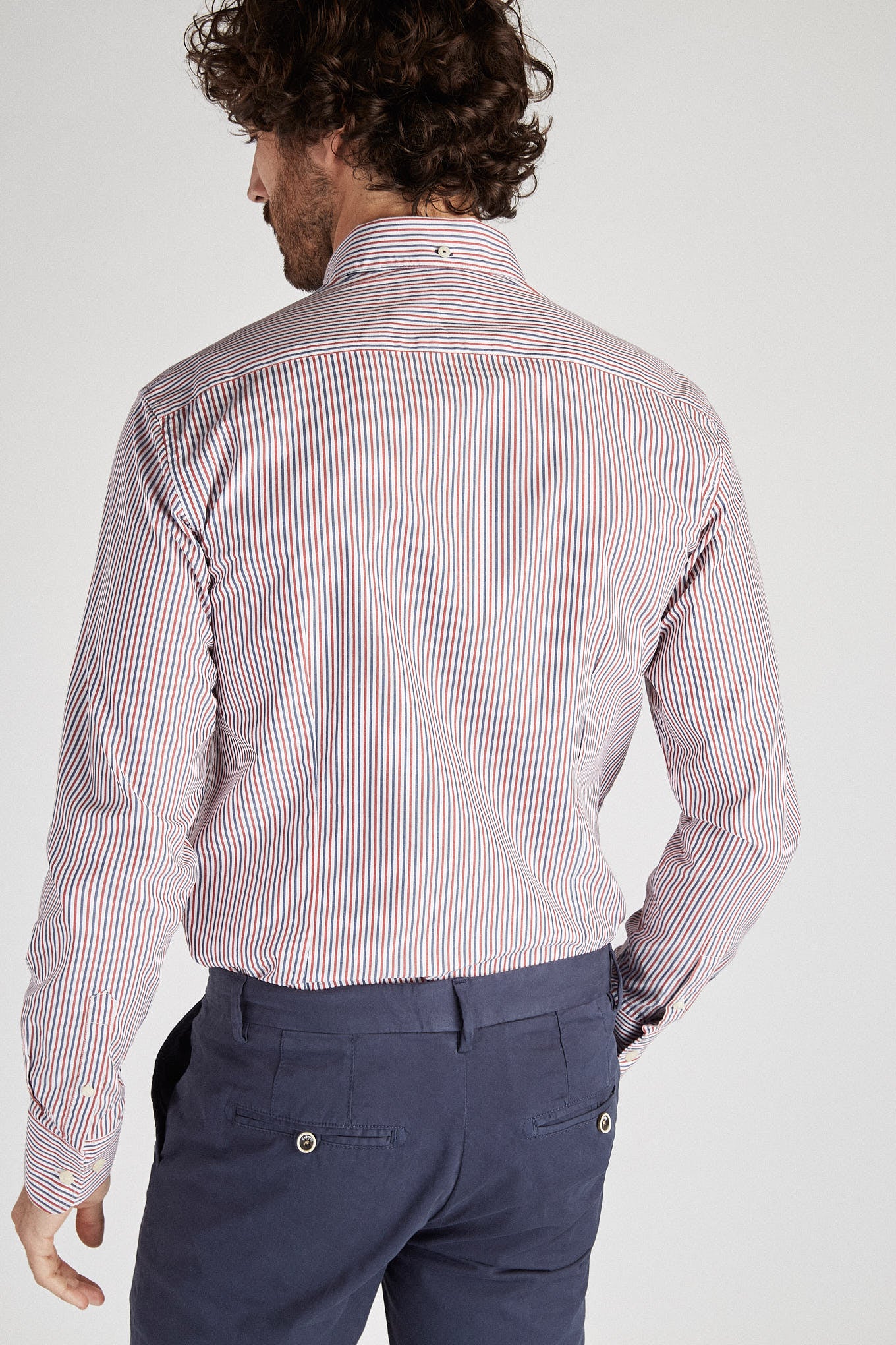 Men's shirt with striped pattern. Open collar with buttons, including on the back. Brand logo embroidered on the chest. English stitching, more comfortable with a quality finish. Side support from triangular seams, with the date 1989 - the year the Sacoor Brothers brand was born. The back length of size 40 is 78 cm and the sleeve length is 66 cm. See our Size Guide.