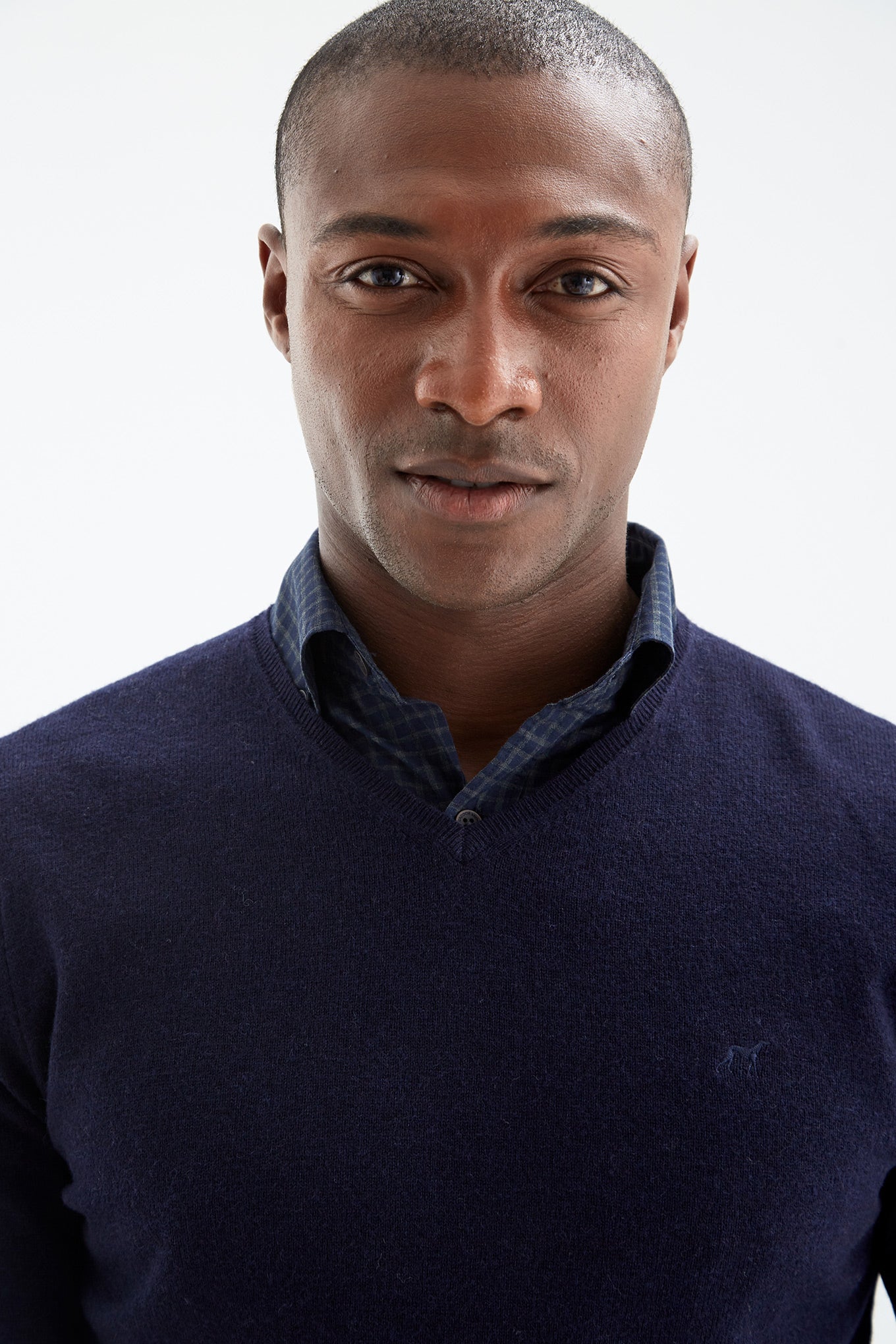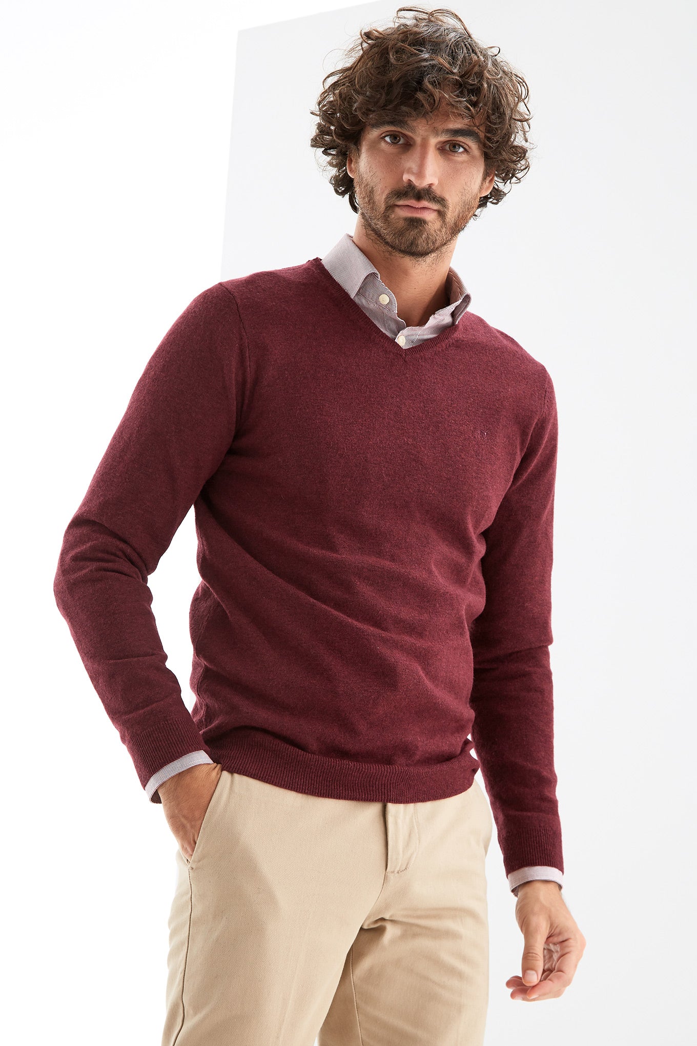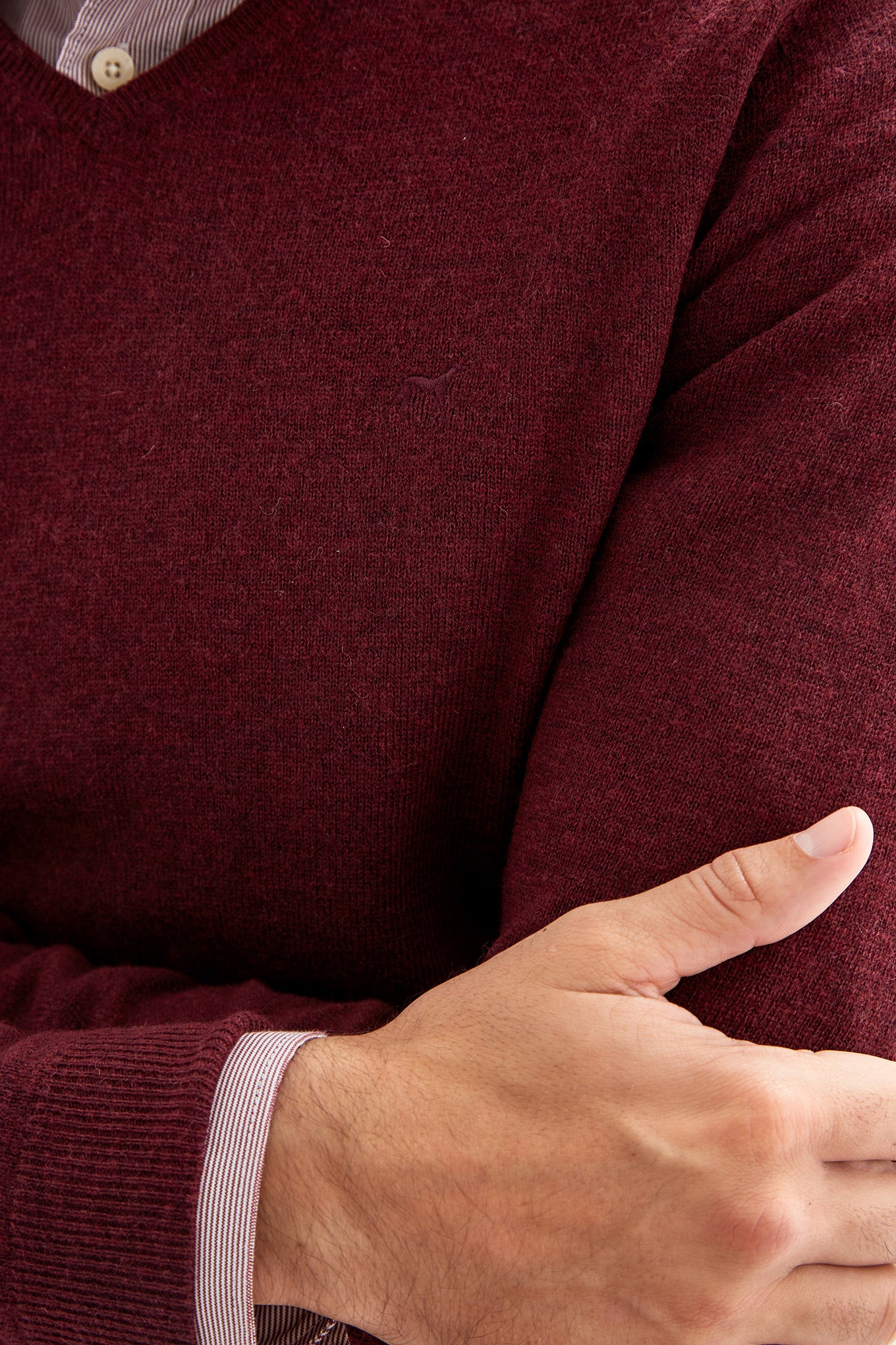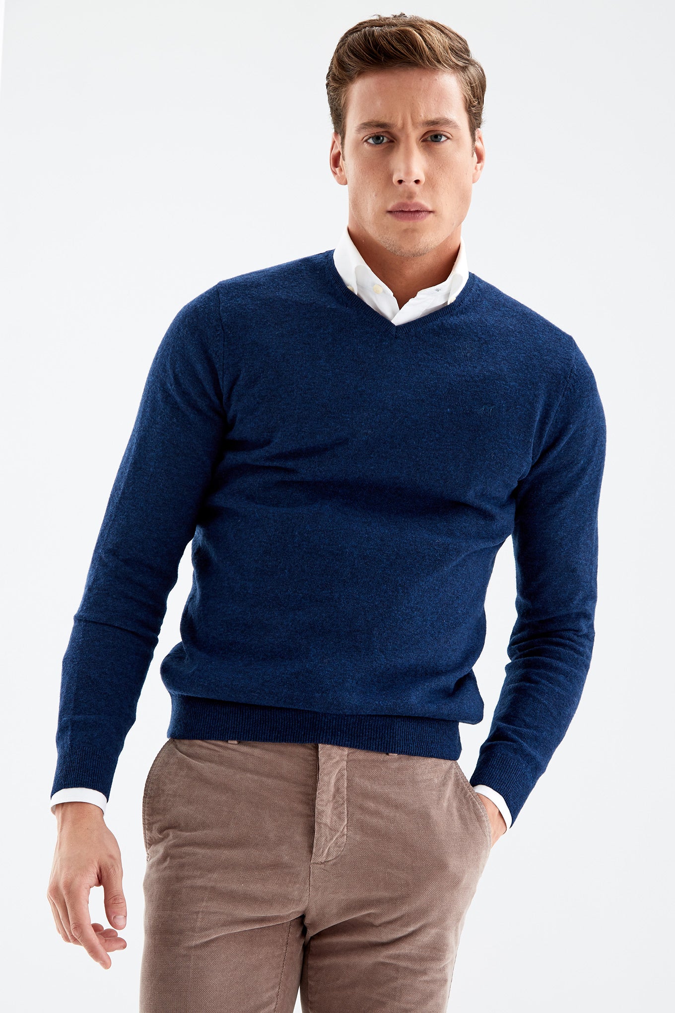 Men's Casual knitted sweater with V-neckine made of lambswool. Embroidered logo on the chest and ribbed trims. Back length on size M is 70cm and sleeve length is 66cm.