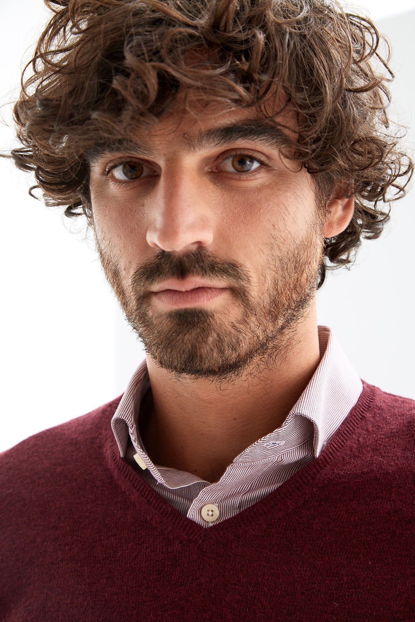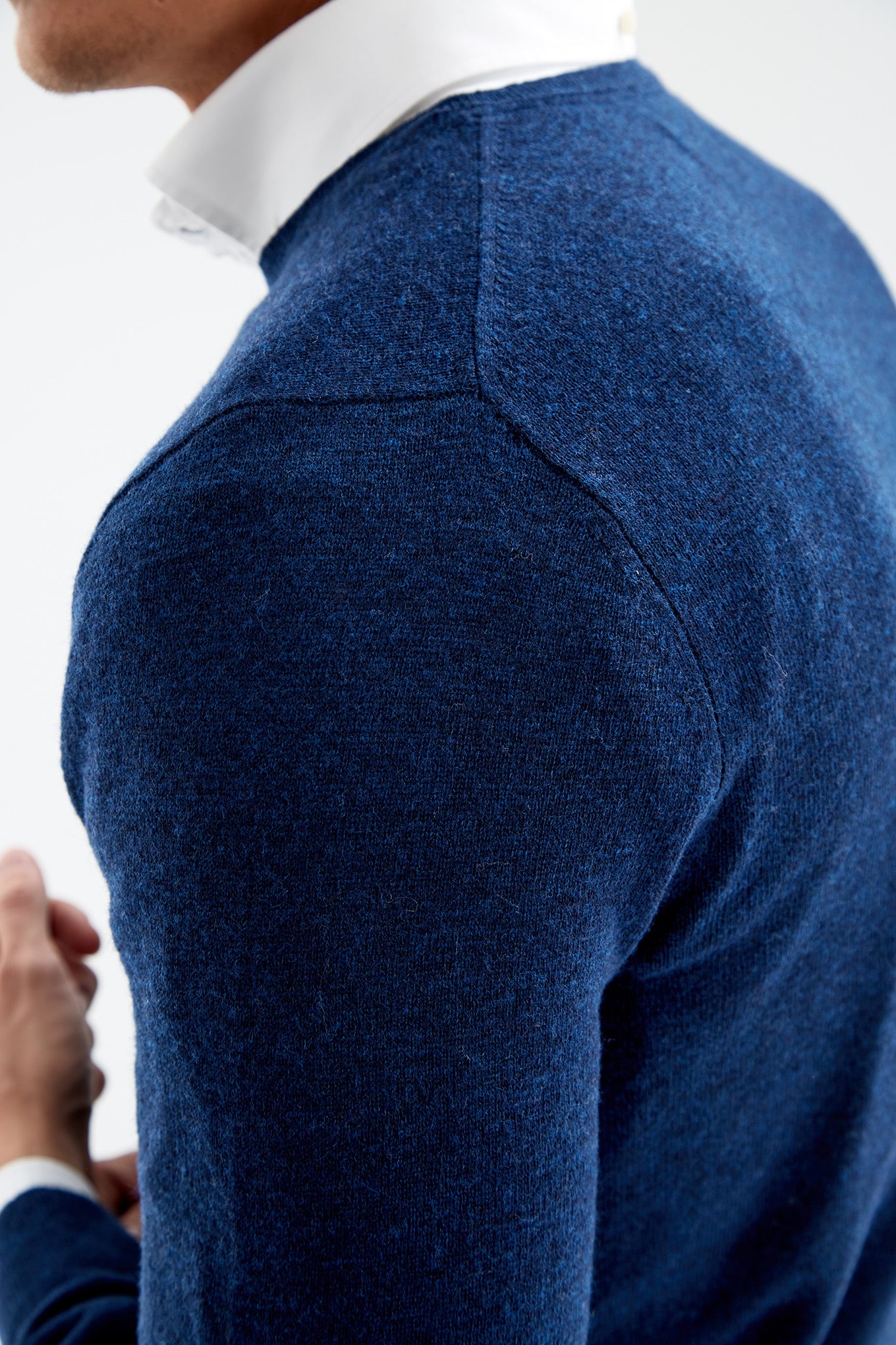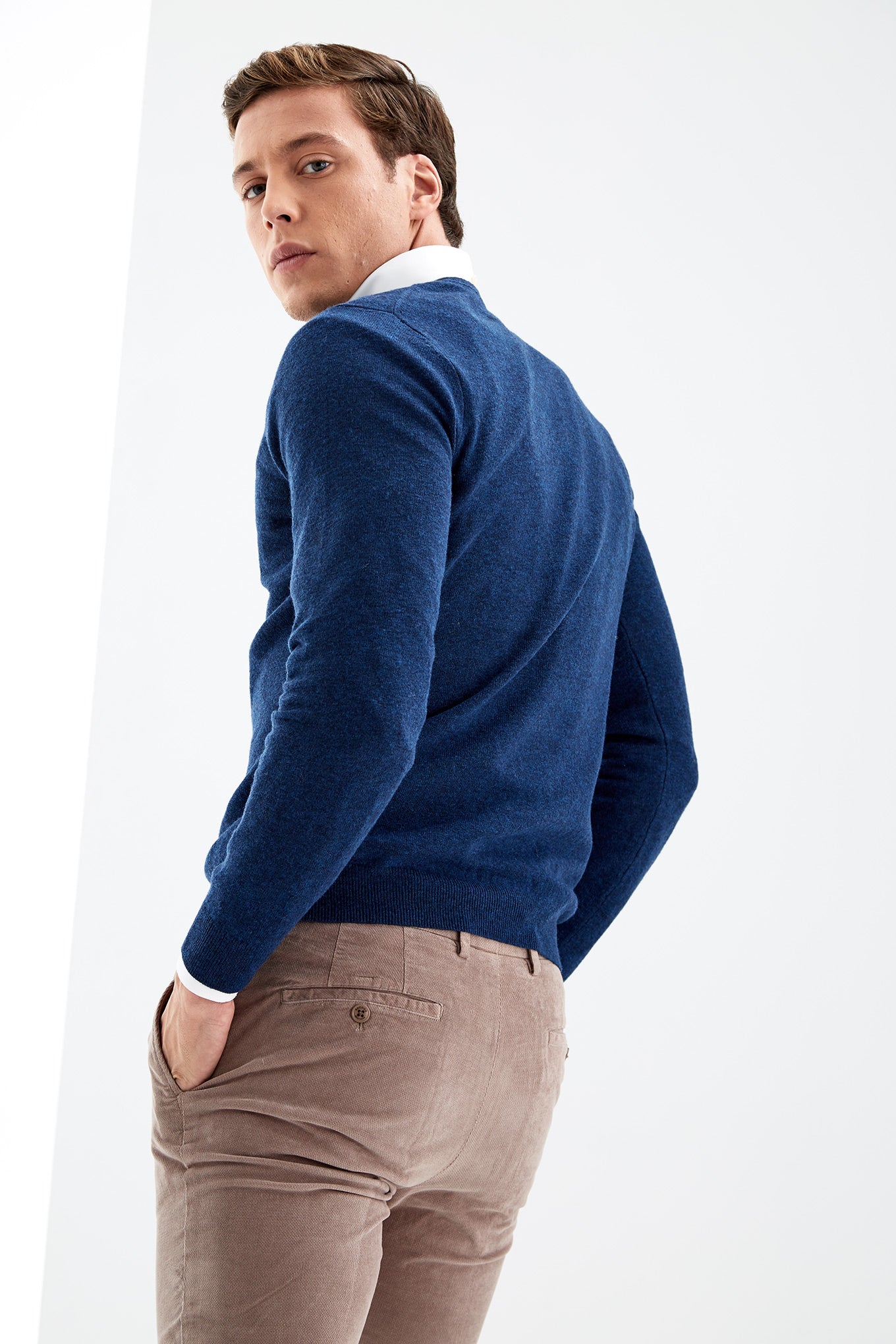 Men's Casual knitted sweater with V-neckine made of lambswool. Embroidered logo on the chest and ribbed trims. Back length on size M is 70cm and sleeve length is 66cm.