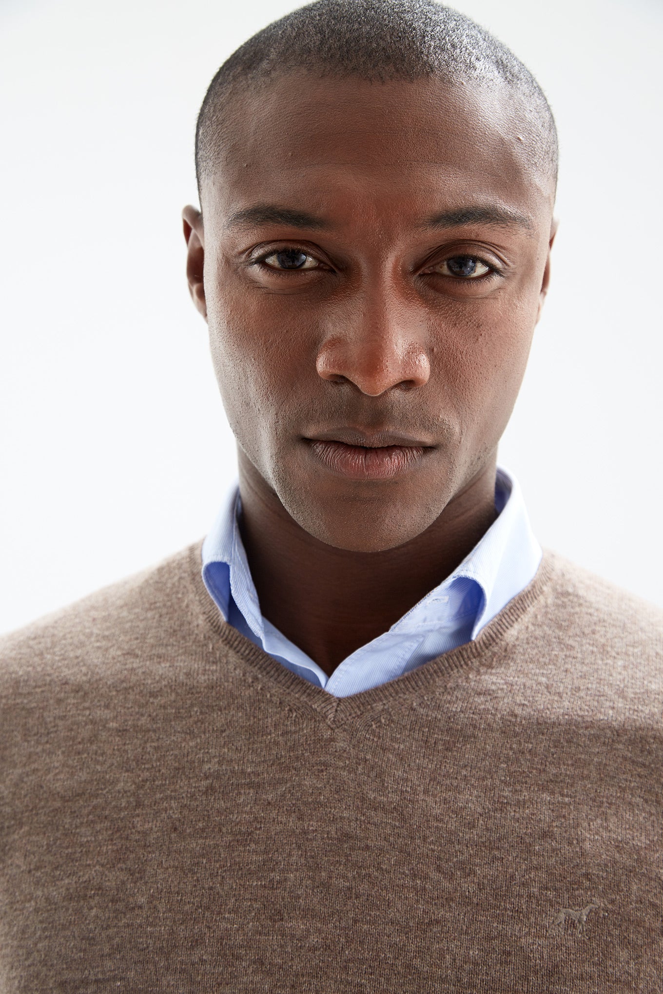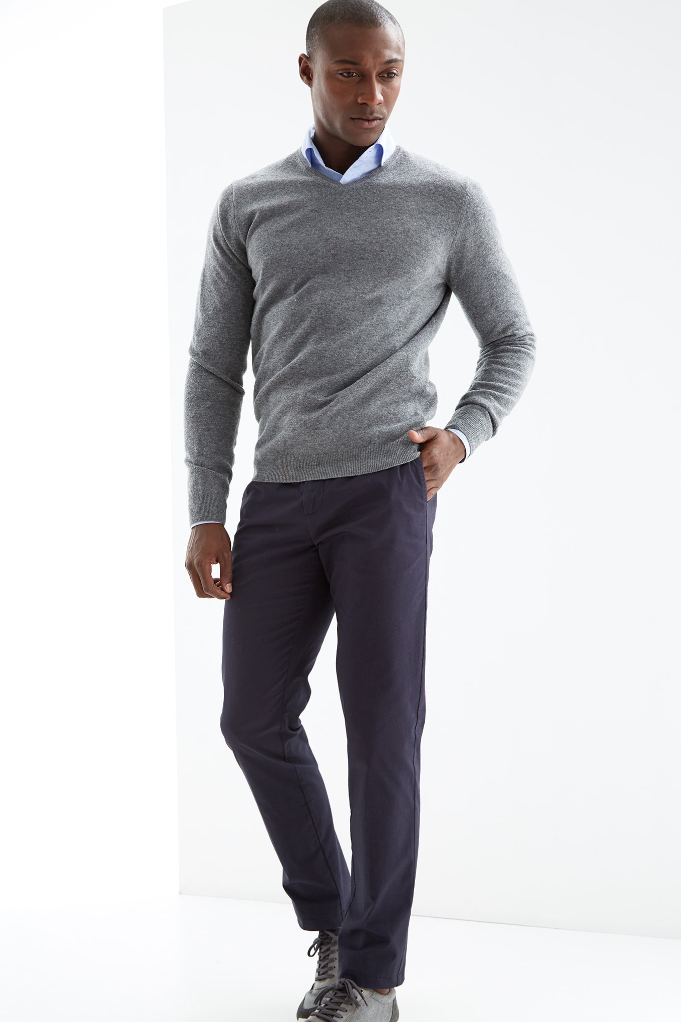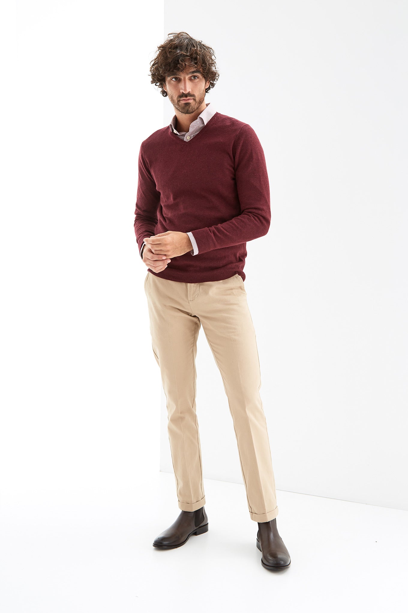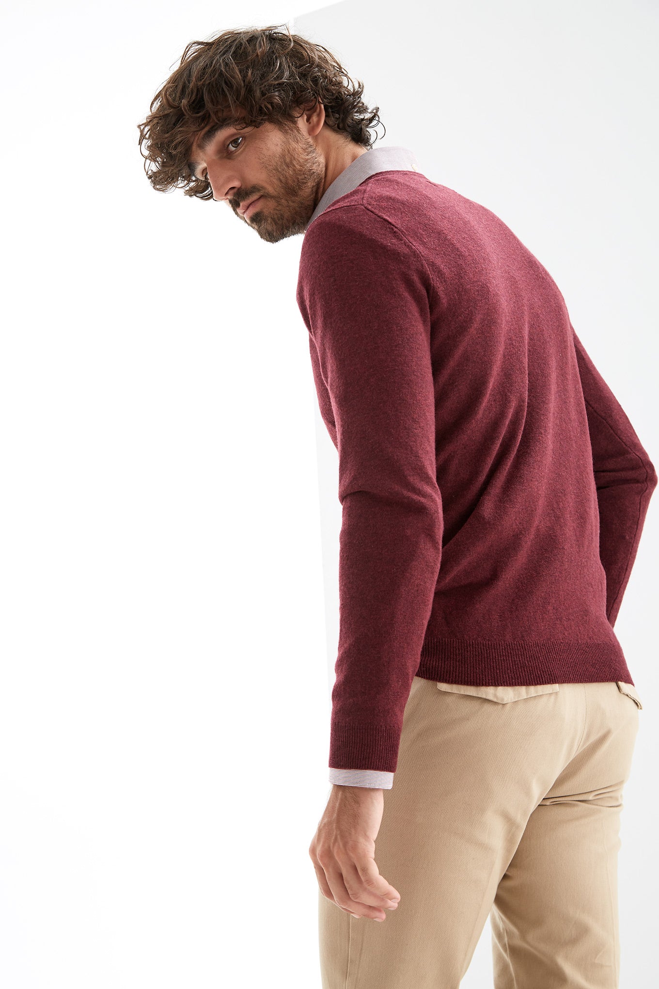 Men's Casual knitted sweater with V-neckine made of lambswool. Embroidered logo on the chest and ribbed trims. Back length on size M is 70cm and sleeve length is 66cm.
